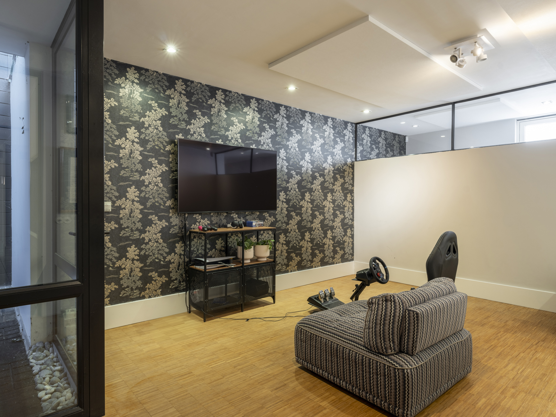 Deze onderverdieping, opgesplitst in twee delen, is te bereiken via de centrale hal respectievelijk via de werkkamer in de zijvleugel. Hier wordt onder meer gesport in de fitnessruimte, gewassen in de was-/linnenkamer en naar films gekeken of gegamed in de tv-kamer. In dit deel treft u ook de technische ruimte.