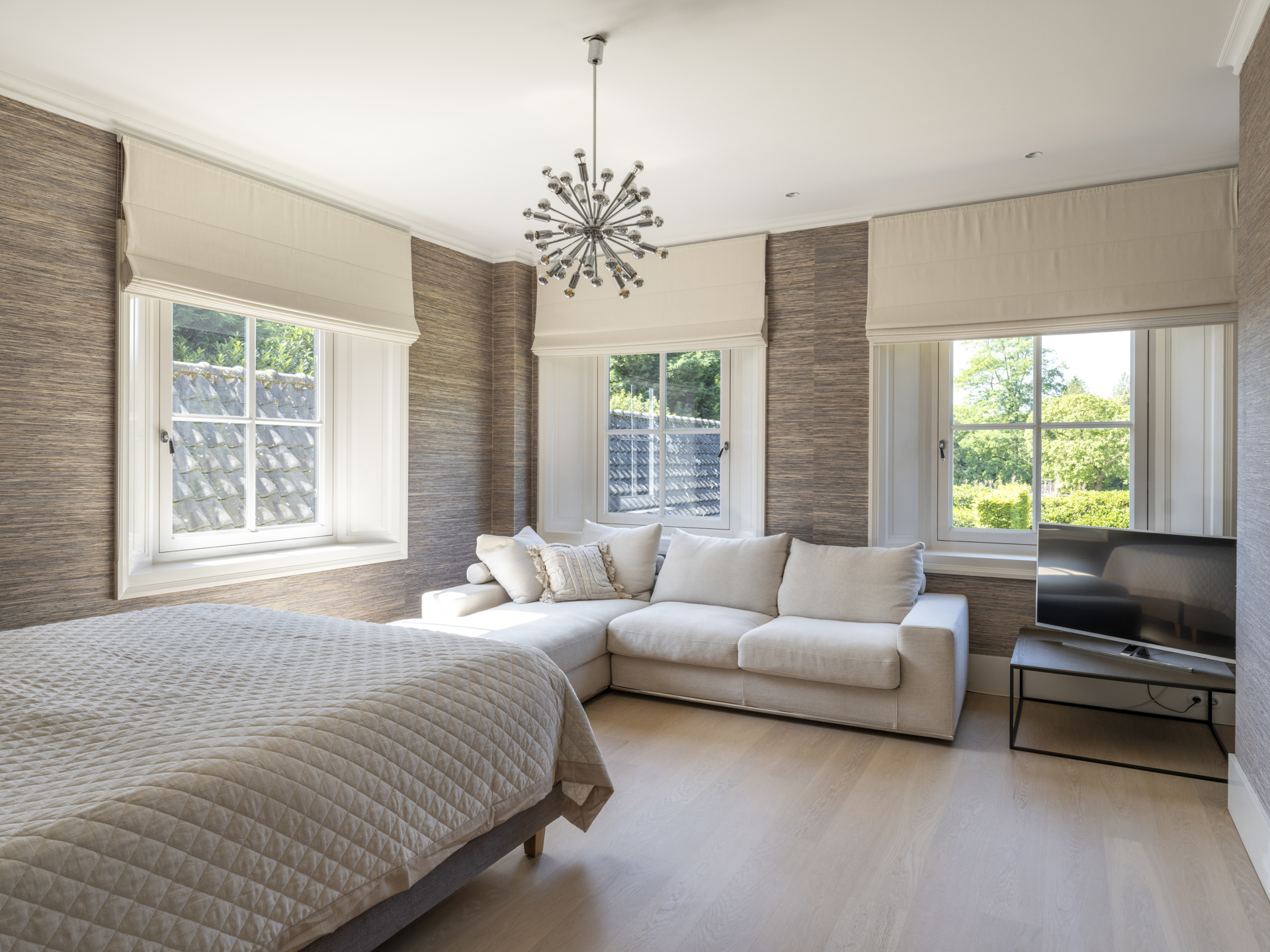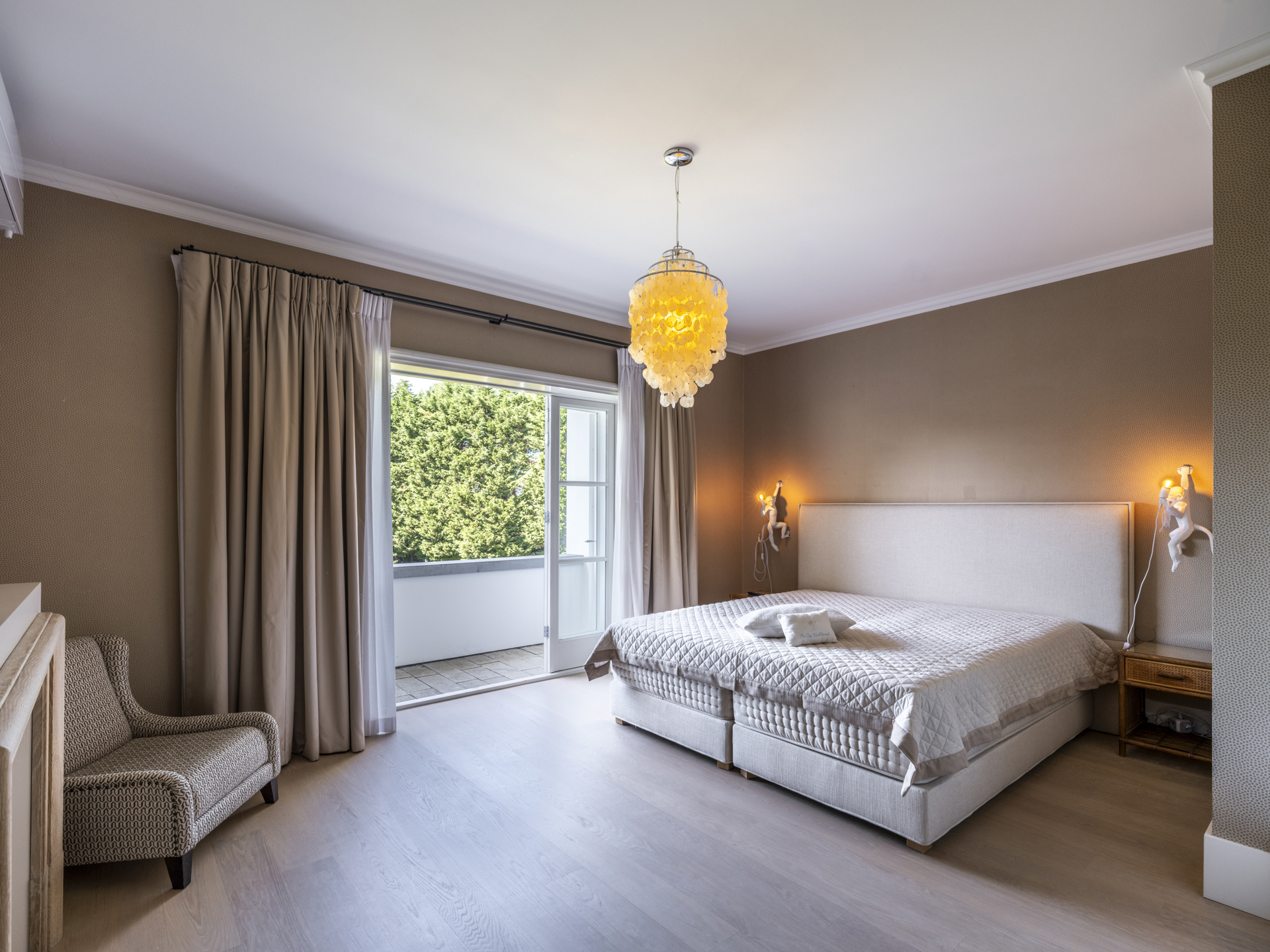 Via een brede trap en ruime overloop is de masterbedroom (met balkon en uitzicht op de tuin) te bereiken. De naastgelegen dressingroom staat in open verbinding met de ouderbadkamer.
