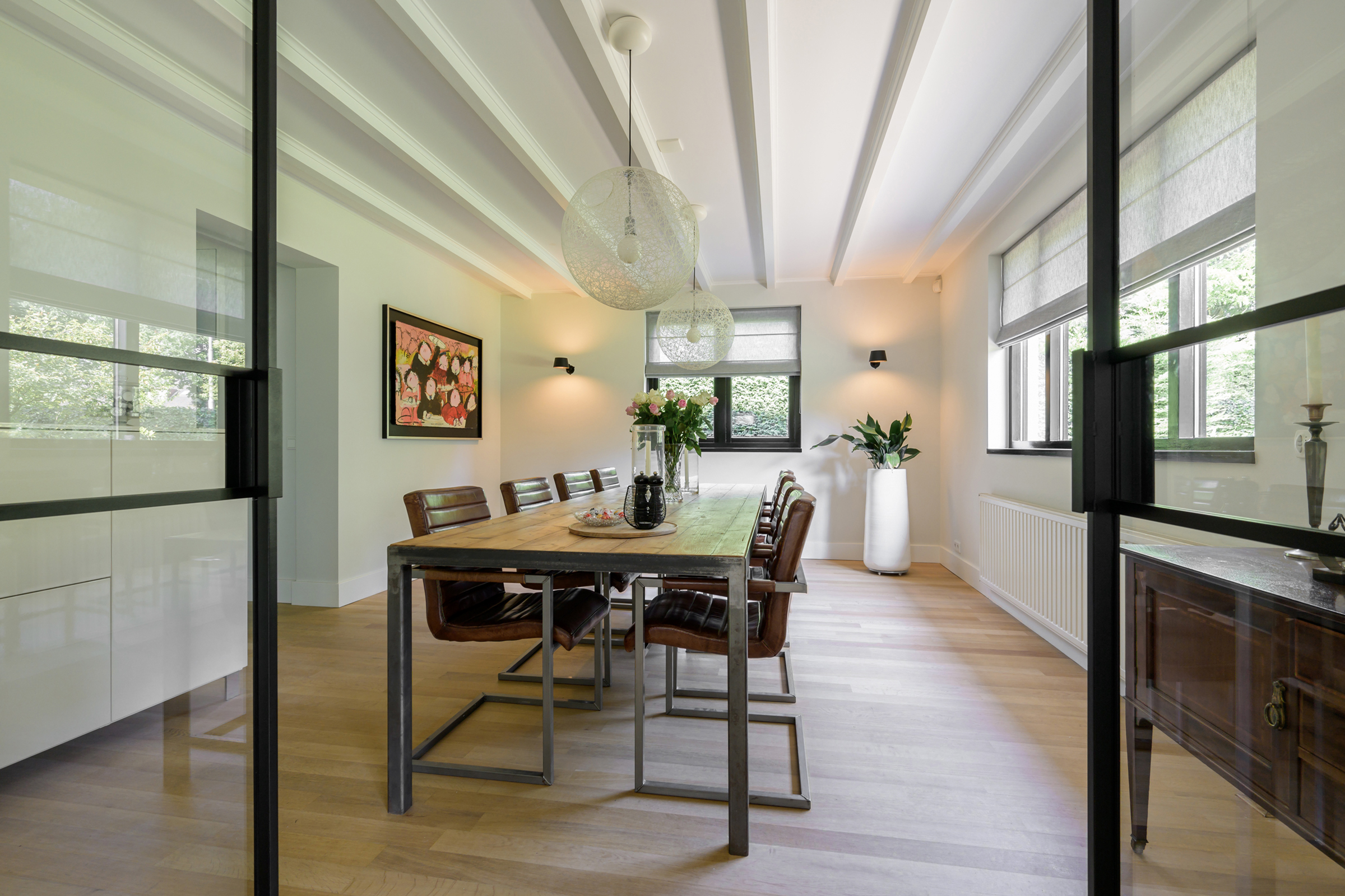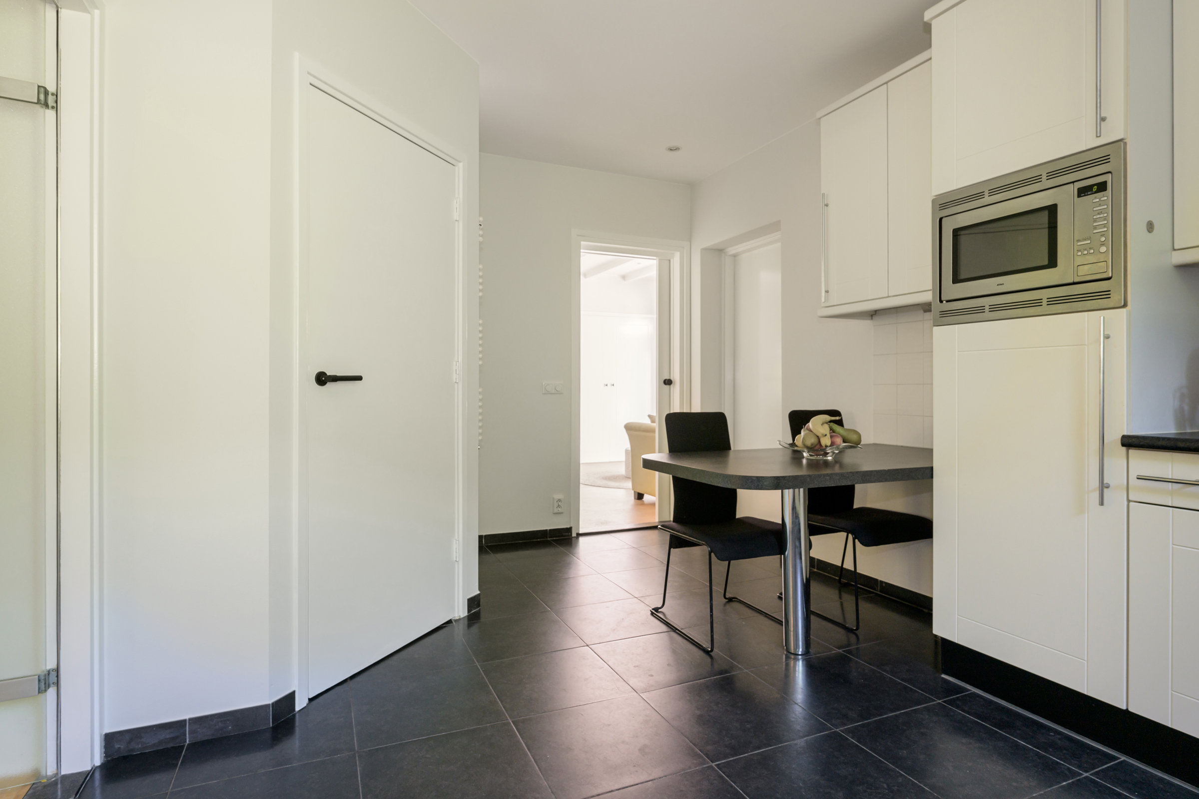 Vanuit de zitkamer heeft u via glazen deuren eveneens toegang tot de eetkamer. Vanuit de eetkamer heeft u toegang tot de keuken.