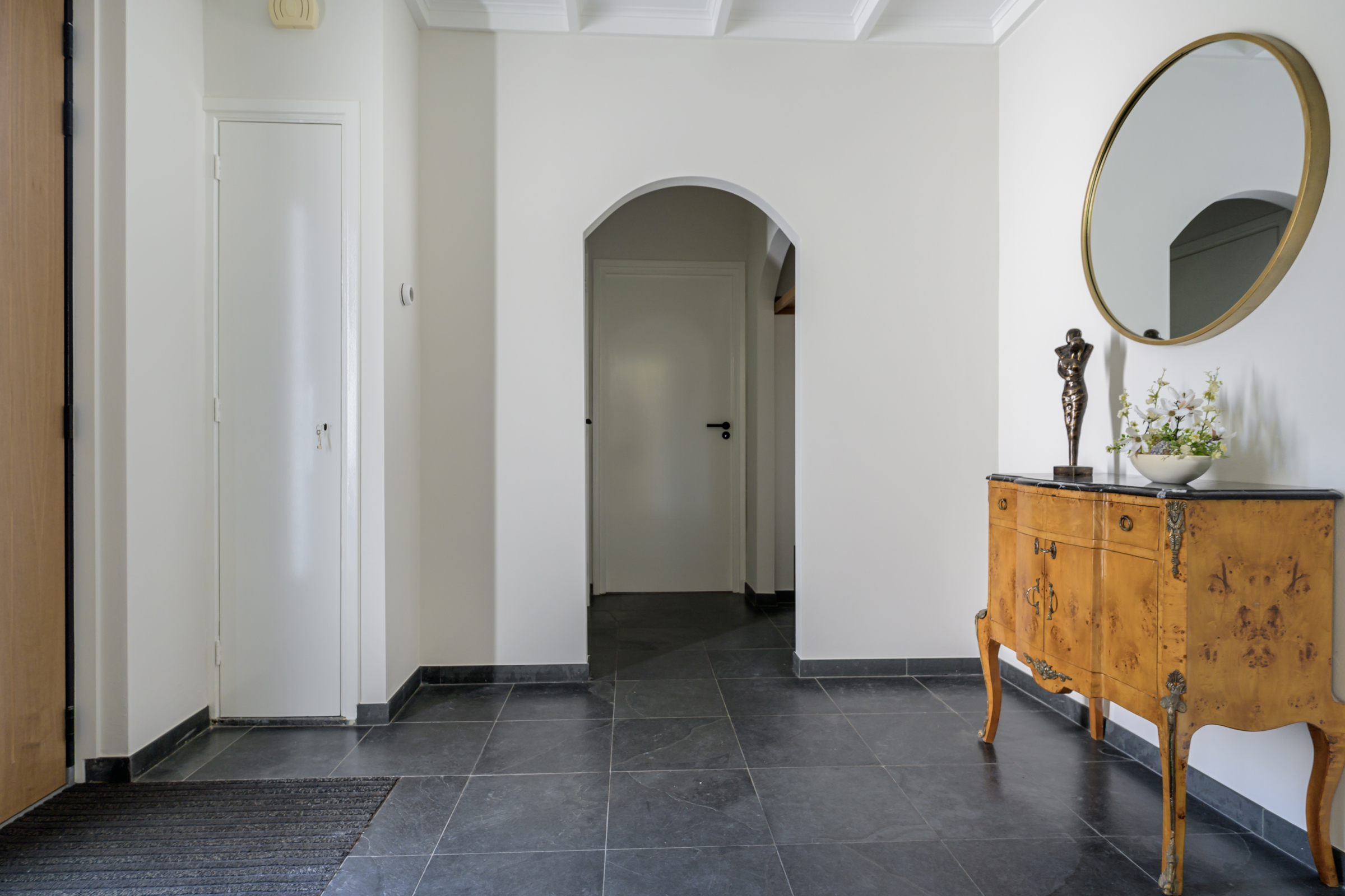 U betreedt de woning via de ruime entree, welke is voorzien van een leistenen tegelvloer. In de hal treft u de meterkast (16 groepen + 2 aardlekschakelaars en voorziening tbv een elektrische auto) en de garderobe.