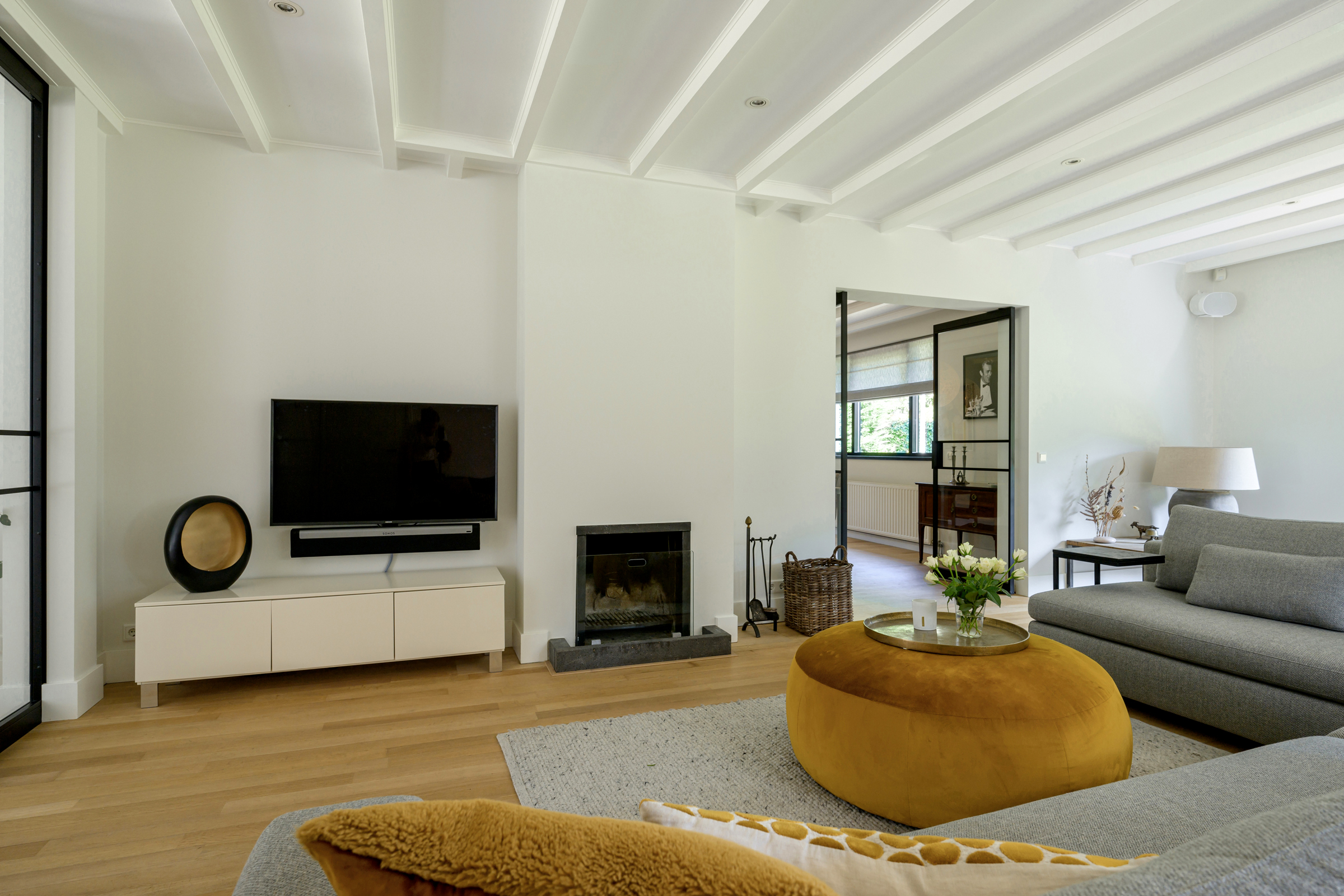 • De woning is deels voorzien van een sfeervol balkenplafond (waartussen glad stucwerk) met inbouwverlichting.