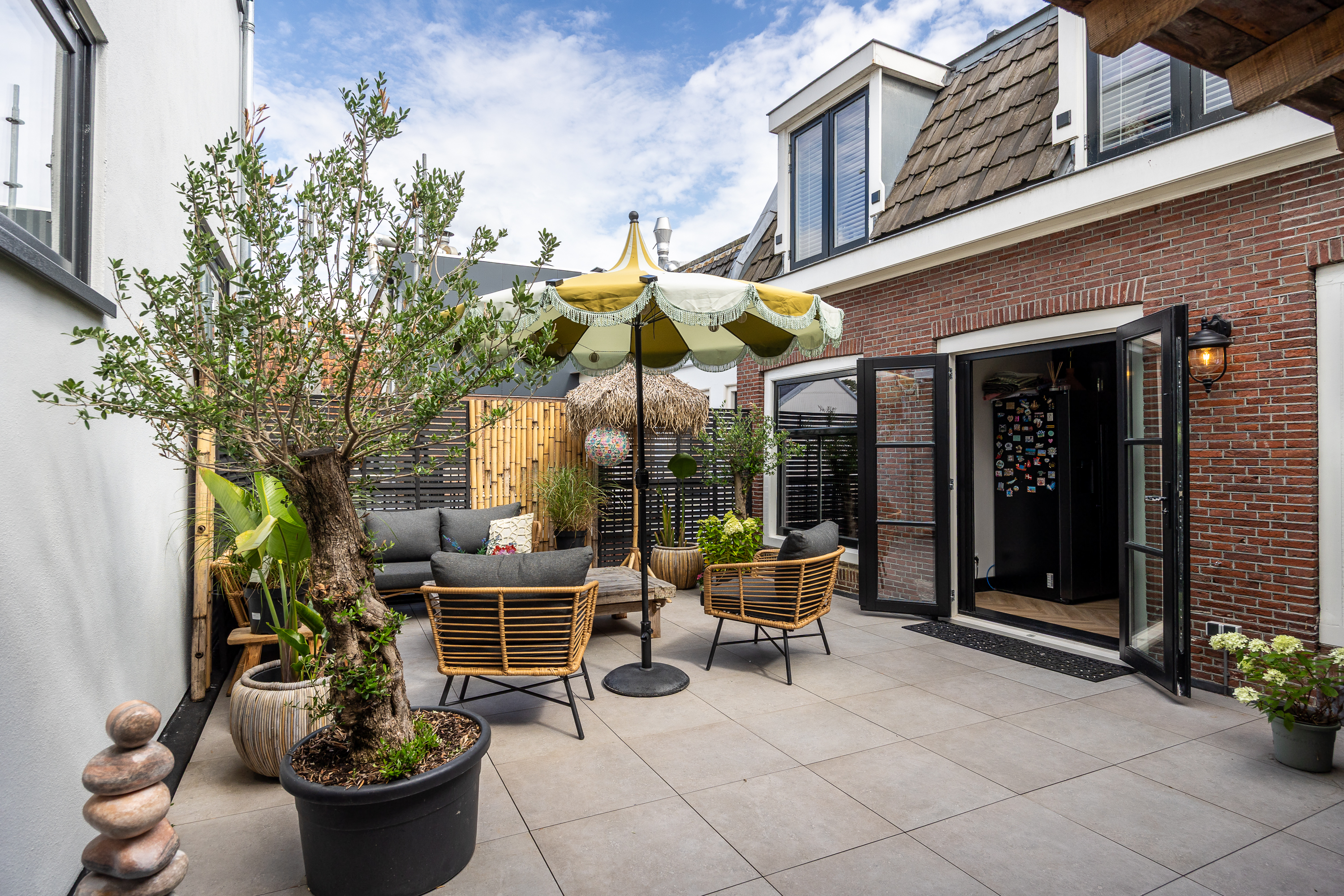 Via een tussenruimte, voorzien van inbouwkasten en plek voor een extra koelkast, stap je zó dakterras op. Dit ruime zonnige terras is volledig betegeld en voorzien van een sfeervolle overkapping, een vaste bank en op maat gemaakte tafel. Hier ervaar je volledige rust en privacy, midden in het centrum. Een heerlijk buitenverblijf, perfect voor diners, borrels of een kop koffie in de ochtendzon.