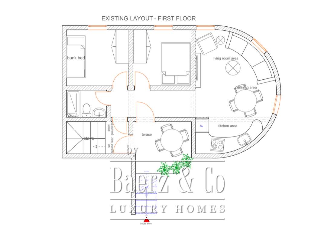 Deze woning is verdeeld over drie woonlagen, elk met een zelfstandig appartement van 50 vierkante meter. De stenen gevel weerspiegelt het lokale architecturale erfgoed en past harmonieus in de omgeving. Er is privéparkeergelegenheid voor twee auto's en een directe asfaltweg garandeert een soepele aankomst, terwijl de entree op de eerste verdieping extra beschutting biedt.