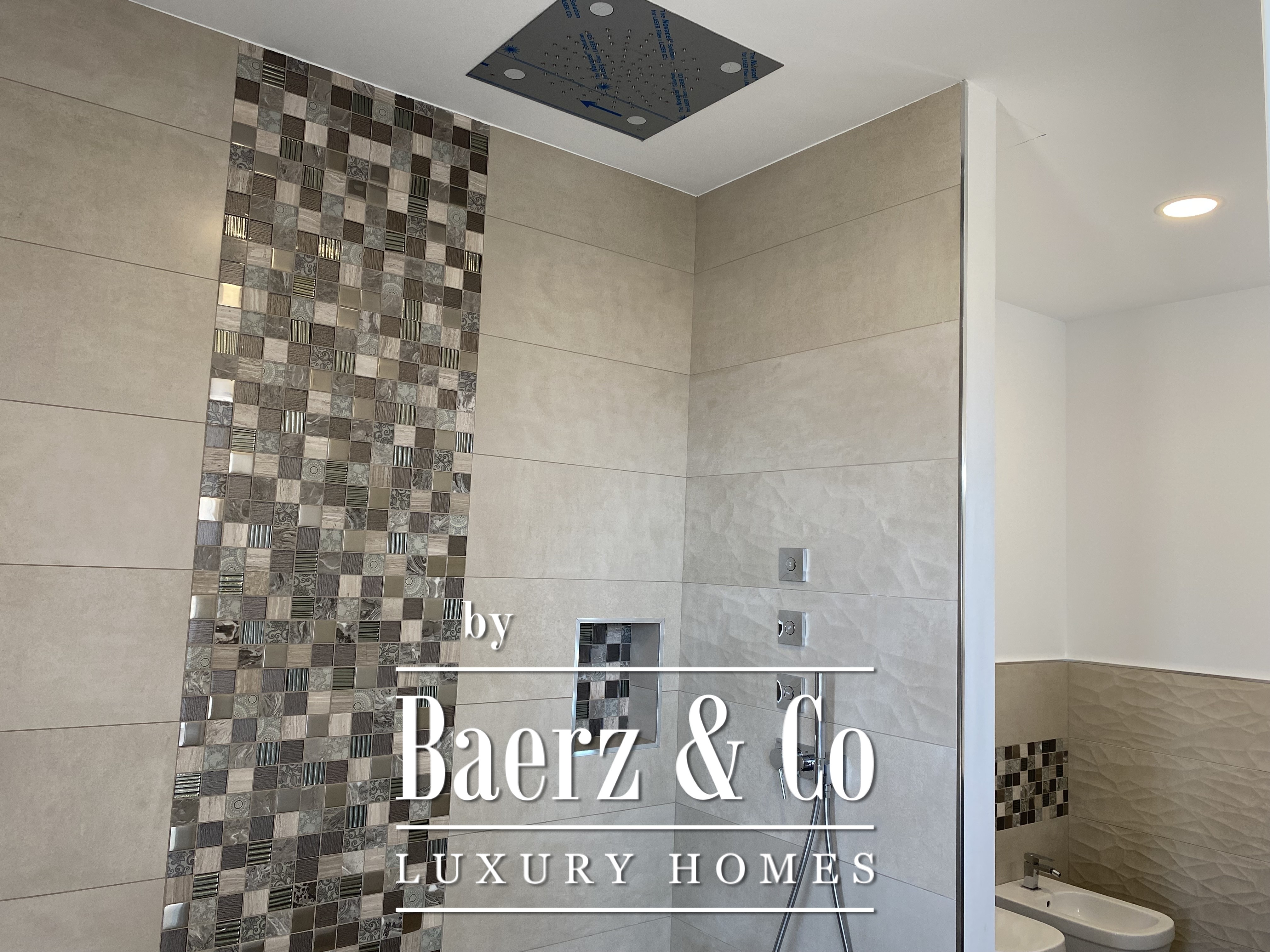 De douches zijn ingebouwd in het plafond en voorzien van chromotherapie.