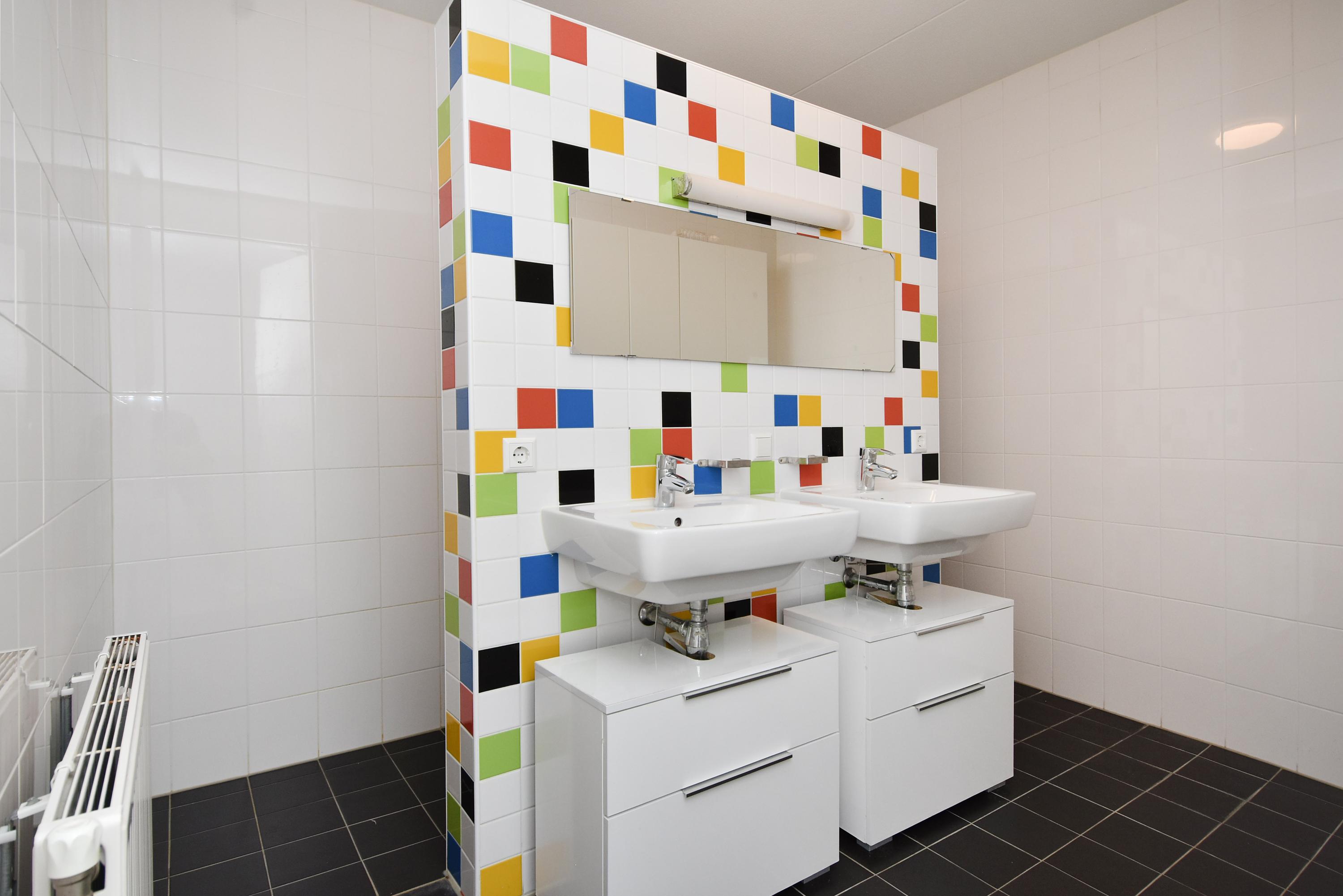 De tweede badkamer is modern en beschikt over een wastafel, een ruime inloopdouche en een derde toilet.