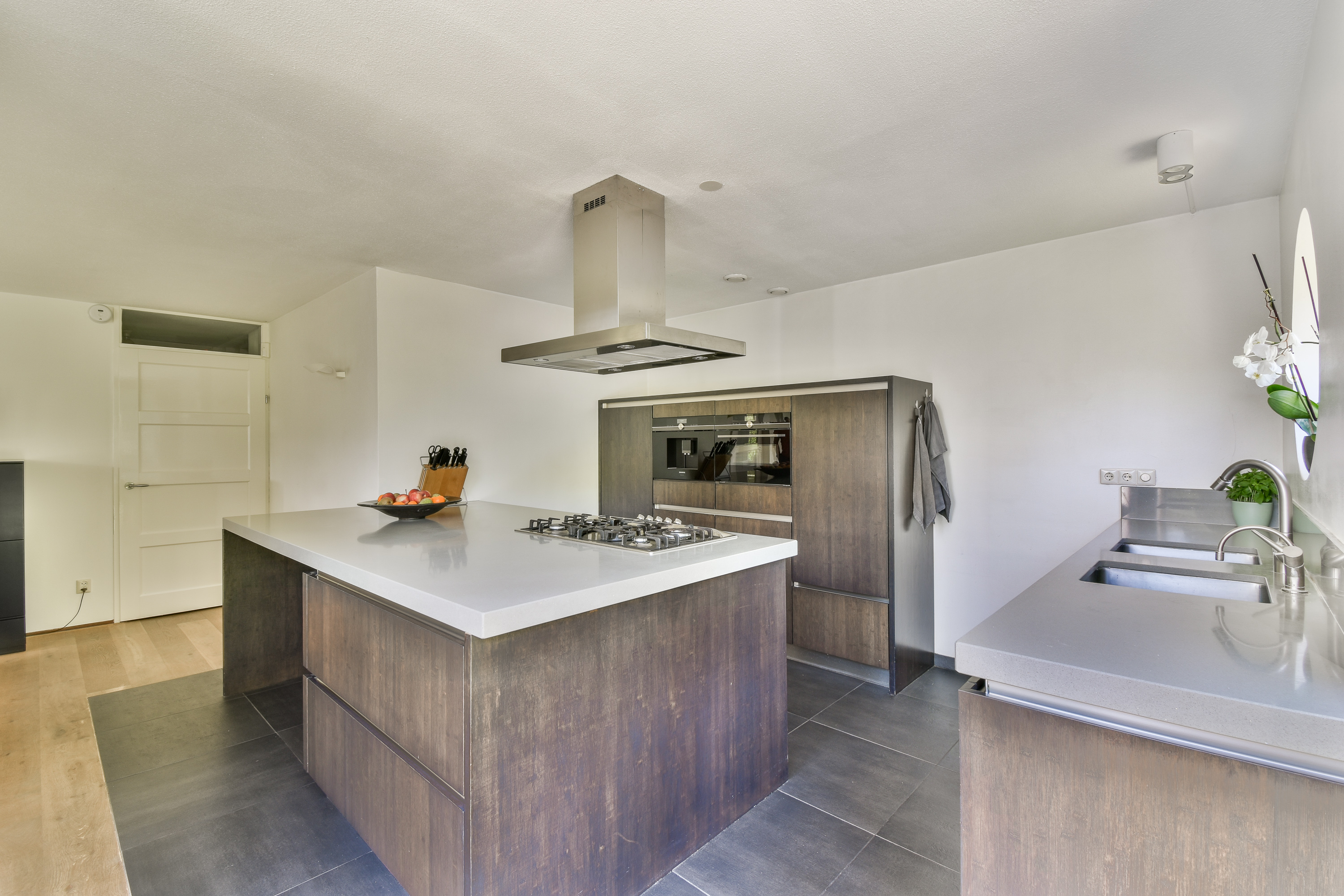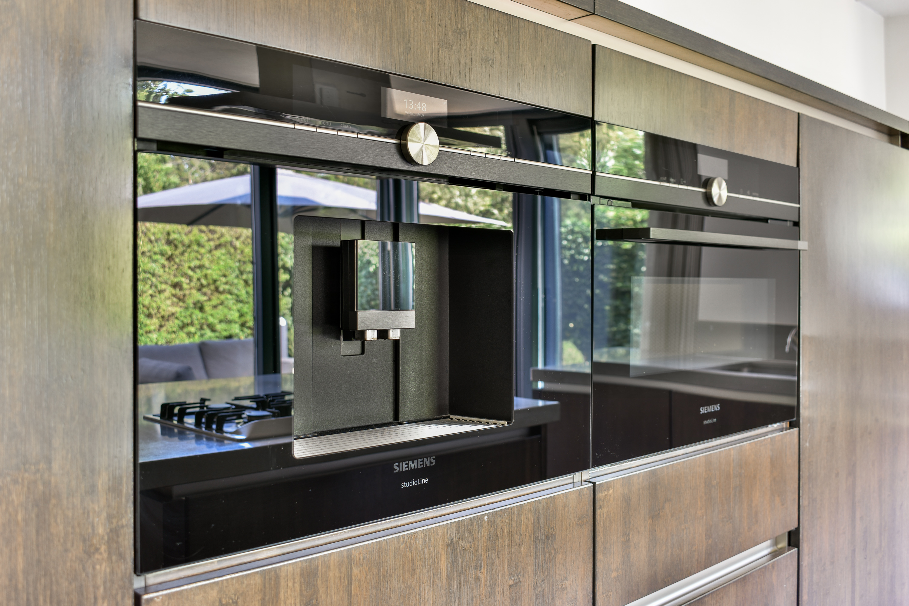 De luxe open keuken is voorzien van een groot werkblad annex eetbar, een dubbele spoelbak en diverse inbouwapparatuur, te weten: een Quooker, 5-pits gaskookplaat, afzuigkap, een combi-oven, een inbouw koffiemachine, vaatwasser, vriezer en koelkast. Ook vanuit de keuken is er een directe toegang tot het terras en de tuin.