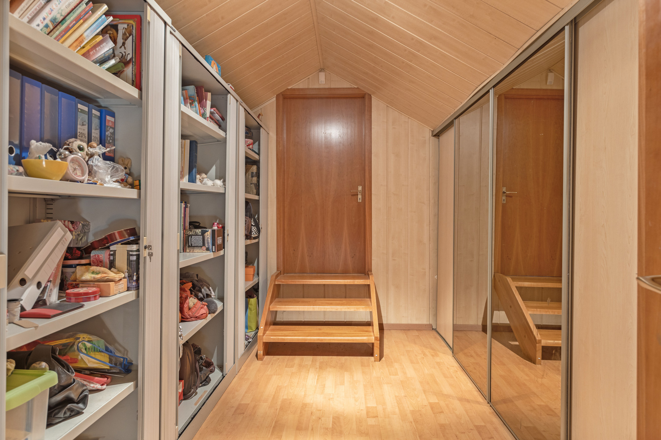 De in 2001 toegevoegde verdieping herbergt een grote slaapkamer, perfect als master suite of thuiskantoor. Twee ruime kapellen zorgen voor een aangename lichtinval. De verdieping beschikt verder over op maat gemaakte kasten en een bergkamer met dakkapel, met potentieel voor uitbreiding naar extra slaapkamers of een badkamer.