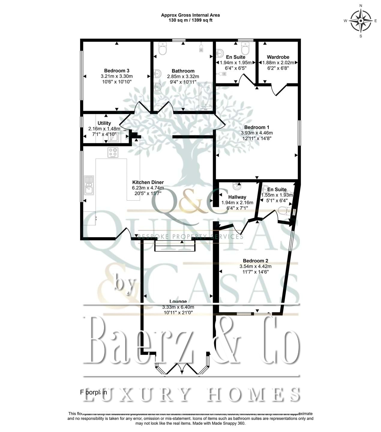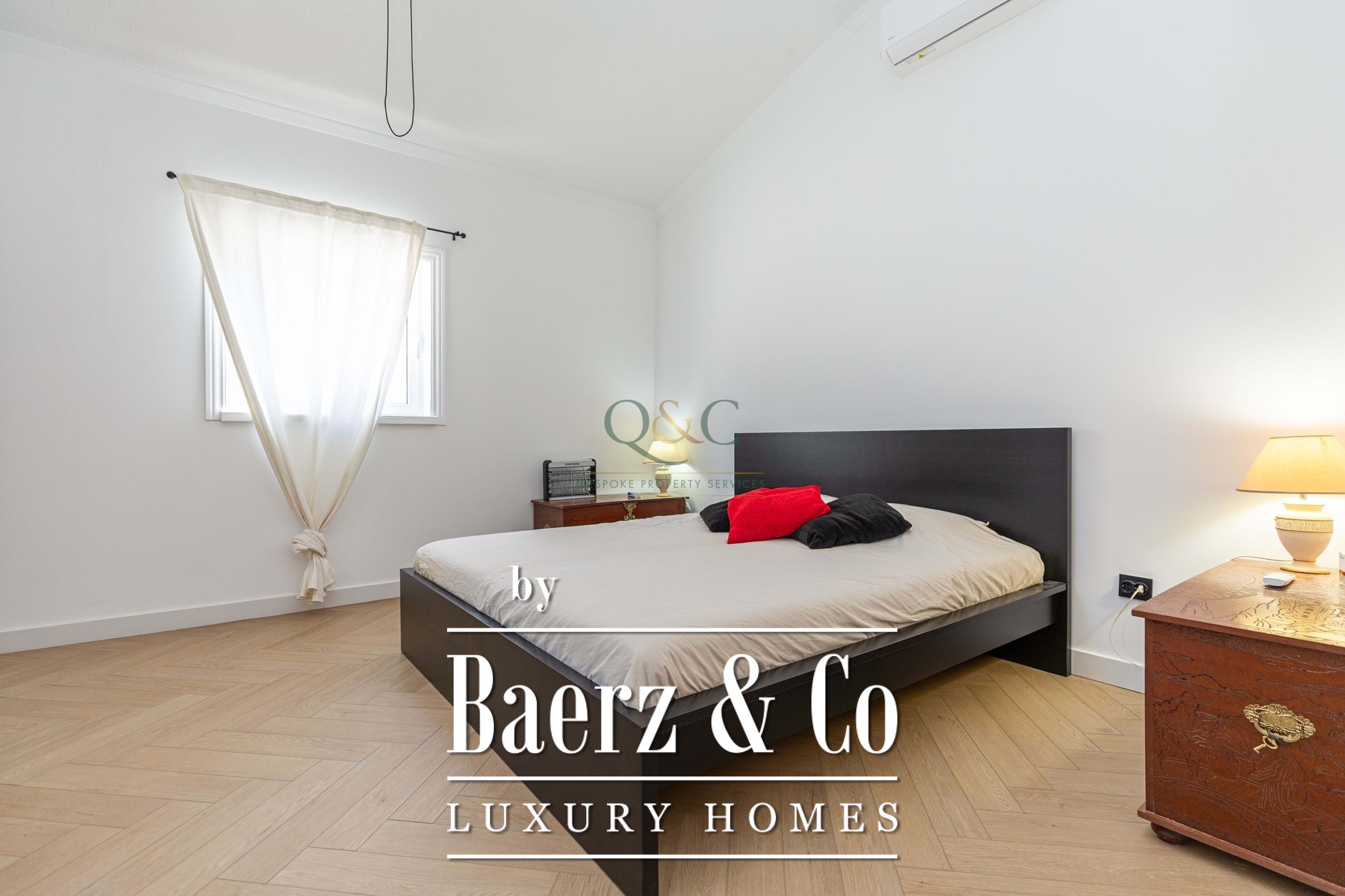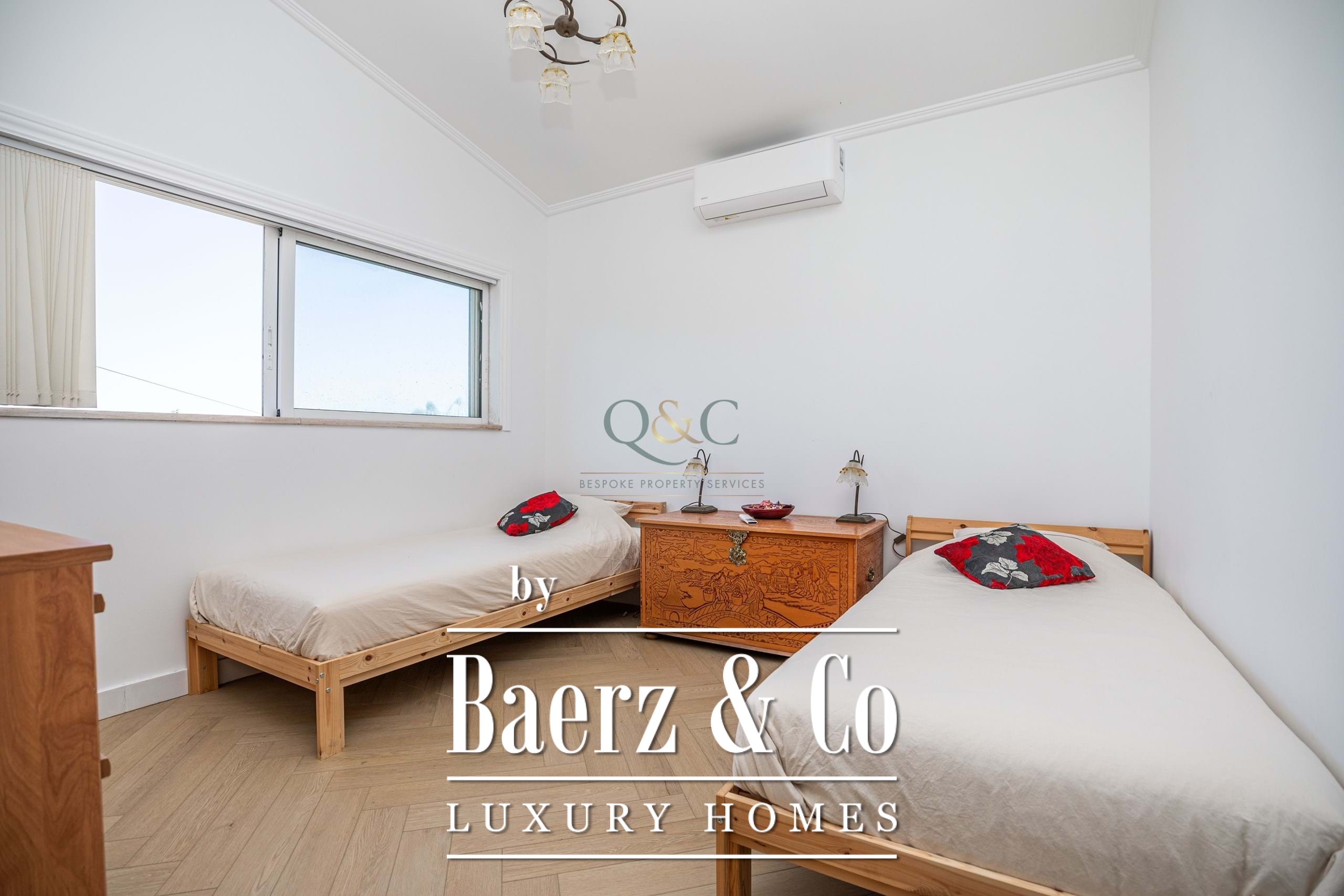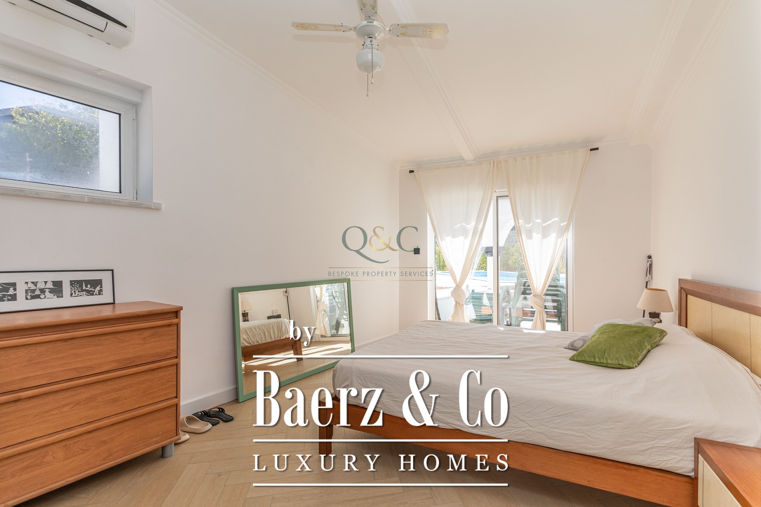 Er zijn drie ruime tweepersoonsslaapkamers, waarvan twee beschikken over recent gemoderniseerde en suite badkamers. De hoofdsuite is voorzien van een inloopkast en kleedruimte, terwijl de derde slaapkamer dubbele openslaande deuren heeft naar het zwembadterras. De grote gezinsbadkamer beschikt over een bad, royale inloopdouche en een dubbele wastafel. Voor het praktische gemak zijn er een aparte wasruimte, diverse opslagruimtes en een volledig uitgeruste keuken.