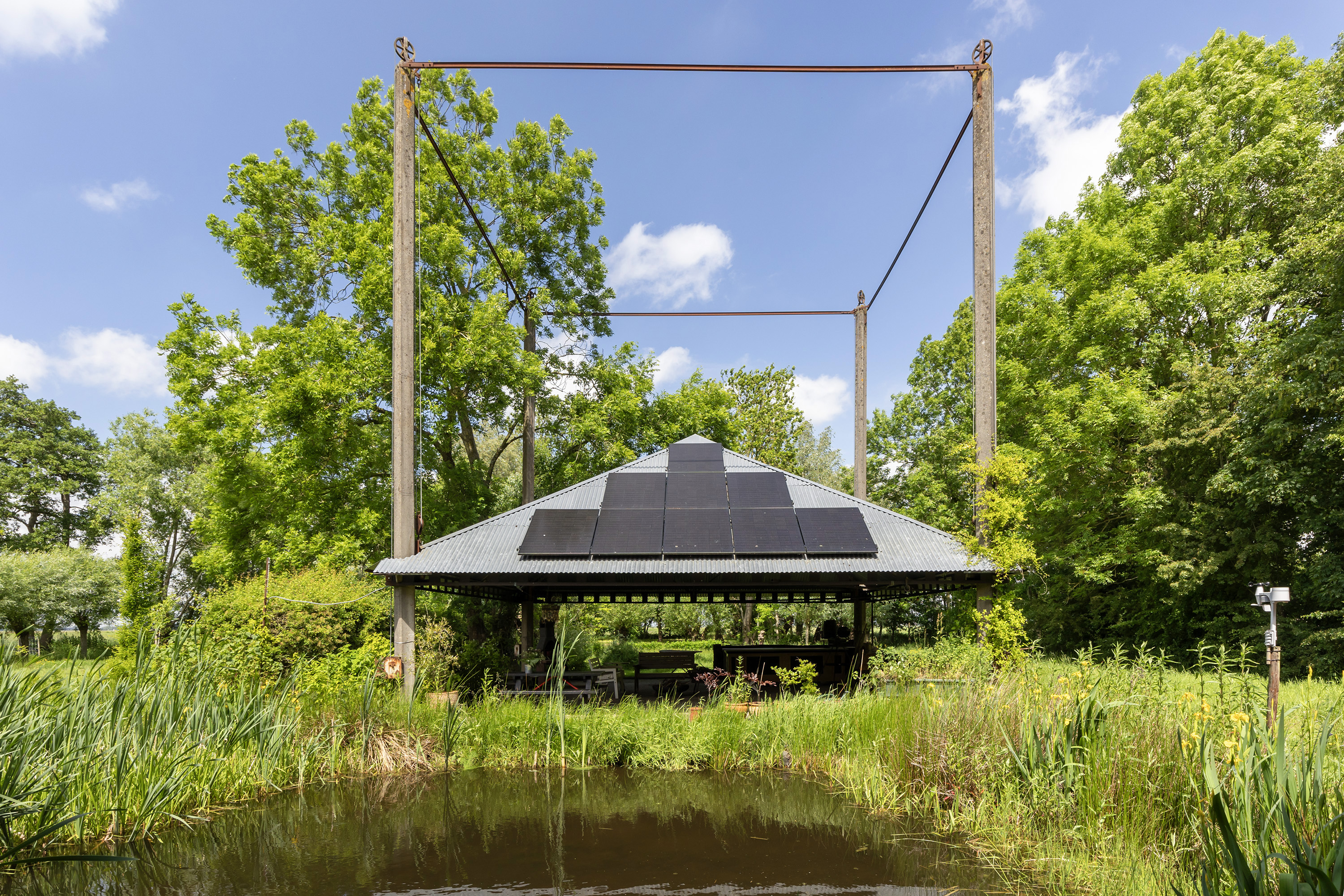 Achter de woning staat een fraaie open hooibergconstructie met een gegalvaniseerd dak, waaronder een buitenkeuken, vuurplaats, bar en meerdere zitjes zijn ingericht. Deze sfeervolle plek biedt beschutting tegen zon en regen en vormt een volwaardige buitenkamer waar het heerlijk toeven is. De tuin is diep, weelderig en toch vrij, omsloten door volwassen bomen die privacy bieden zonder het uitzicht te ontnemen. Een glazen theehuisje, tuinhuis en diverse zon- en schaduwterrassen maken de buitenbeleving compleet. Binnen- en buitenleven vloeien moeiteloos in elkaar over.