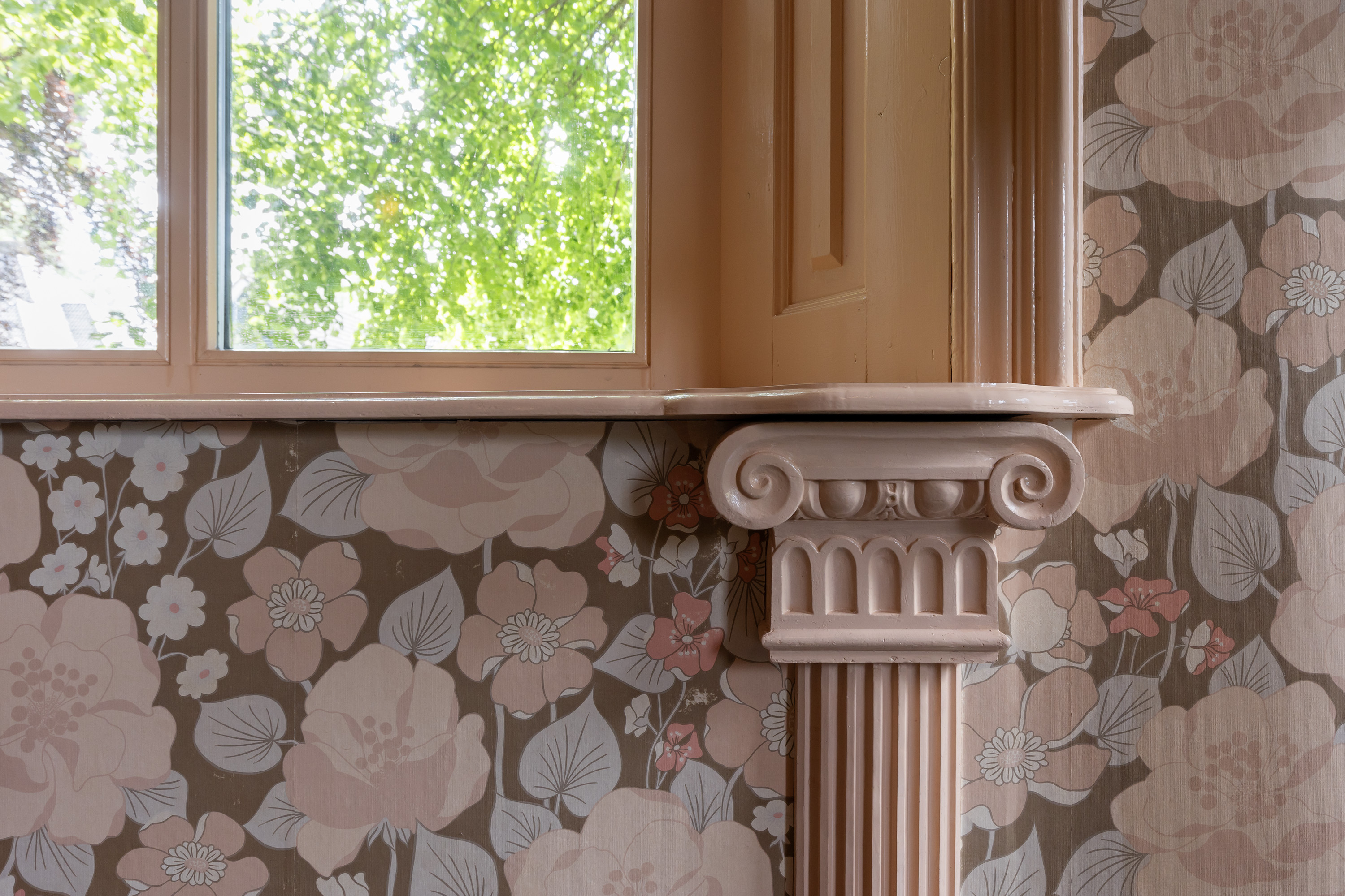 Aan de voorzijde bevindt zich een sfeervolle woonkamer die grandeur uitstraalt dankzij de plafondhoogte, kamerhoge ramen met roedeverdeling, diepe vensterbanken, originele houten vloeren en een historische schouw met antieke kachel. Klassiek behang, rijke details en het zicht op monumentale bomen in de voortuin versterken de warme uitstraling. Deze kamer, evenals de naastgelegen eetkamer, is voorzien van een gaskachel en is via de kelder geïsoleerd.