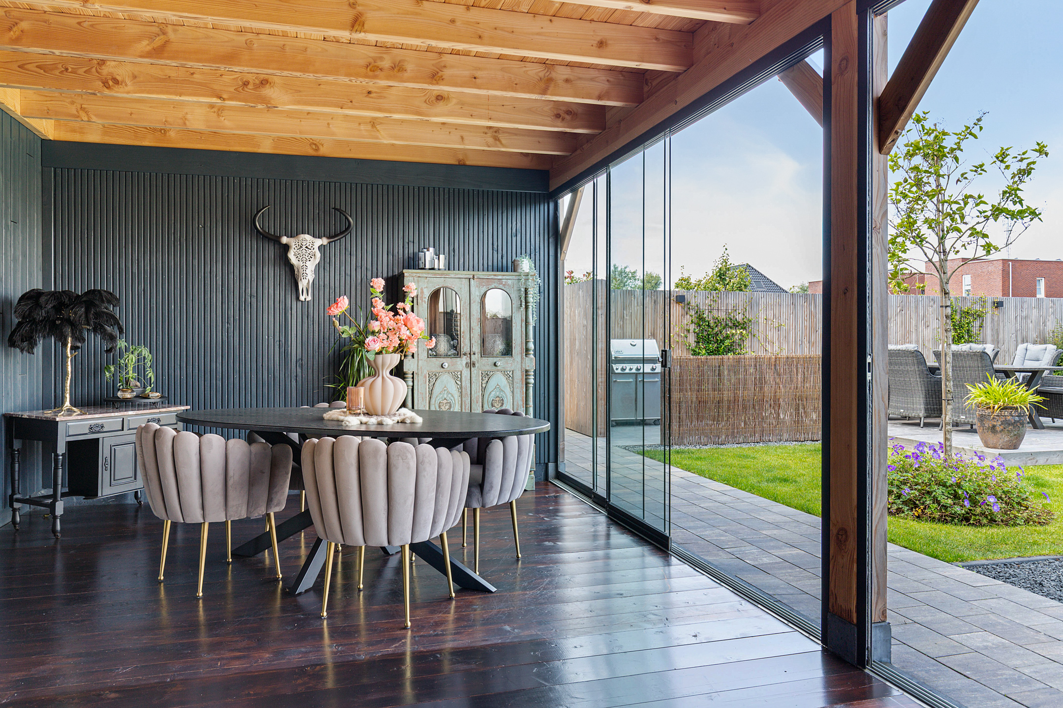 Aan de achterzijde is de woning geschakeld aan een ruime, deels geïsoleerde houten berging. Ideaal voor fietsen, tuinspullen en watersportmaterialen.