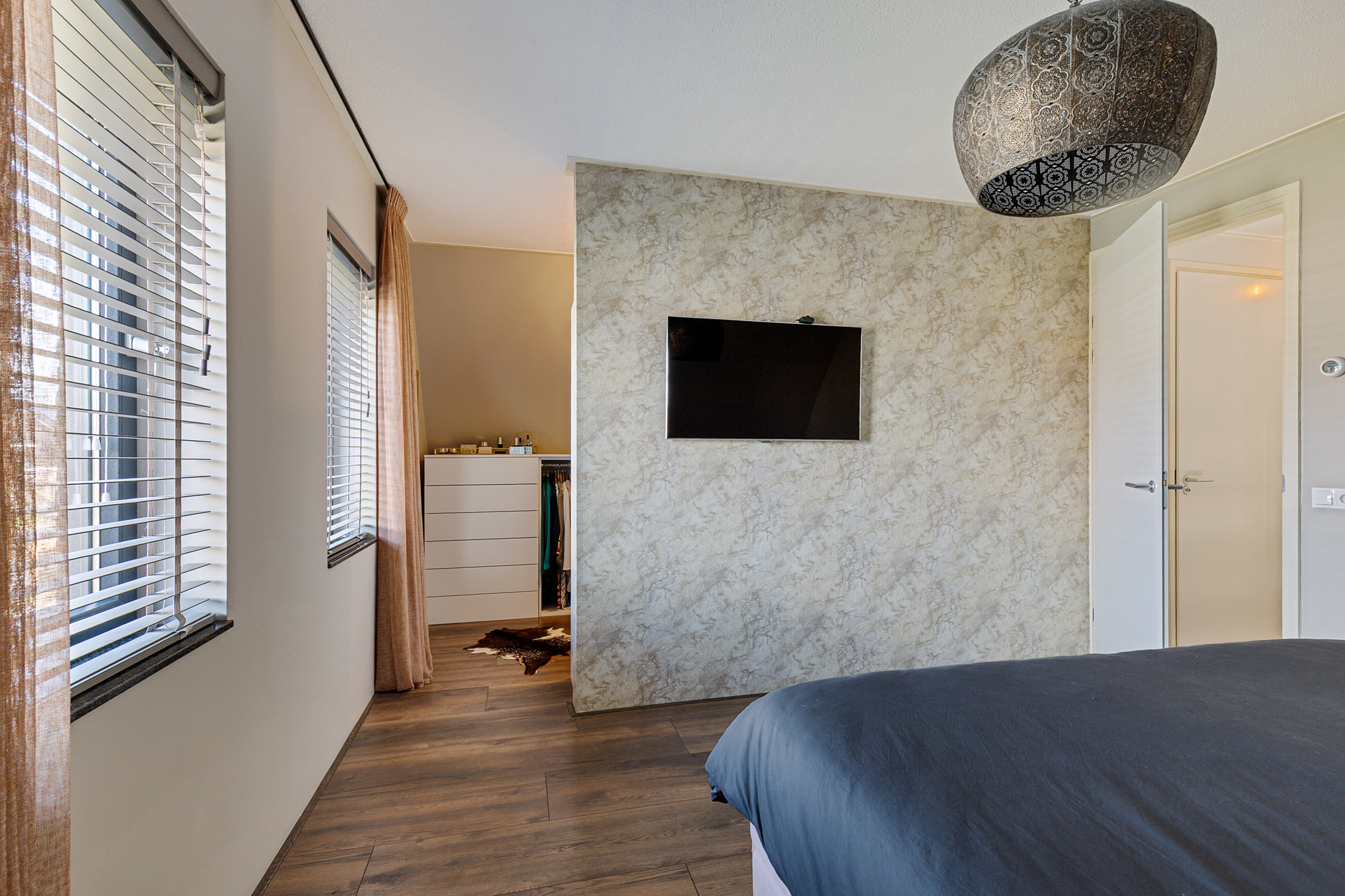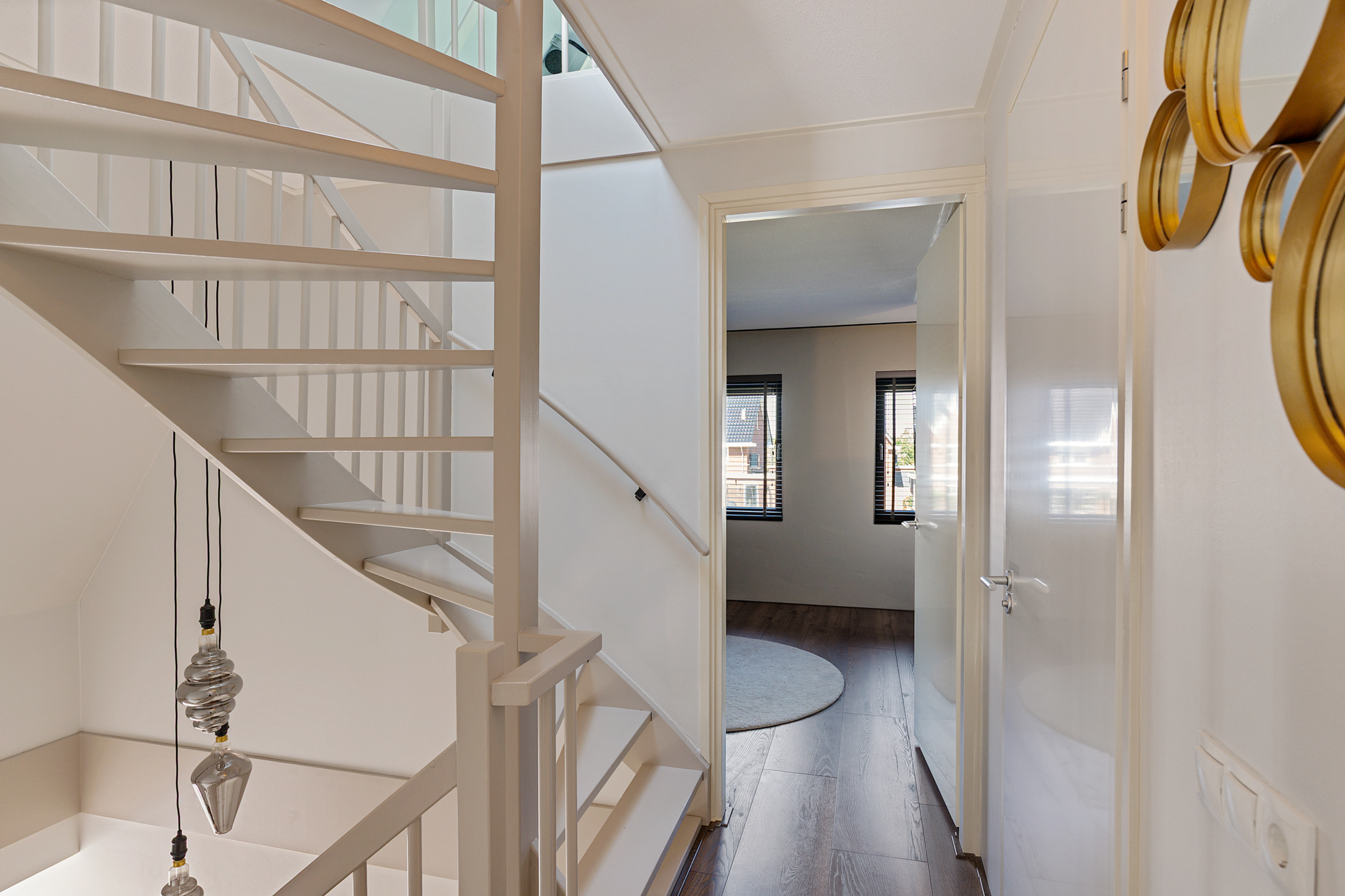 Op de eerste verdieping bevinden zich drie royale slaapkamers, waaronder de masterbedroom met luxe inloopgarderobe. De badkamer is van absolute hotelkwaliteit: daglicht, een, royale inloopdouche, toilet en een dubbel design wastafelmeubel. Alles uitgevoerd met oog voor detail en in een hoogwaardige afwerking. De gehele 1ste verdieping is voorzien van een stijlvolle laminaat-vloer en wordt verwarmd en gekoeld middels vloerverwarming.