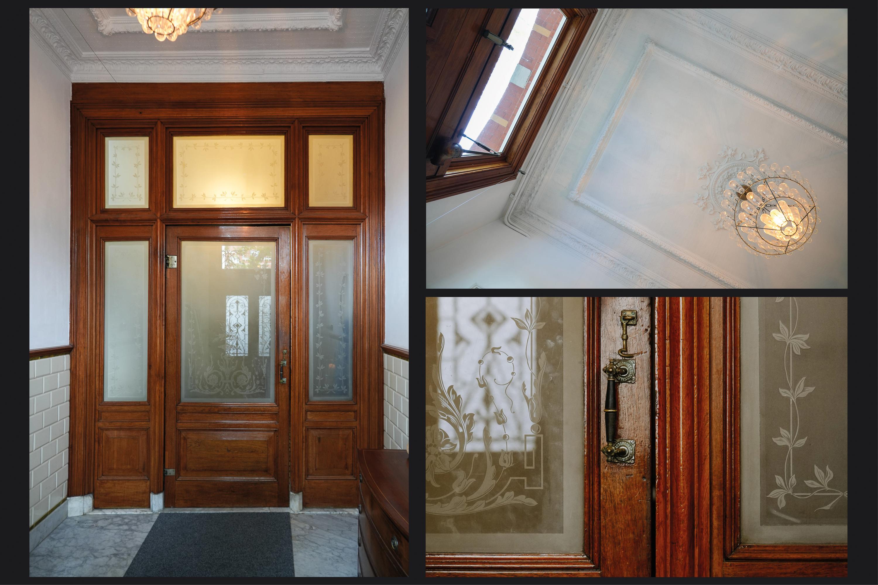 In de fraaie lijstgevel leidt de originele paneelvoordeur naar de vestibule. Deze ruimte heeft een ongekende grandeur, enerzijds door het hoge geornamenteerde stucplafond en anderzijds door het fraaie houtwerk met gaaf bewaard gebleven geëtst glas. De vloer is belegd met marmer en de facettegels op de wanden zijn intact gebleven. In de achtergelegen hal leidt een 19e-eeuwse trappartij naar de verdieping. Vanuit de hal geven prachtige paneeldeuren toegang tot de woonkamer, werkkamer, woonkeuken, kelderkast en het toilet. De vloer is hier belegd met authentieke patroontegels. De woonkeuken is een heerlijk lichte ruimte, ingericht met een Siematic keukenmeubel voorzien van diverse apparatuur en een diep natuurstenen werkblad uit één stuk.