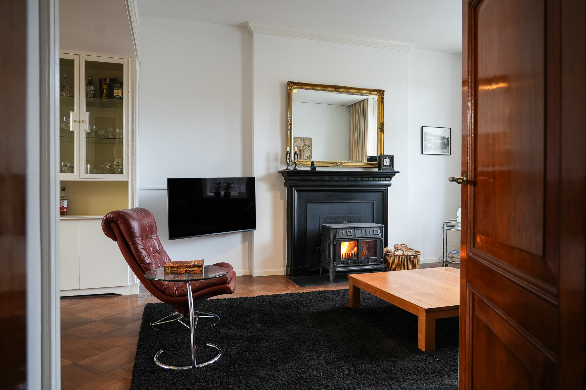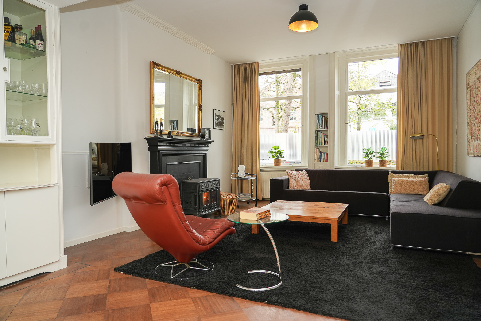 Rechts van de hal bevindt zich de woonkamer. Deze lichte ruimte heeft een plafond van ruim drie meter hoog, een schouw met goed werkend rookkanaal en vaste inbouwkasten op de plaats van de vroegere suitedeuren. In de achterkamer is in de voormalige doorgang naar de school een extra kast gemaakt. Aan de achterzijde bevindt zich een verwarmde tuinkamer met plavuizenvloer – ideaal als speelkamer, want de ruimte kan worden afgesloten met glazen schuifdeuren.