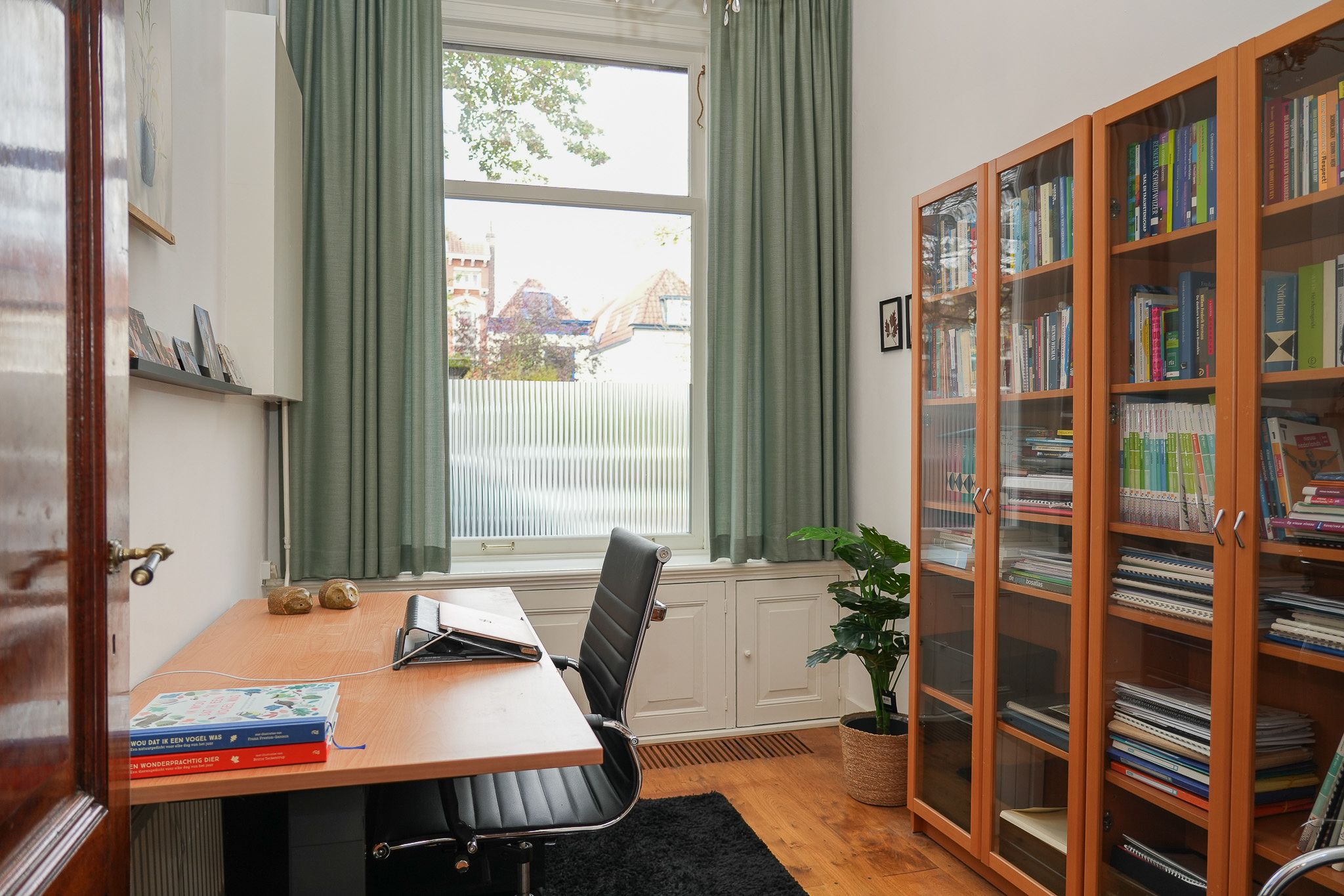 De werkkamer ligt aan de voorzijde en kijkt uit over de straat en het plantsoen. Onder de vensterbanken zijn vaste kasten gemaakt en op de vloer liggen eiken delen.