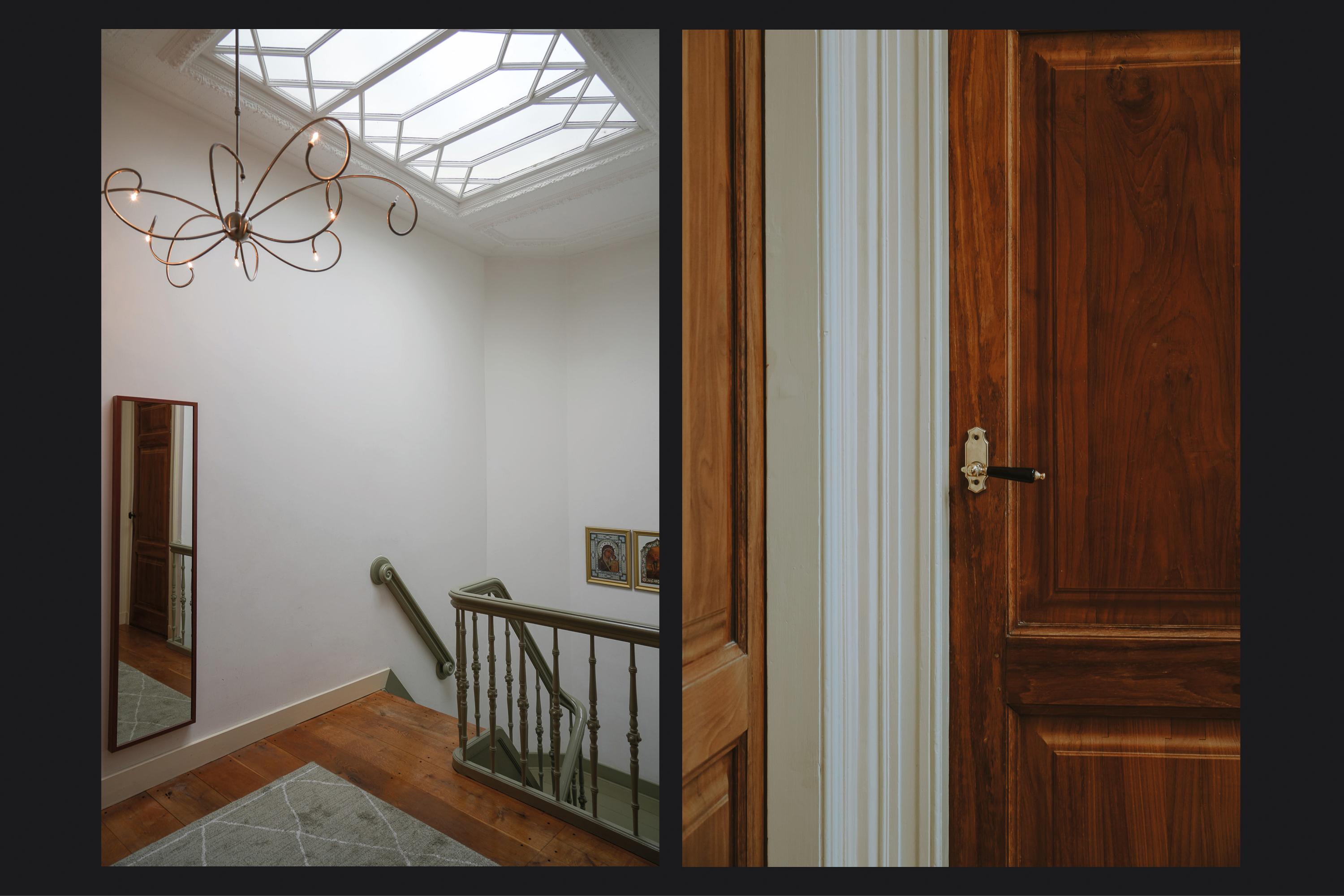Boven gekomen baadt de overloop in een zee van licht, dankzij de lichtstraat in het platte dak. Prachtige drie-vaks paneeldeuren geven toegang tot de aangrenzende vertrekken. Twee slaapkamers bevinden zich aan de voorzijde en kijken uit over het plantsoen. In het voorportaal van één van deze slaapkamers aan de voorzijde is een trap voorbereid, omdat er in het verleden plannen waren om het pand met een extra verdieping te vergroten.