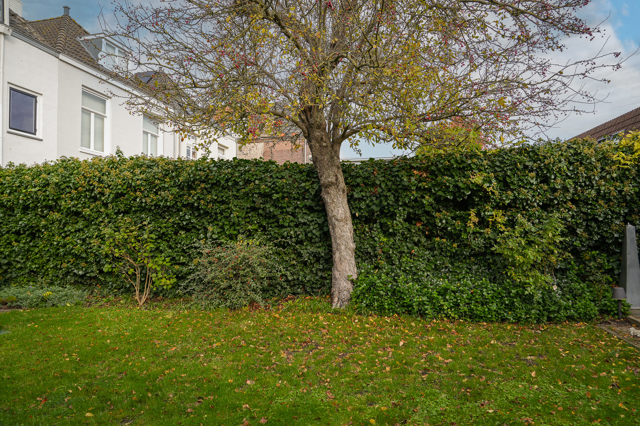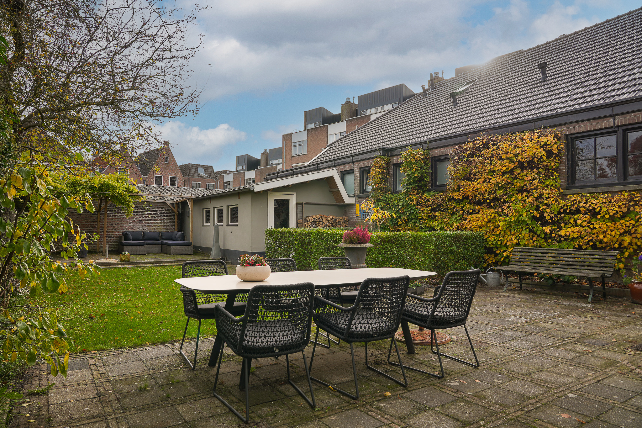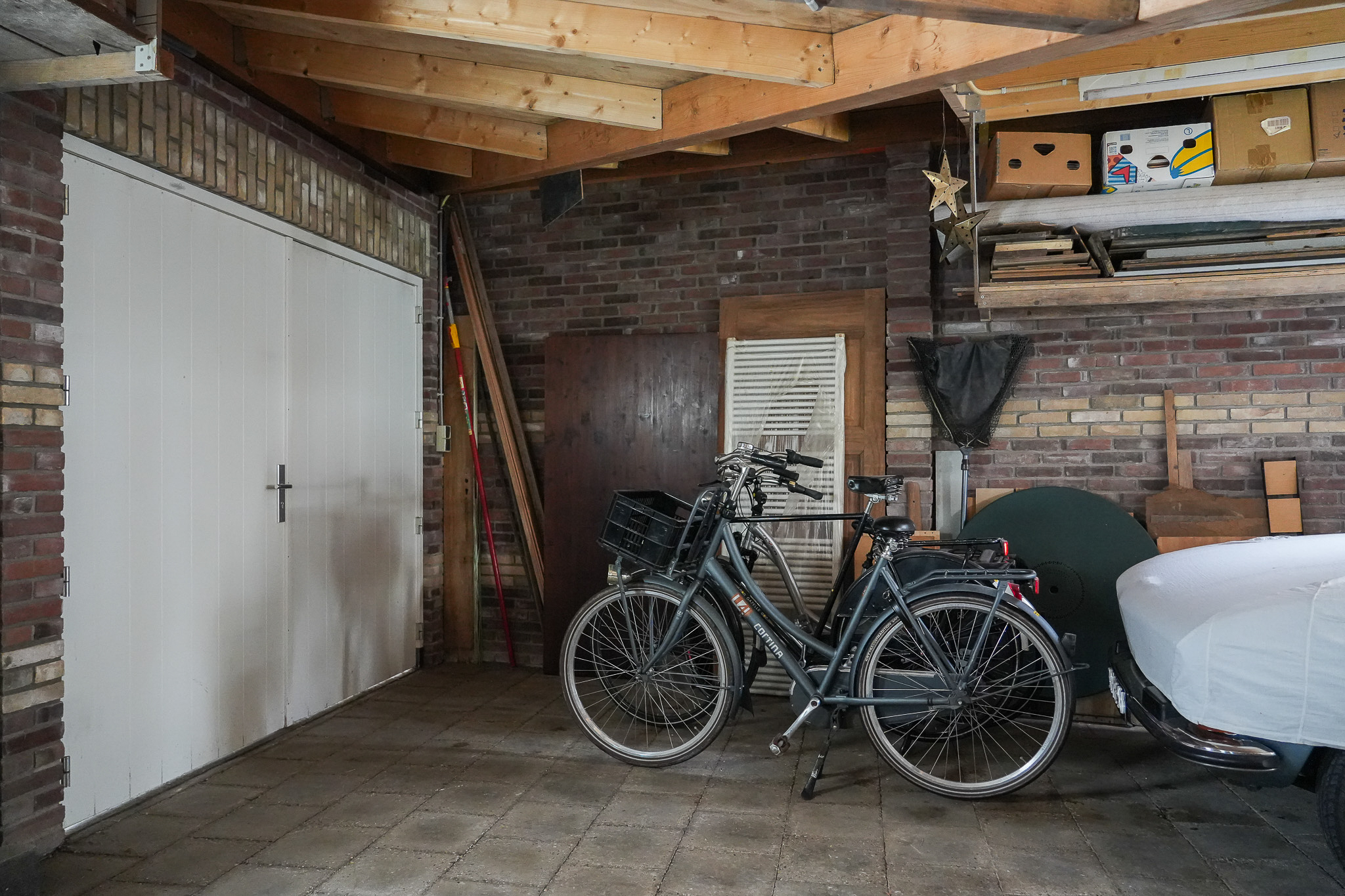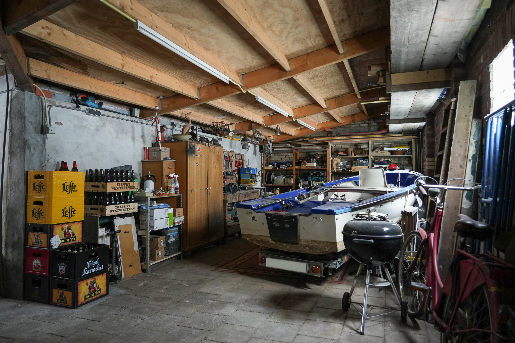Achter de woning ligt een unieke, 9,5 meter brede en 15 meter diepe tuin op het oosten en zuiden. Er is altijd wel ergens een plekje in de zon of schaduw te vinden. In 2021 hebben de eigenaren het perceel kunnen uitbreiden, waardoor er ruimte ontstond om een groot pannengedekt bijgebouw te bouwen. Deze ruimte van 59 m² leent zich bij uitstek als stallingsruimte voor een oldtimer of boot, dan wel als atelier. De dubbele garagedeuren komen uit op de parkeerplaats direct achter de woning.