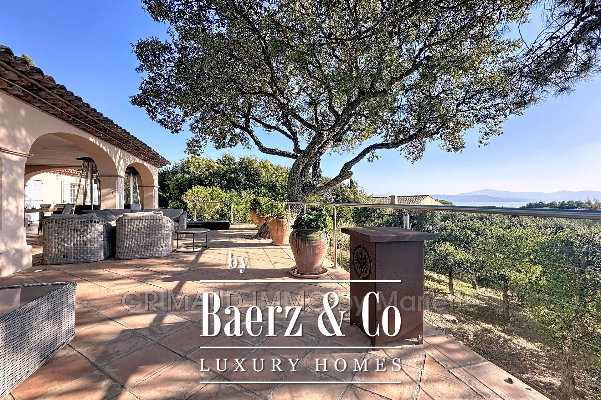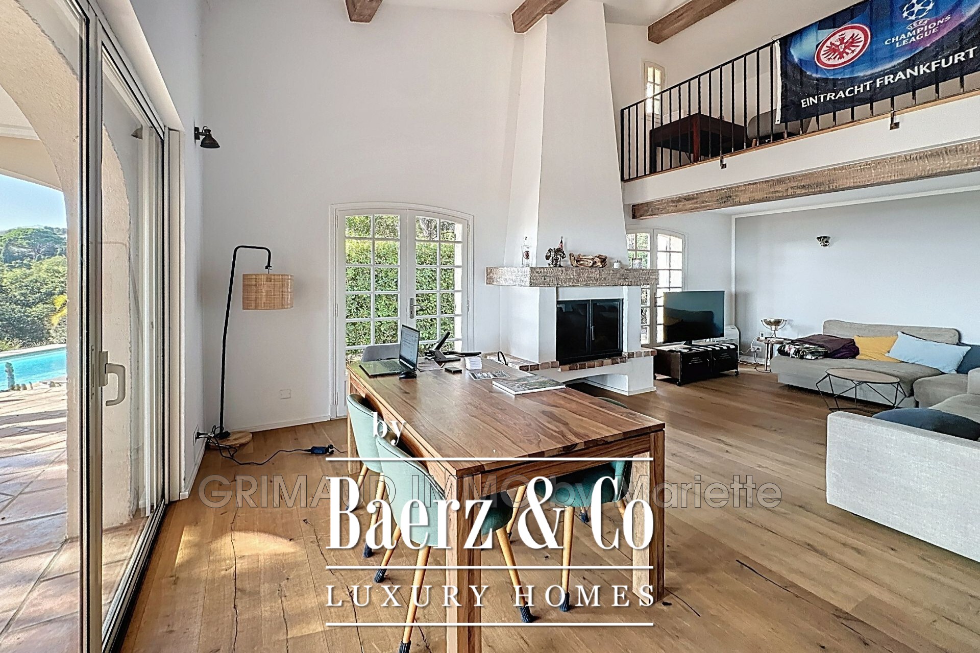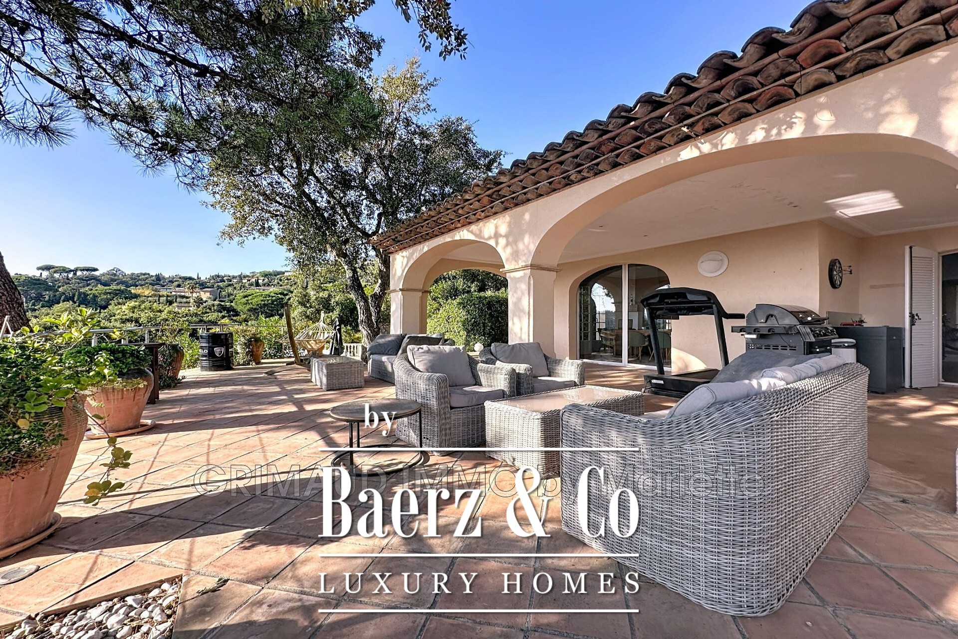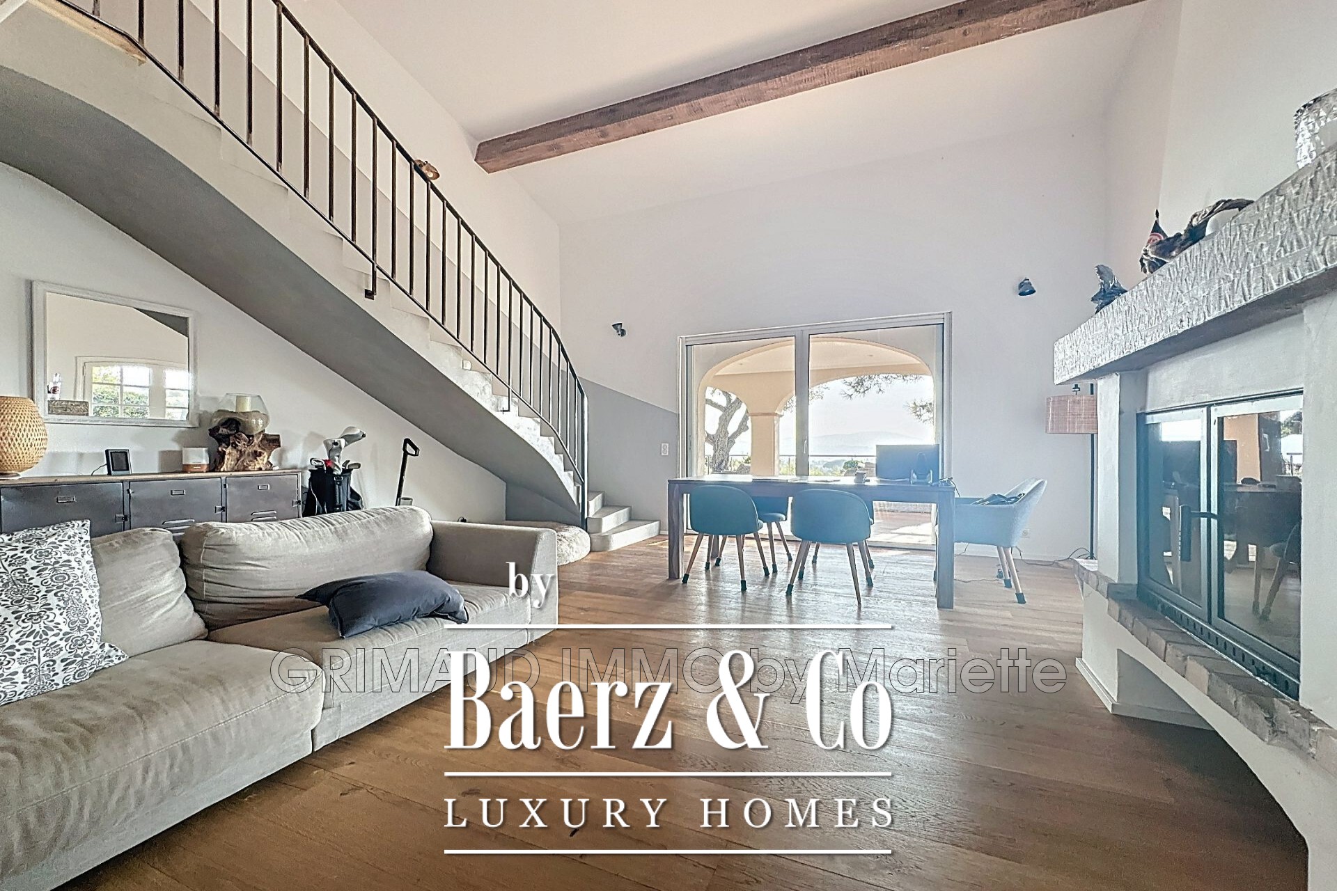fitted kitchen, three bedrooms with two shower rooms, upstairs a master suite with its bathroom and an office. Numerous covered and uncovered terraces. Beautiful amenities and a beautiful view of the bay of Saint Tropez.