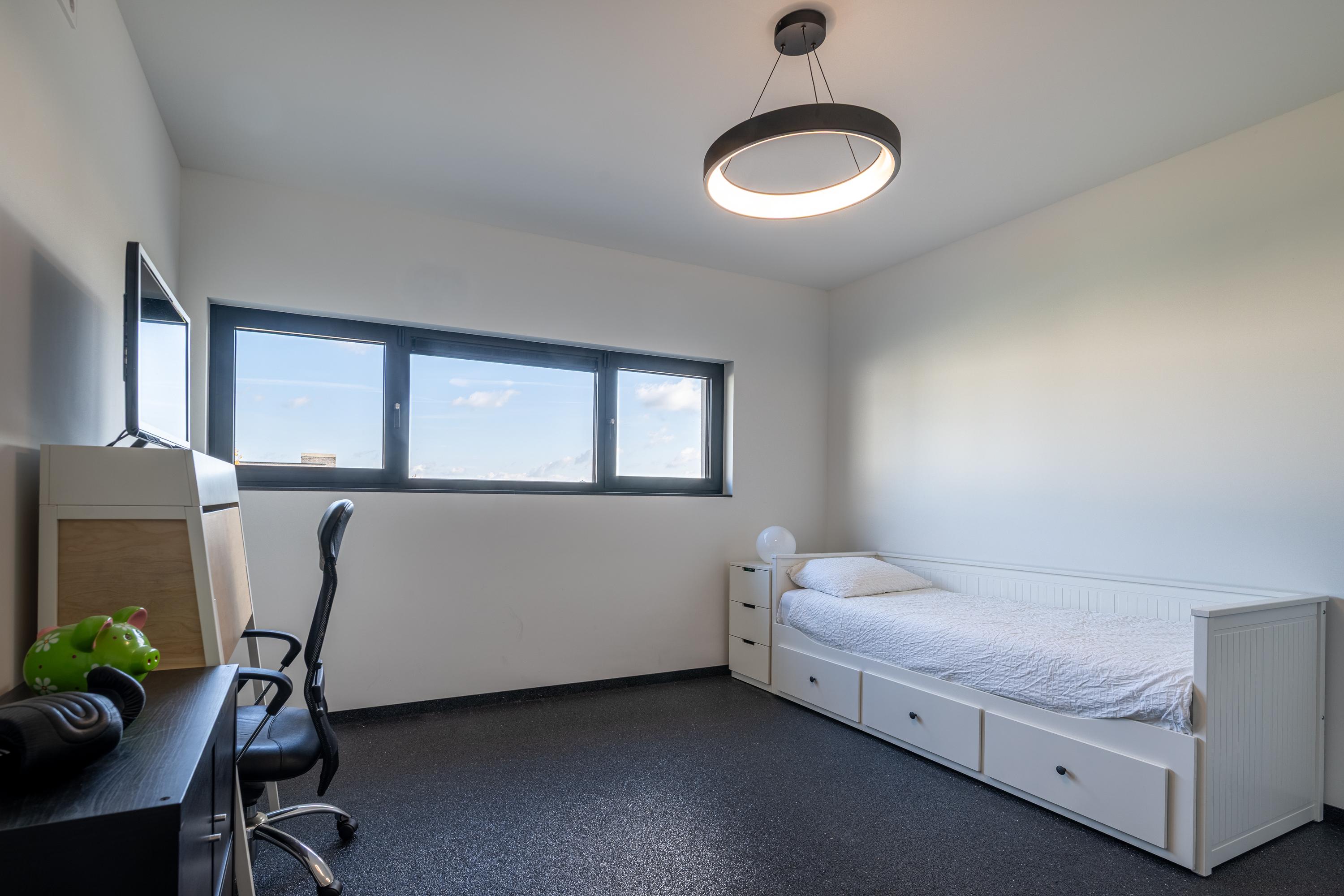 Een bijzonder detail is het grote bloemenraam, dat zorgt voor een speelse doorkijk naar de tuin en de bosrand. In combinatie met de grote schuifpui naar het overdekt terras ontstaat een ruimtelijk en open geheel, waarin binnen en buiten op harmonieuze wijze in elkaar overlopen. De woonkamer en keuken zijn beide voorzien van een airco unit.
