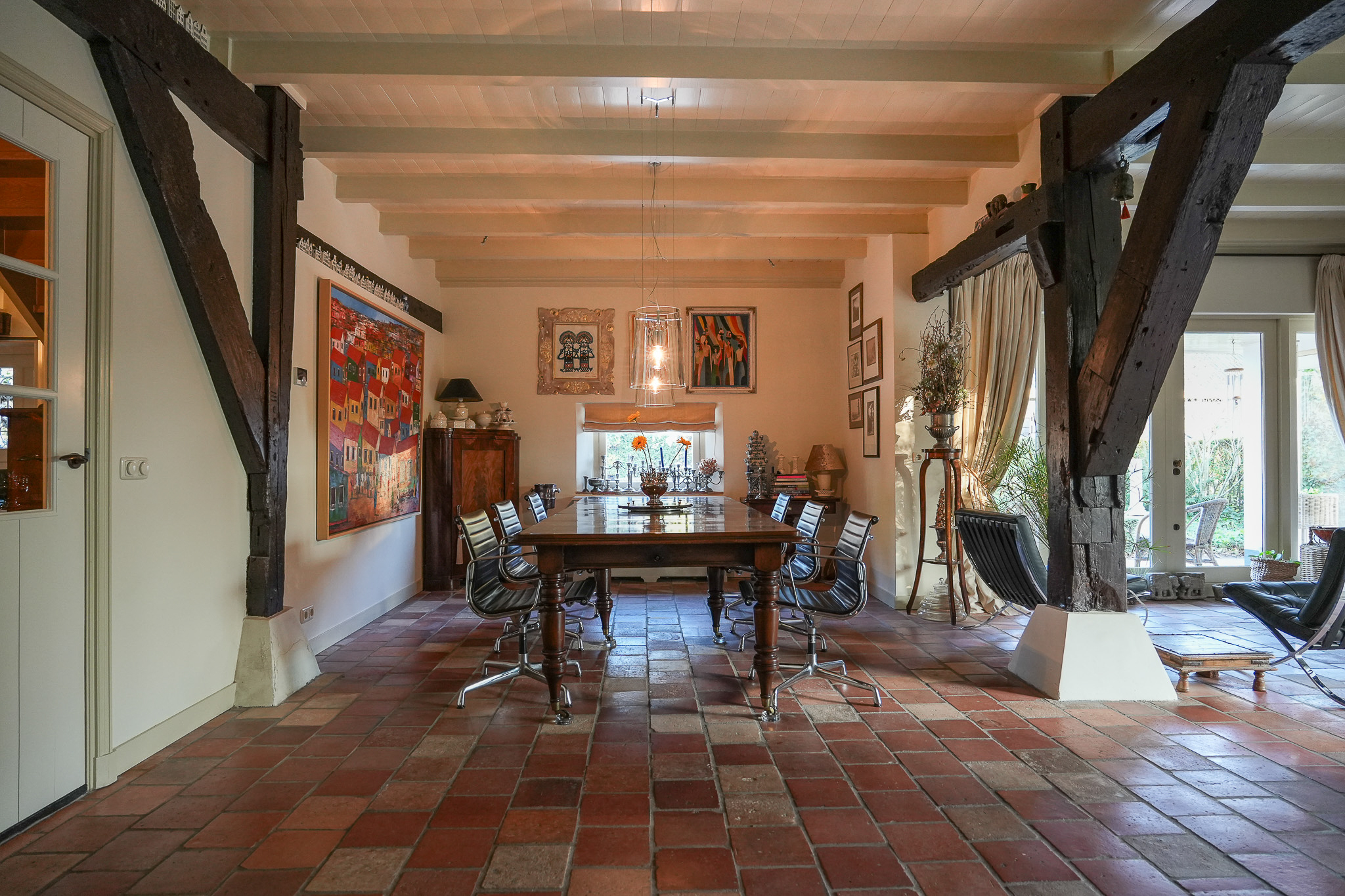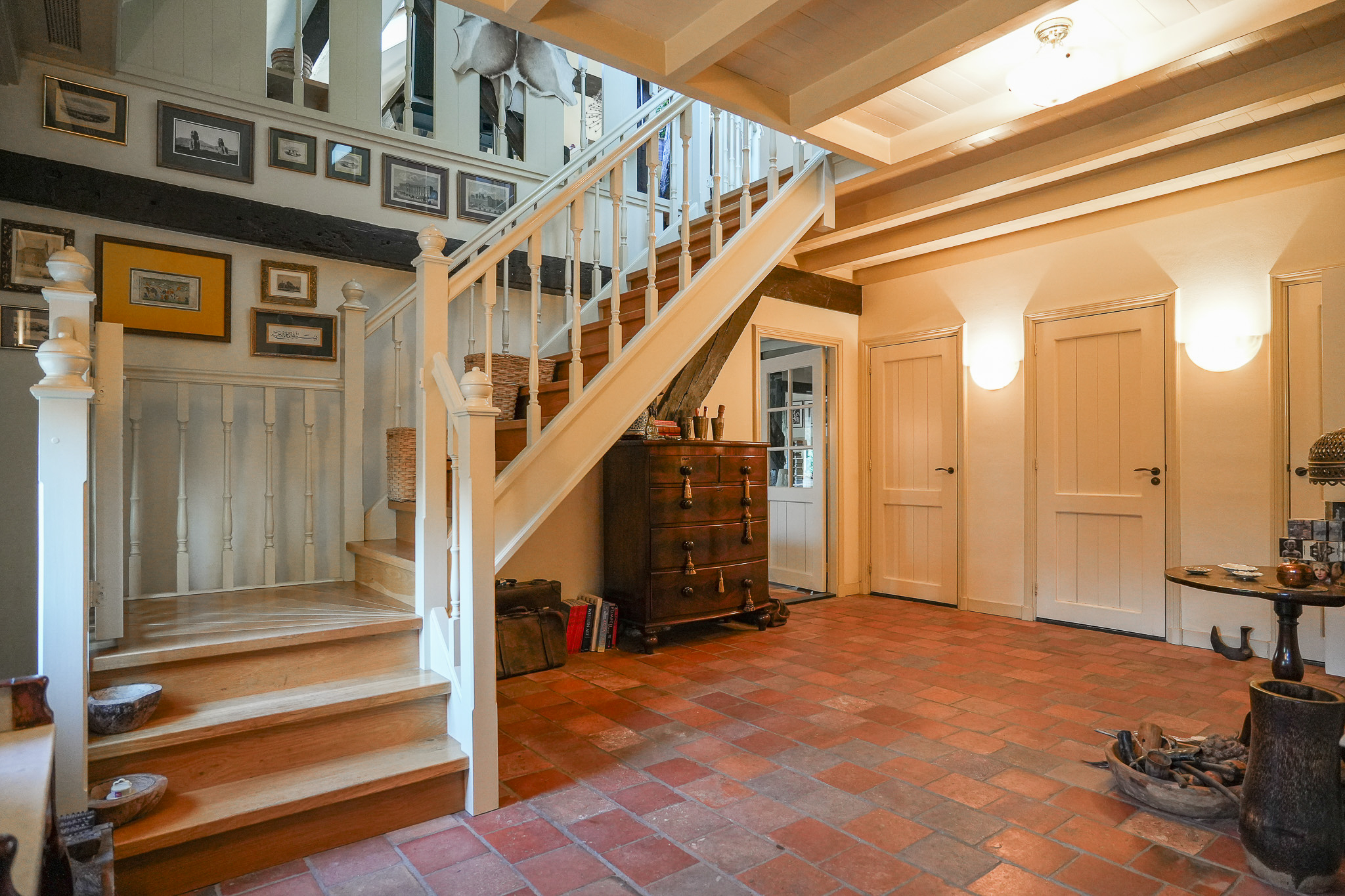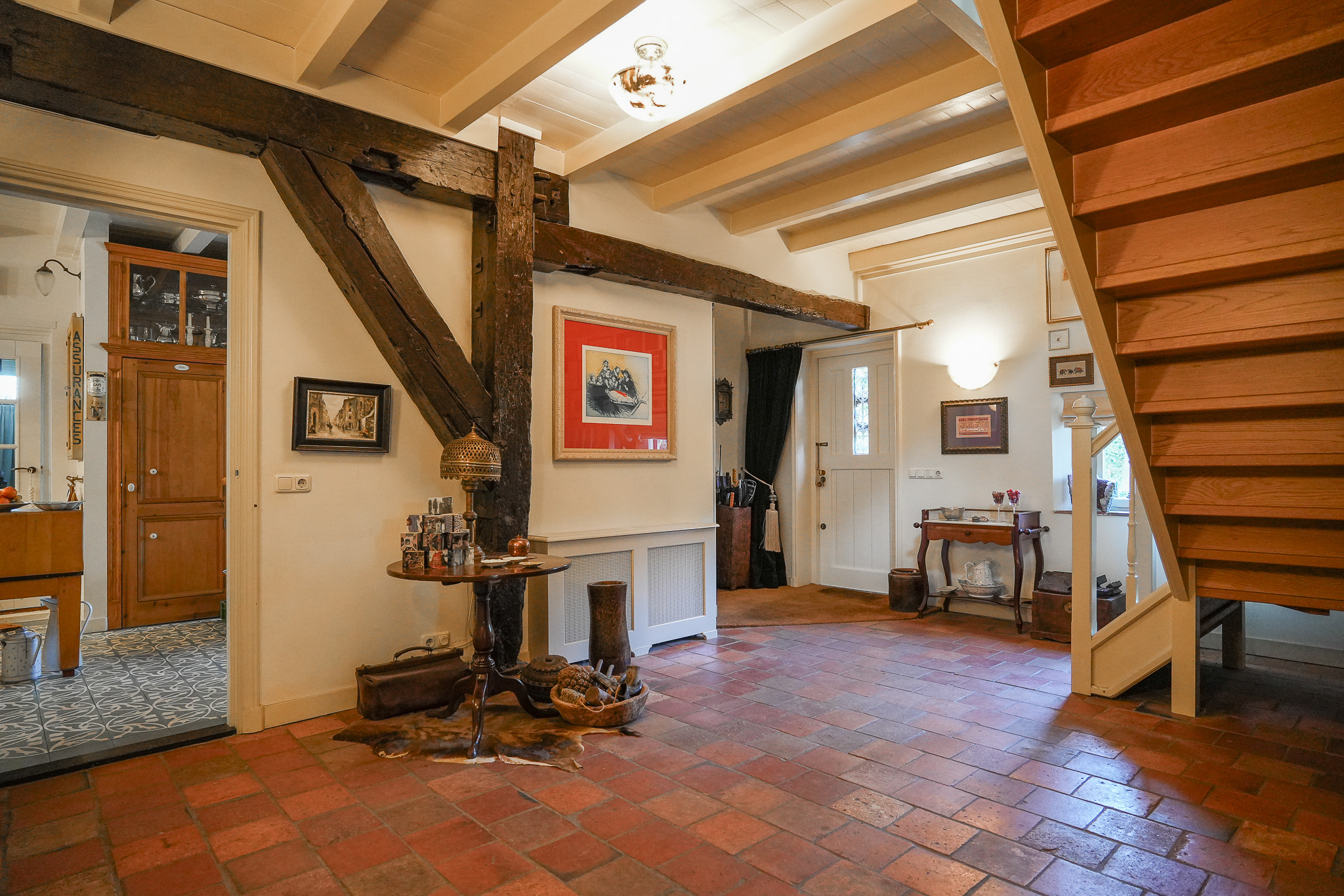 Via de entree aan de opritzijde bereikt u een ruime hal met garderobe en toilet. Een glasdeur geeft toegang tot de voormalige deel, waar een royale woonkamer is gerealiseerd. De imposante zandstenen schouw met open haard, de houten spanten en de met antieke rode estriken belegde vloer zorgen voor een aangename sfeer. De vloer is hier, evenals in de hal, voorzien van vloerverwarming.