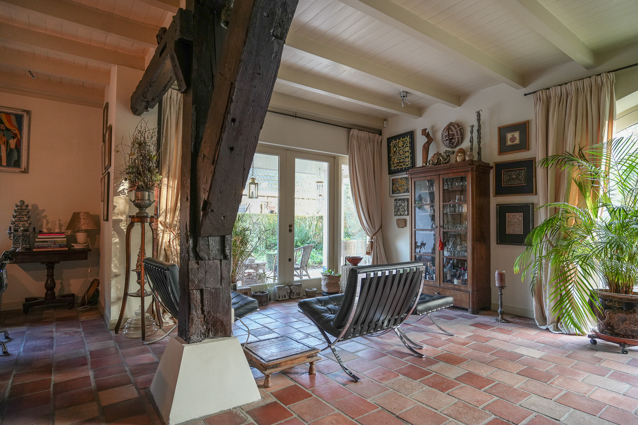 Twee paar openslaande deuren geven toegang tot het terras en de tuin, die ruim 100 meter doorloopt tot in het achterliggende privébos(je).