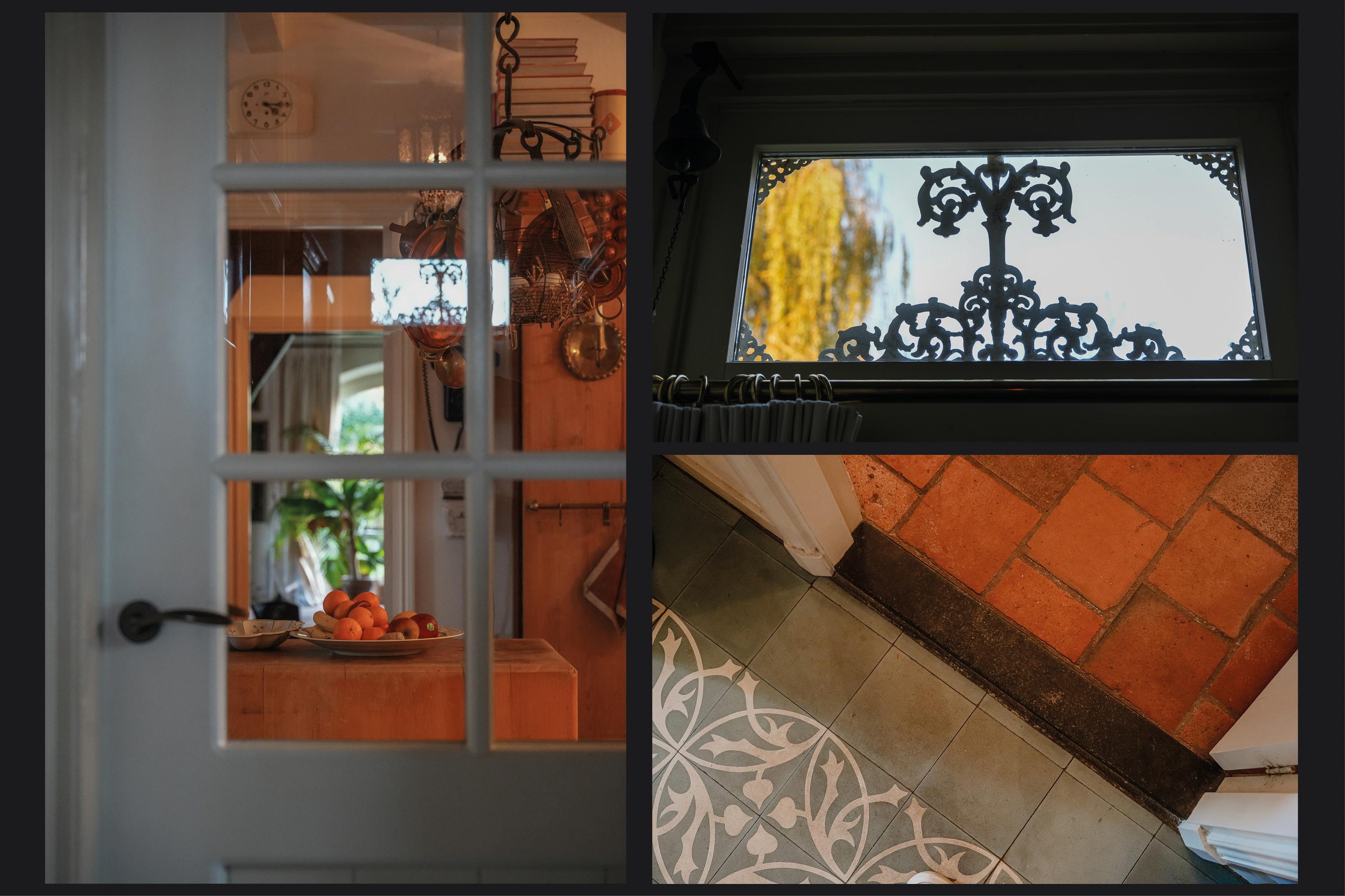 In de keuken zijn diverse ambachtelijk getimmerde vaste (boeken)kasten aanwezig, waarin ook de toegang tot de wijnkelder subtiel is weggewerkt.