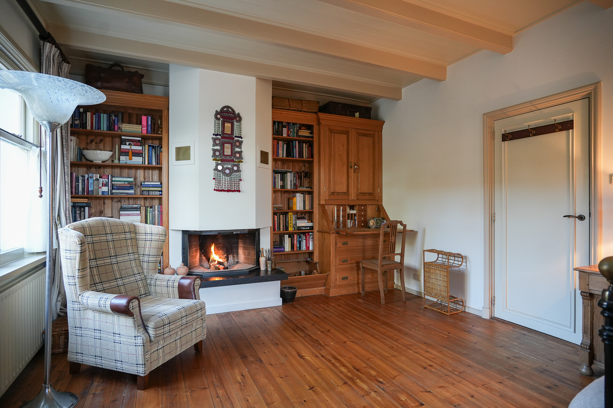Aangrenzend bevindt zich een zitkamer met gashaard: een fijne plek om u in de avondzon terug te trekken, televisie te kijken of muziek te luisteren.