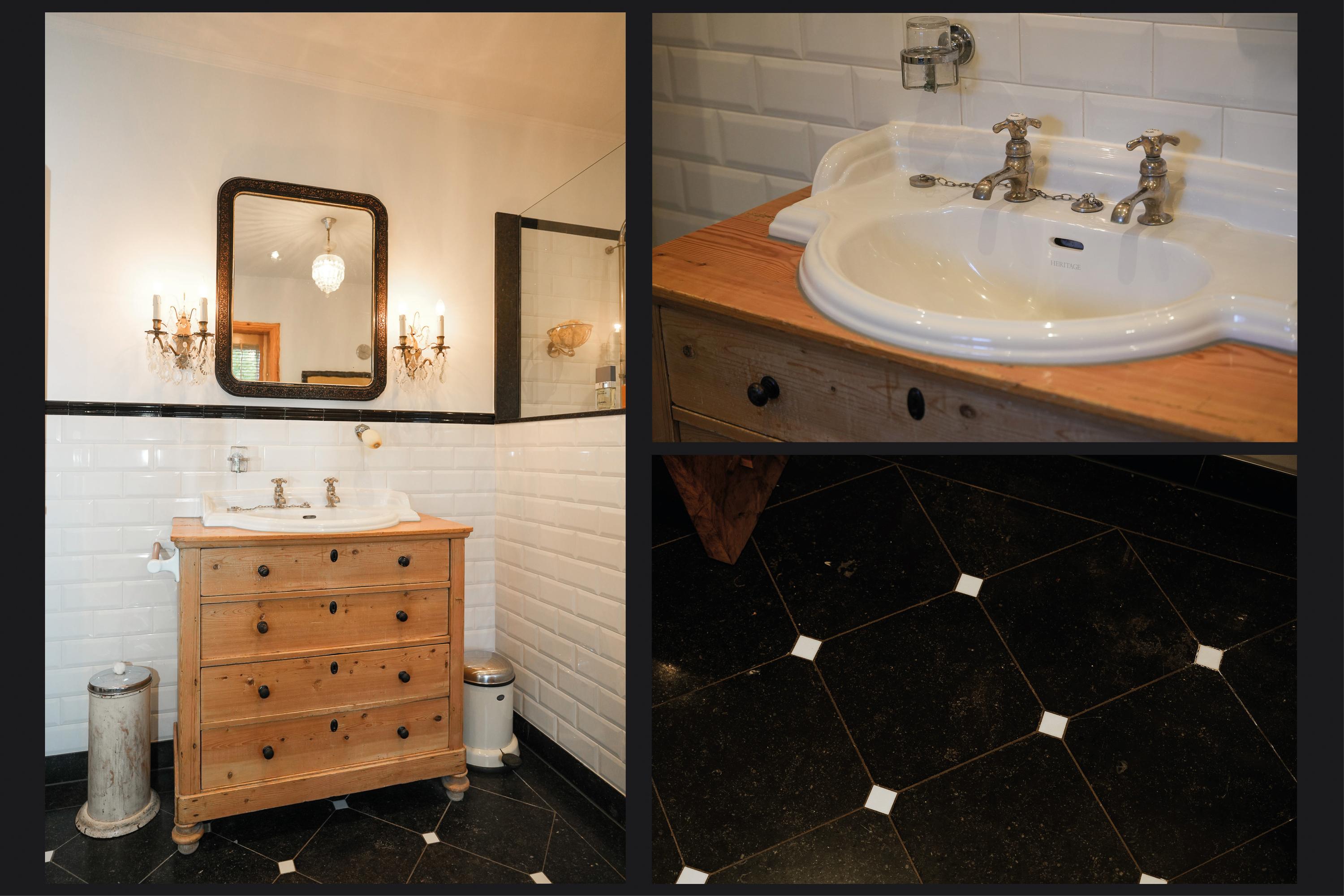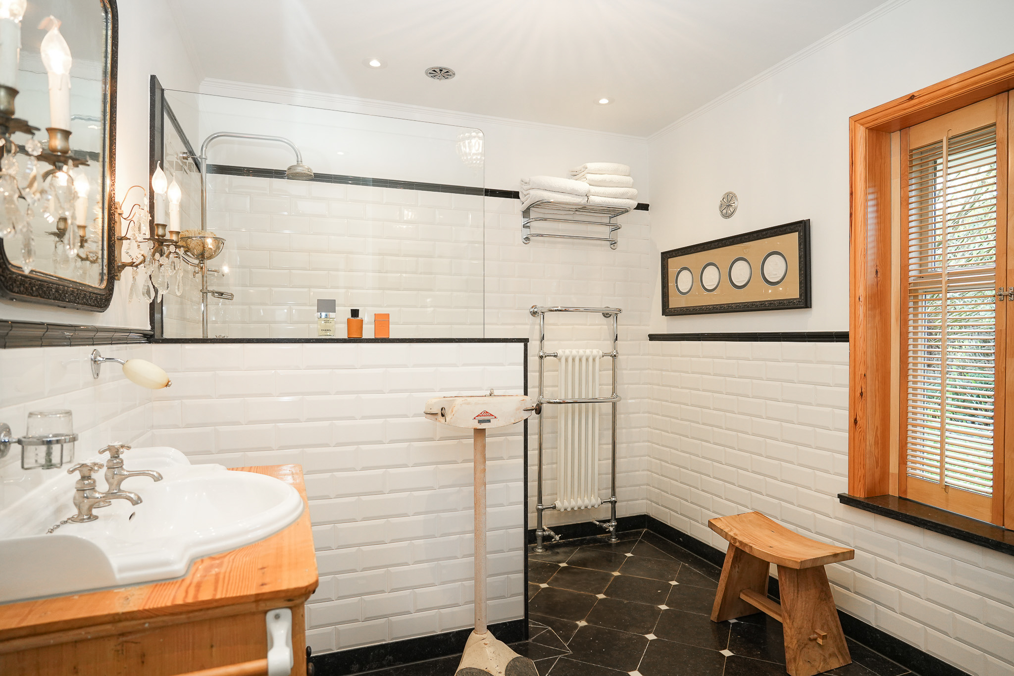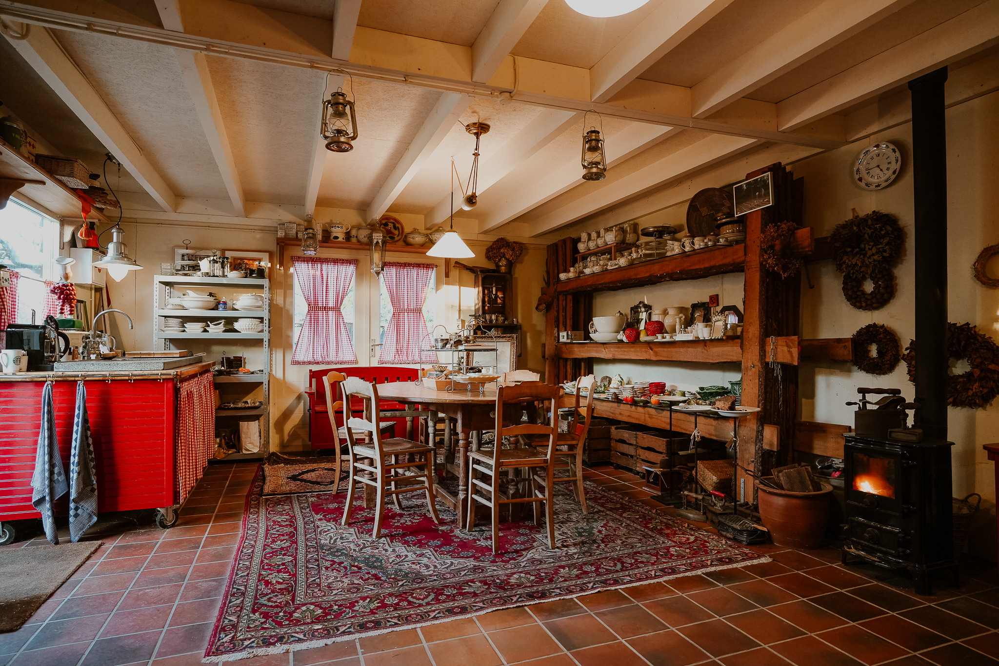 De woonkeuken vormt het hart van het huis en biedt via dubbele deuren toegang tot de zijtuin. De 4-oven Aga-cooker (voorzien van een klokthermostaat en daardoor energiezuinig), het natuurstenen werkblad met porseleinen spoelbak, messing kraan en Portugese vloertegels zorgen voor een klassieke sfeer.