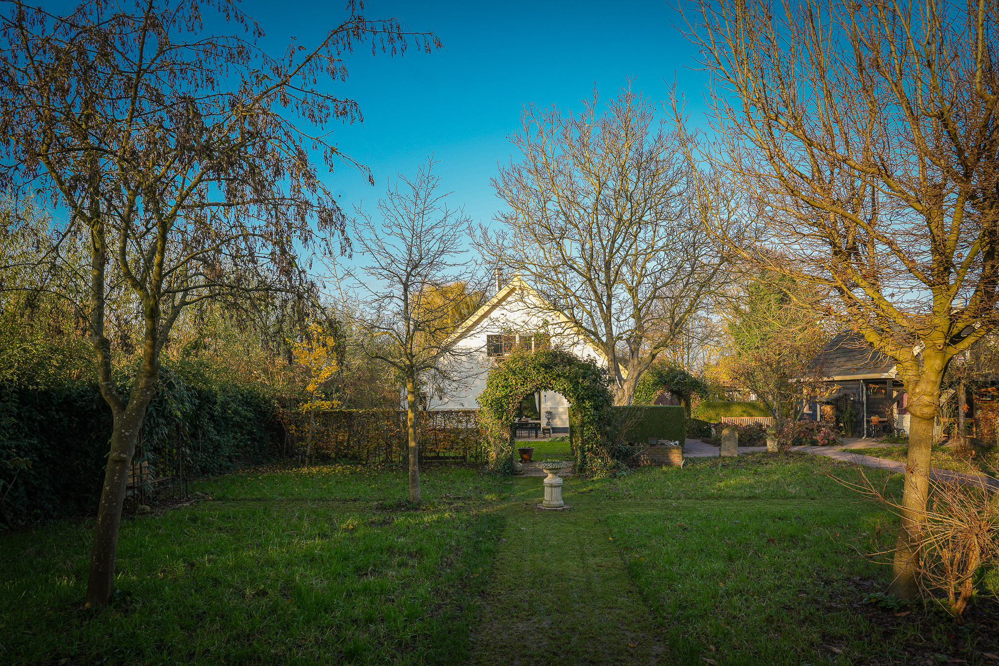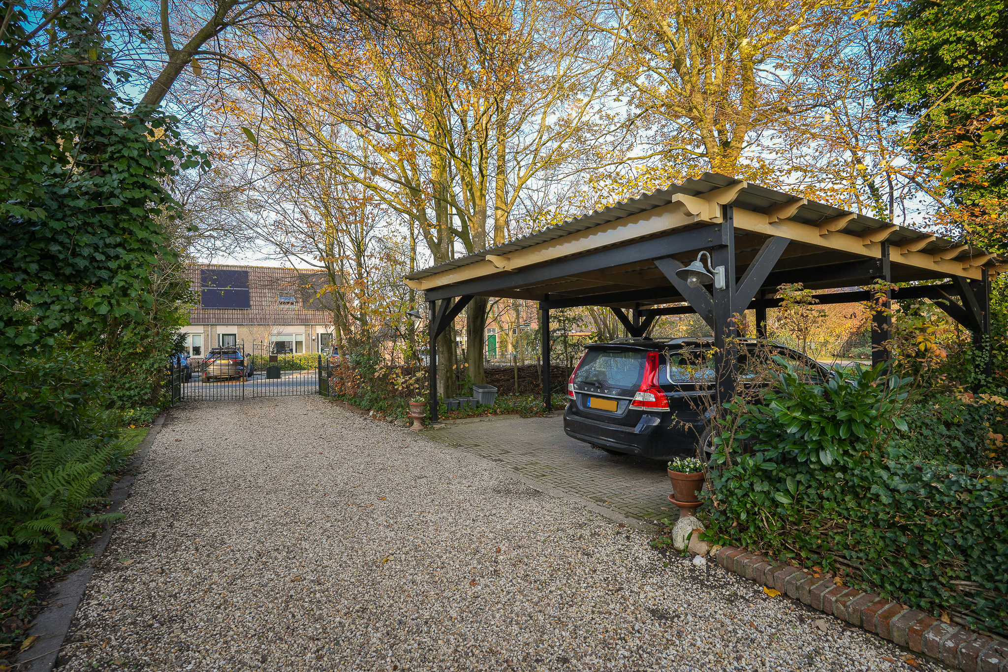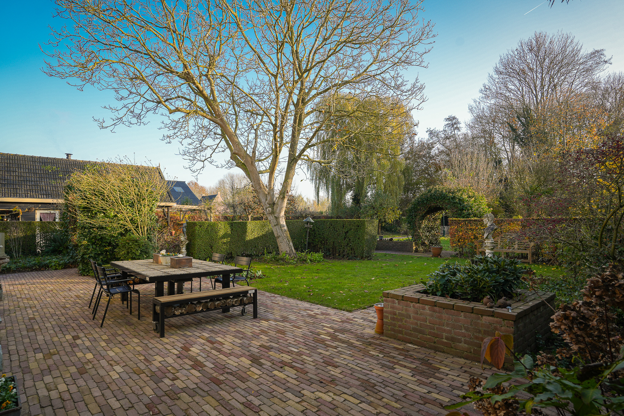 Het perceel van bijna 5.000 m² met onder meer een onderhoudsarme bloementuin is een waar paradijs voor vogels en insecten. Het perceel is omzoomd door knotwilgen, aan de voorzijde staan een oude pruimenboom en een karakteristieke treurwilg. Links van de woonboerderij bevindt zich een oprit voor meerdere auto’s, waarvan er twee onder de carport passen.
