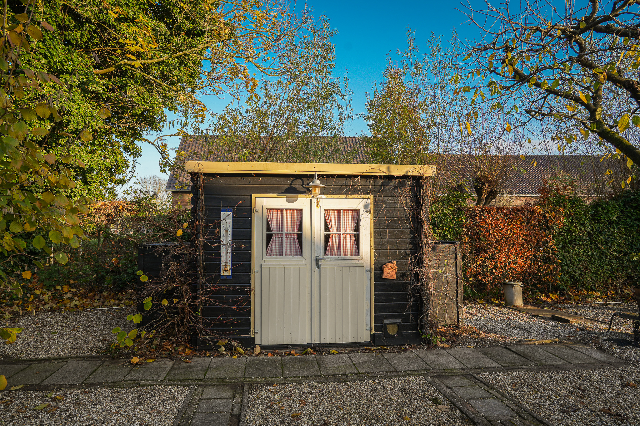 Achter in de tuin staat een geïsoleerd bijgebouw met houtkachel en keukenblokje. De huidige eigenaren hebben deze ruimte ingericht voor de verkoop van brocante. Het bijgebouw beschikt over openslaande deuren naar een overkapping van 10 m² – een fijne plek voor de jeugd, logees, ateliergebruik of als rustige werkplek.