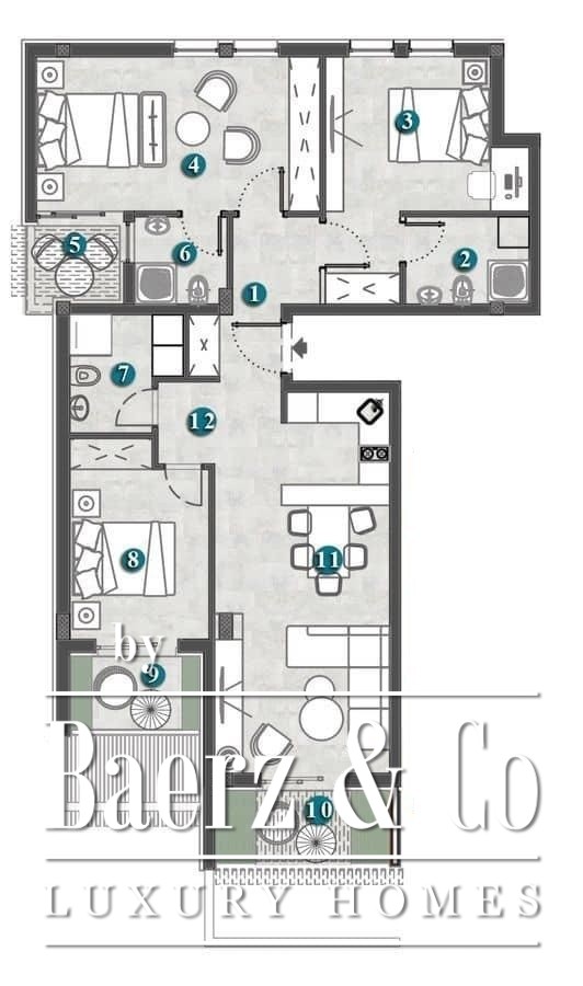 Structure of the apartment: 2 hallways, living room with kitchen and dining table, 3 bedrooms, 3 bathrooms and 3 terraces. The apartment itself has 81,52m2, while its three balconies have 8,33m2, it sums up to the total of 89,85m2. It has a view of the sea and the mountains that surround it. The apartment will be delivered with finished tiles, finished floors, equipped bathroom and equipped air conditioning.