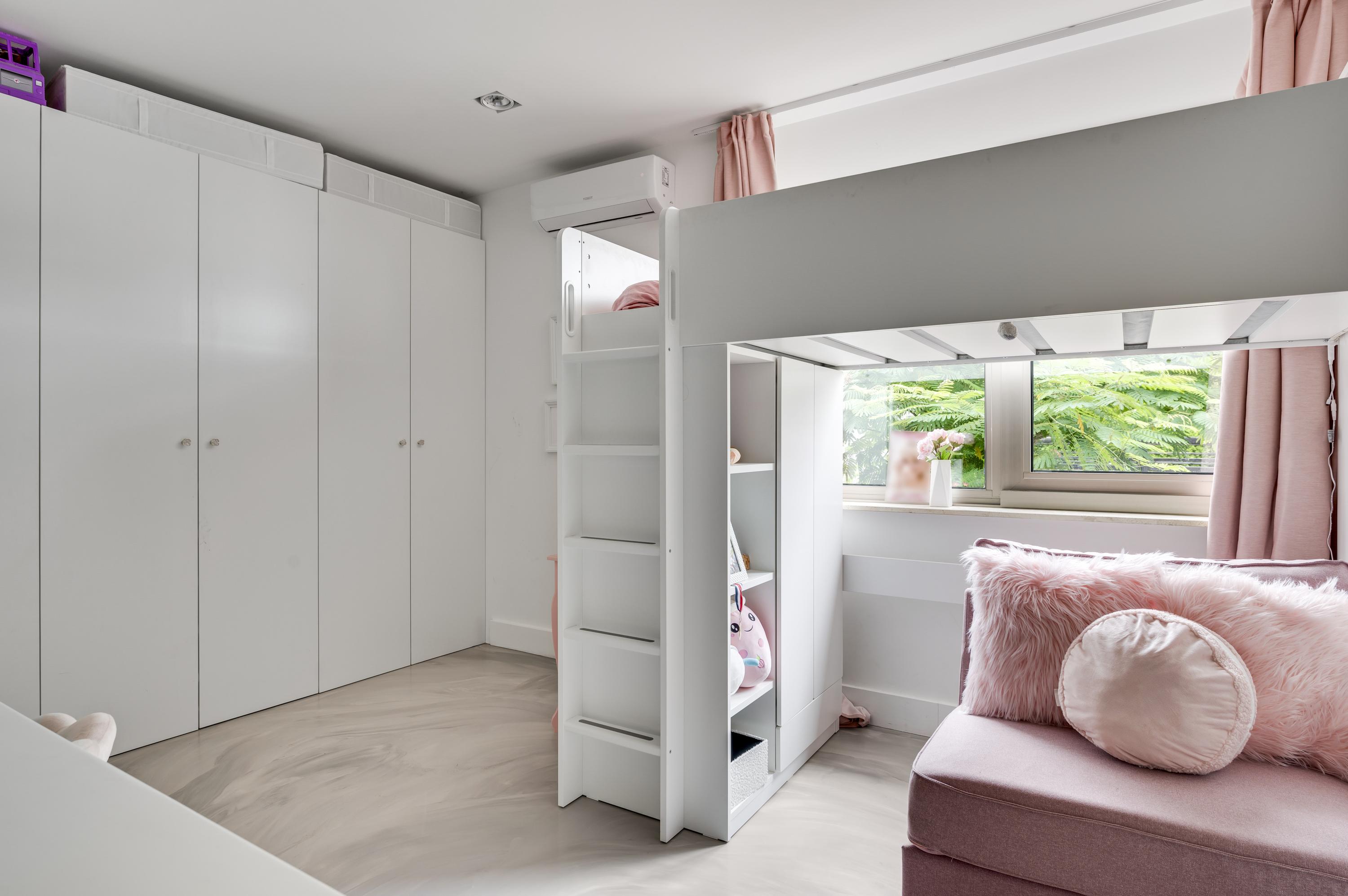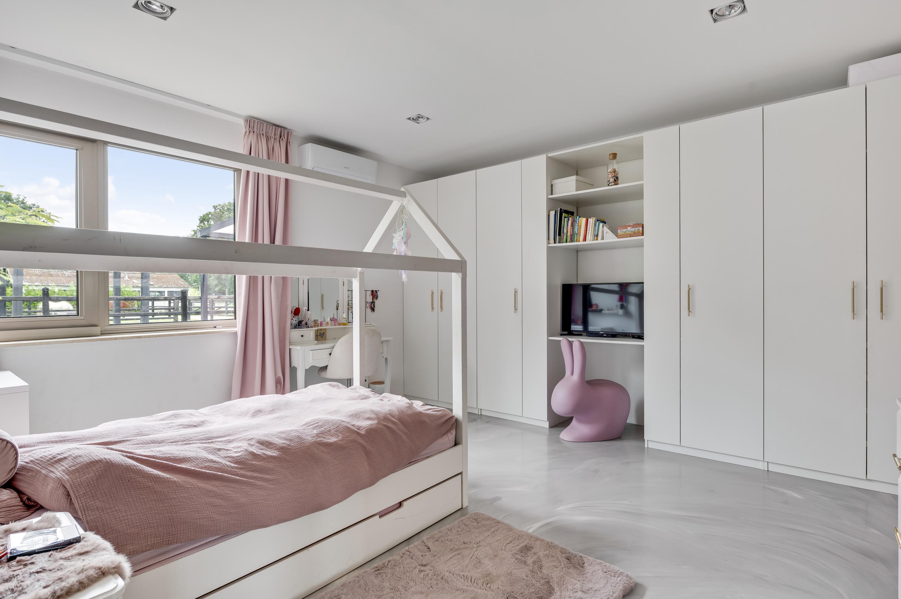 De oostvleugel is volledig ingericht als slaapverblijf. Hier bevinden zich vijf slaapkamers, waaronder een riante master bedroom met eigen kleedkamer, luxe badkamer en directe toegang tot een overdekt terras met zicht op de tuin. De overige vier slaapkamers delen twee stijlvolle badkamers, elk voorzien van een ligbad, inloopdouche, dubbele wastafel en wandcloset.