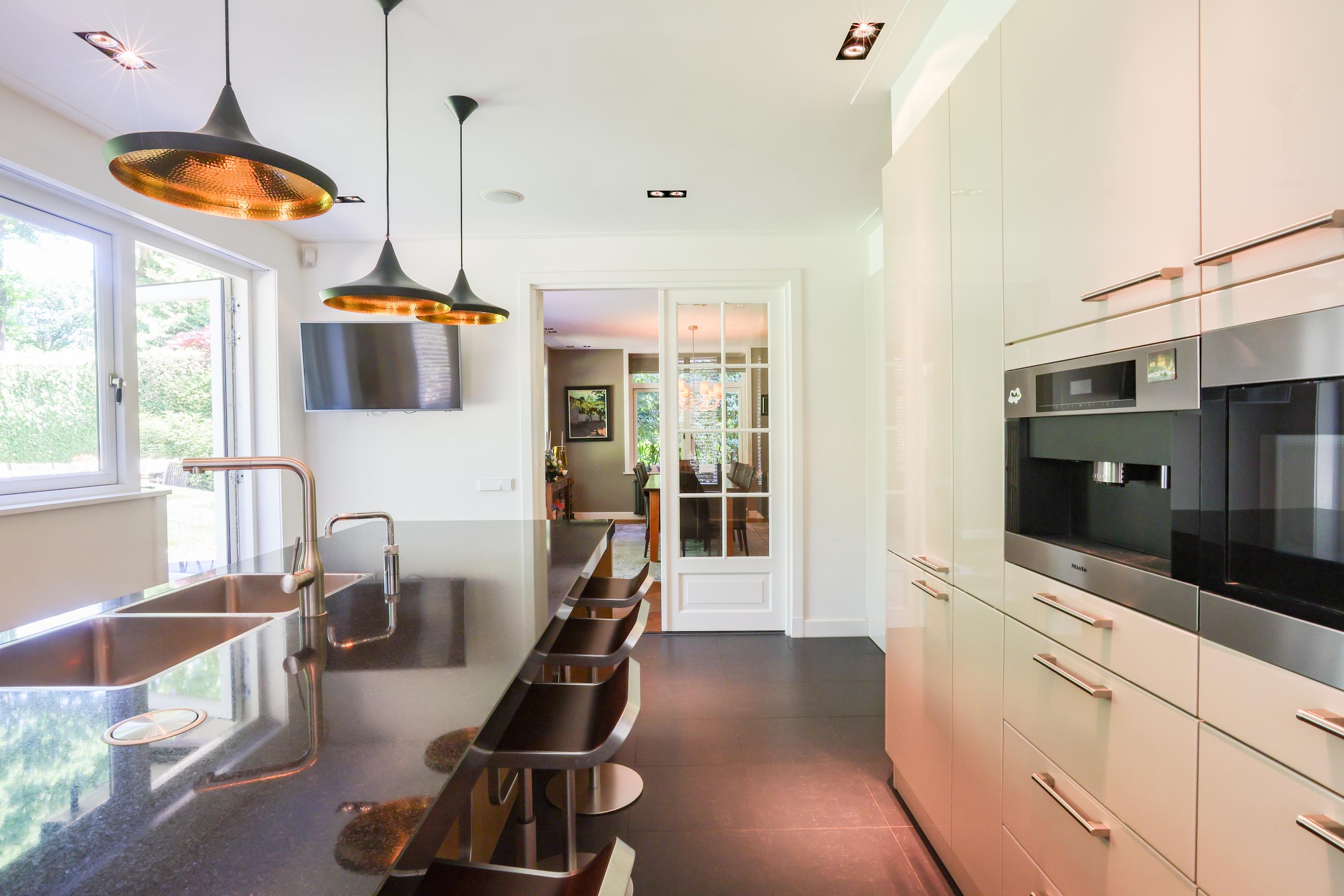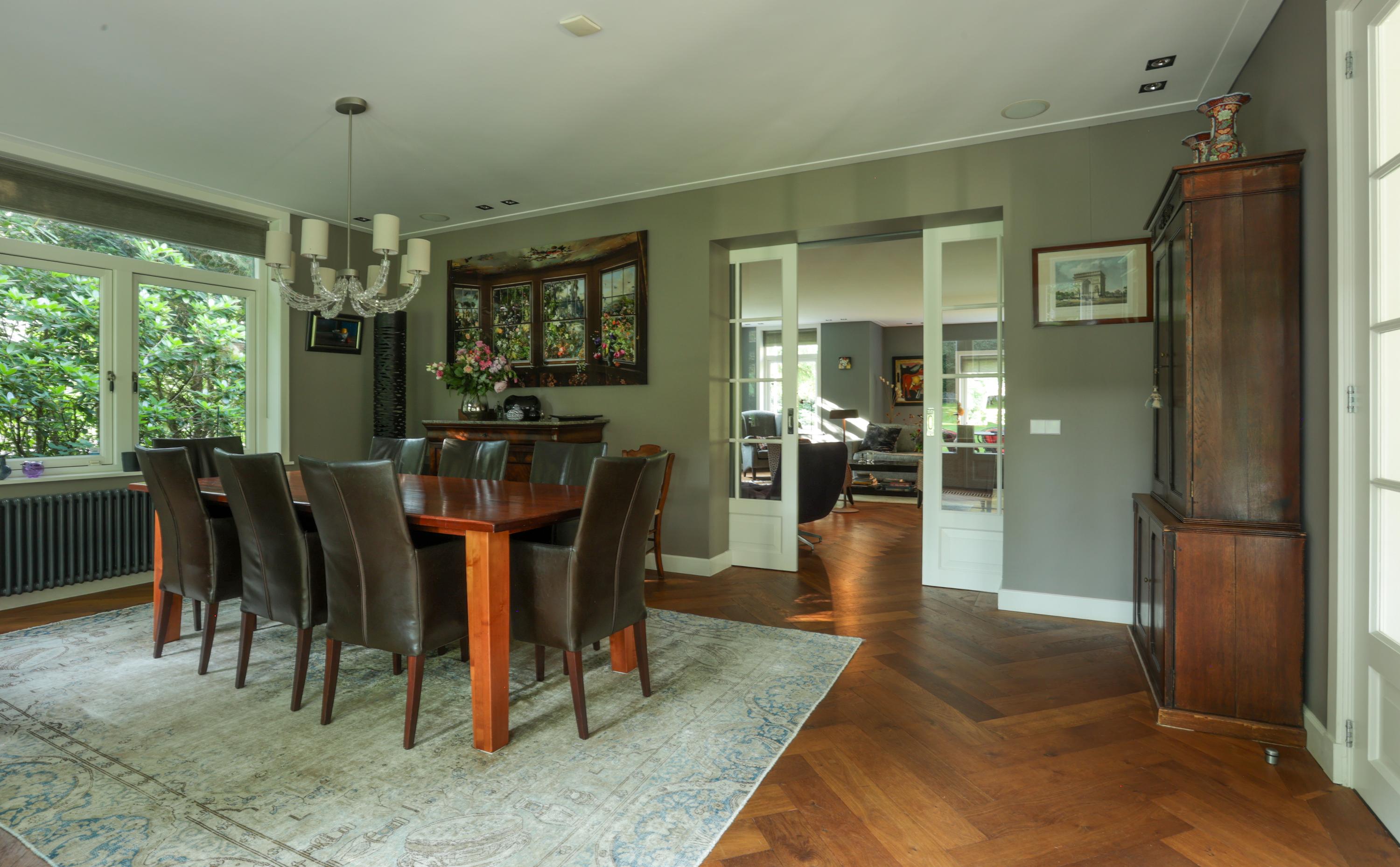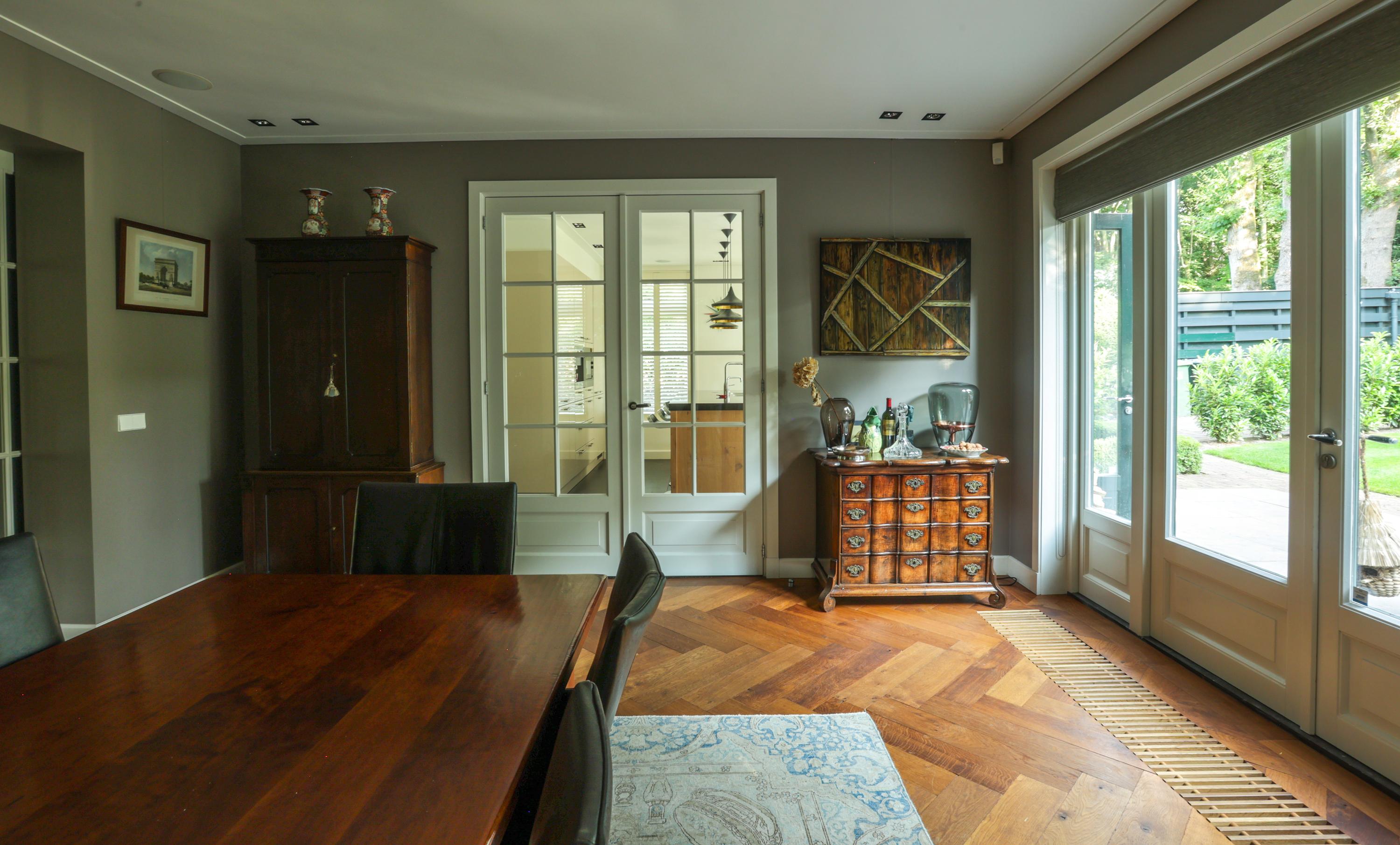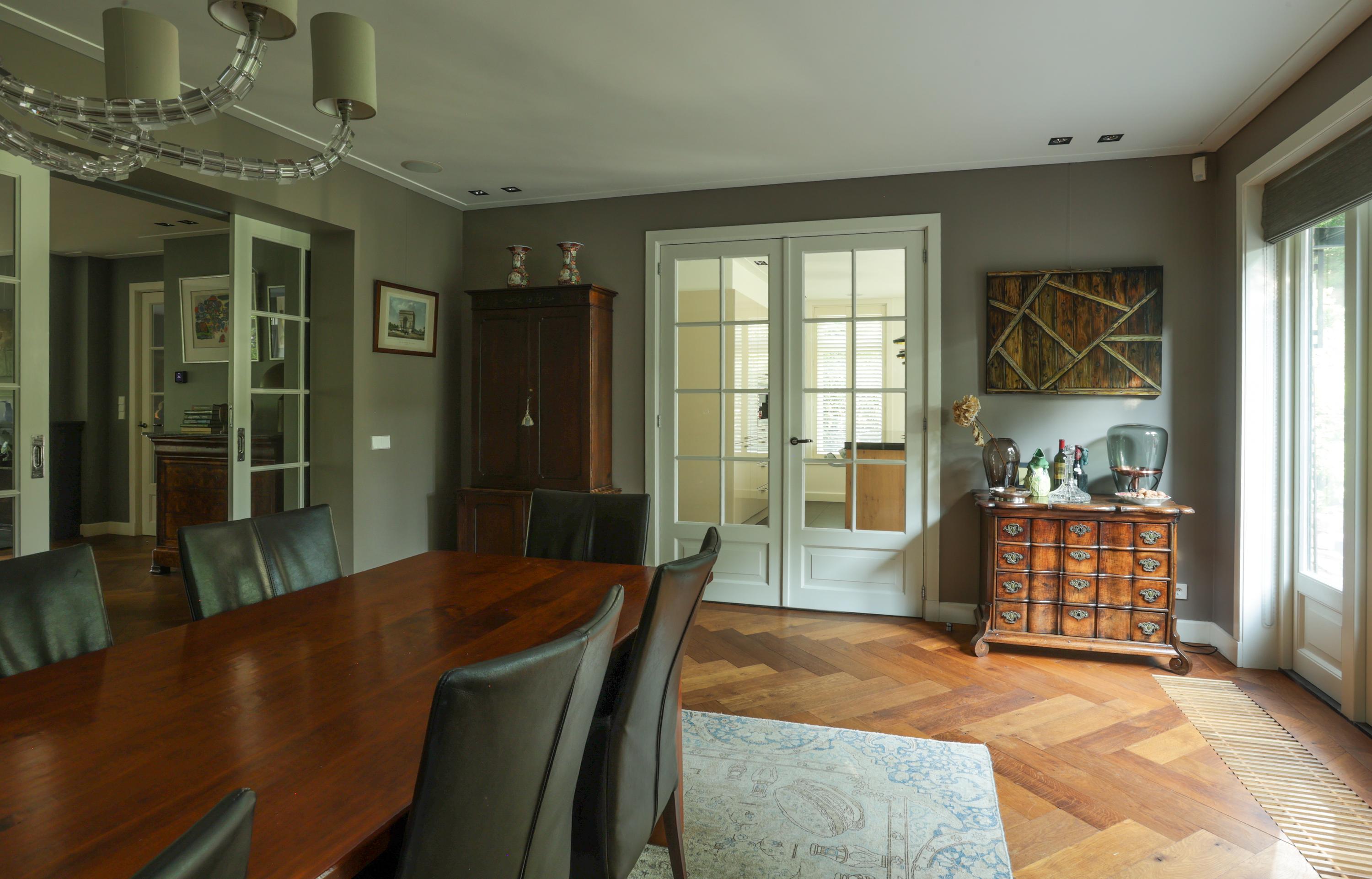 De royale hal biedt toegang tot een gastentoilet, praktische bij/waskeuken en een verrassend compleet souterrain met logeerkamer, bergruimte én een eigen wijngedeelte. De woonkamer is meer dan sfeervol, een prachtige parketvloer, ruim en voorzien van open haard. Via de en suite eetkamer ook met dezelfde parketvloer (en zie ook de impressie hoe de eetkamer eruit ziet met een lichtstraat), bereik je de moderne lichte woonkeuken, voorzien van alle denkbare inbouwapparatuur. Vanuit de keuken en eetkamer is er direct contact met het terras en de tuin – koken met uitzicht, noemen we dat.