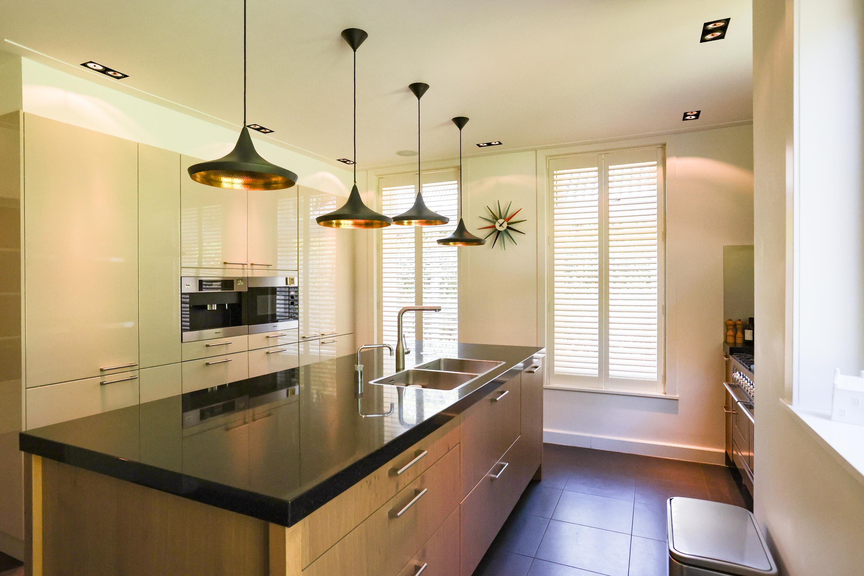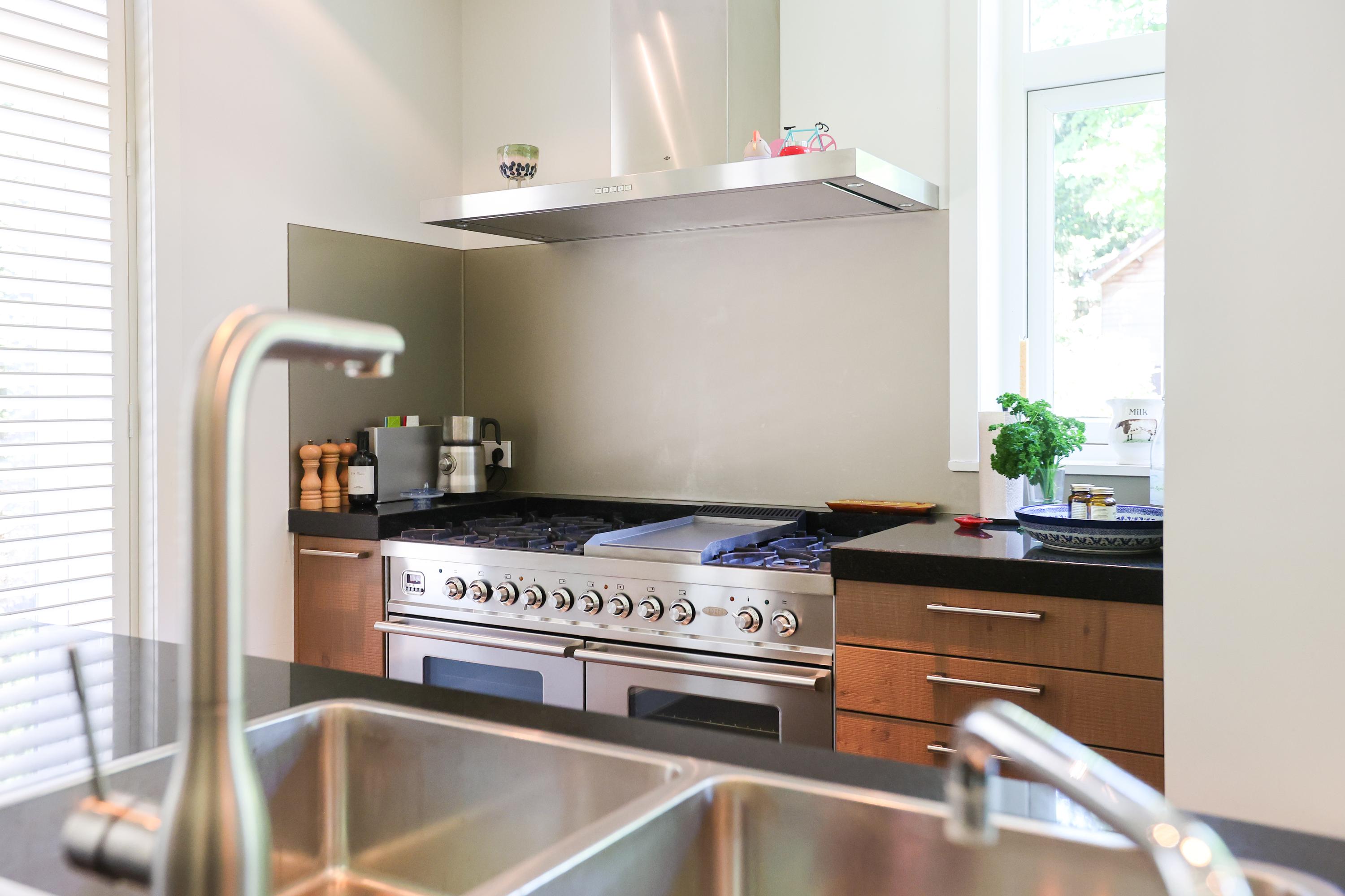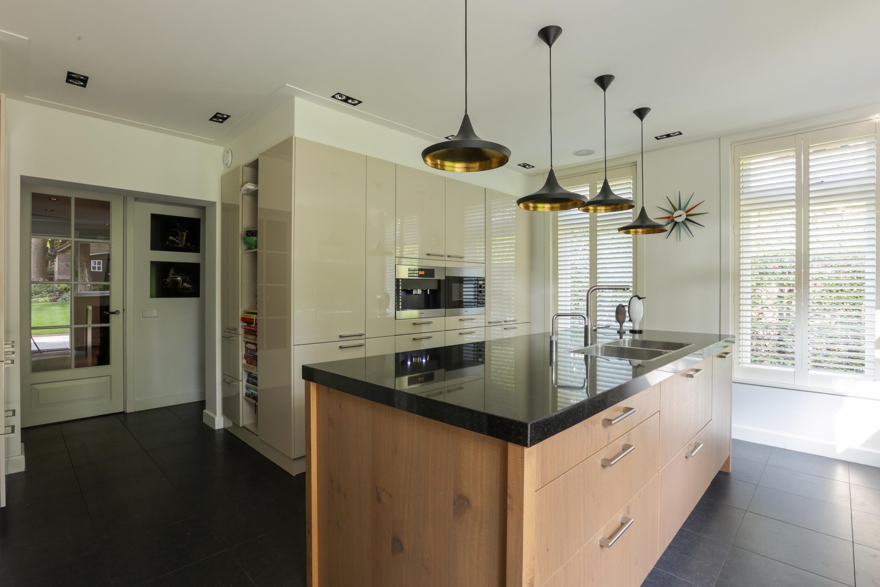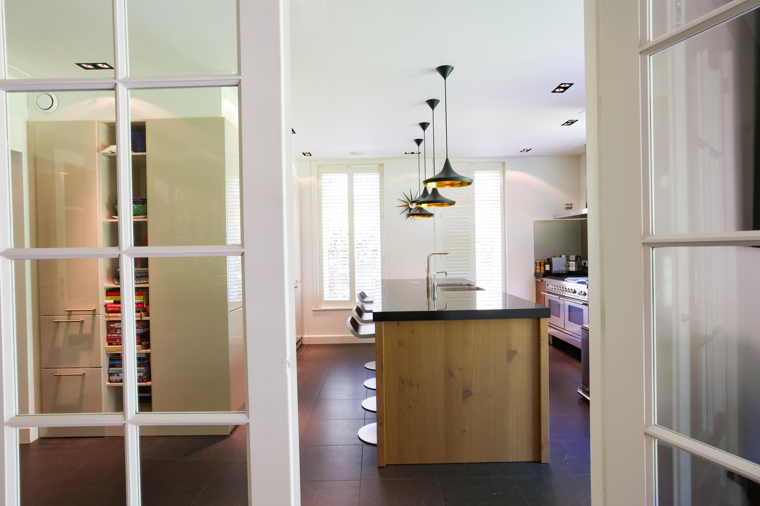De royale hal biedt toegang tot een gastentoilet, praktische bij/waskeuken en een verrassend compleet souterrain met logeerkamer, bergruimte én een eigen wijngedeelte. De woonkamer is meer dan sfeervol, een prachtige parketvloer, ruim en voorzien van open haard. Via de en suite eetkamer ook met dezelfde parketvloer (en zie ook de impressie hoe de eetkamer eruit ziet met een lichtstraat), bereik je de moderne lichte woonkeuken, voorzien van alle denkbare inbouwapparatuur. Vanuit de keuken en eetkamer is er direct contact met het terras en de tuin – koken met uitzicht, noemen we dat.