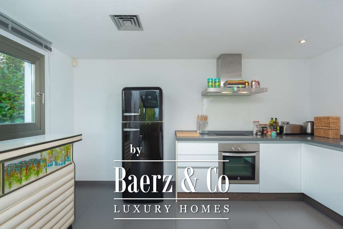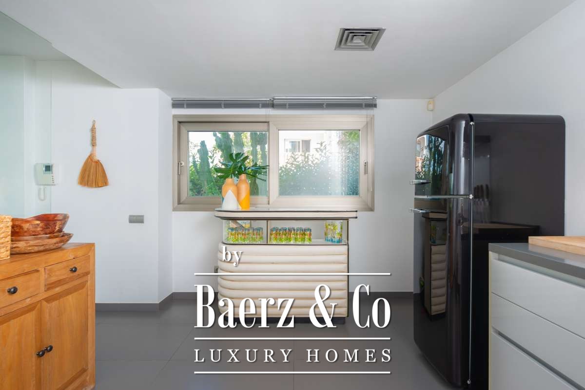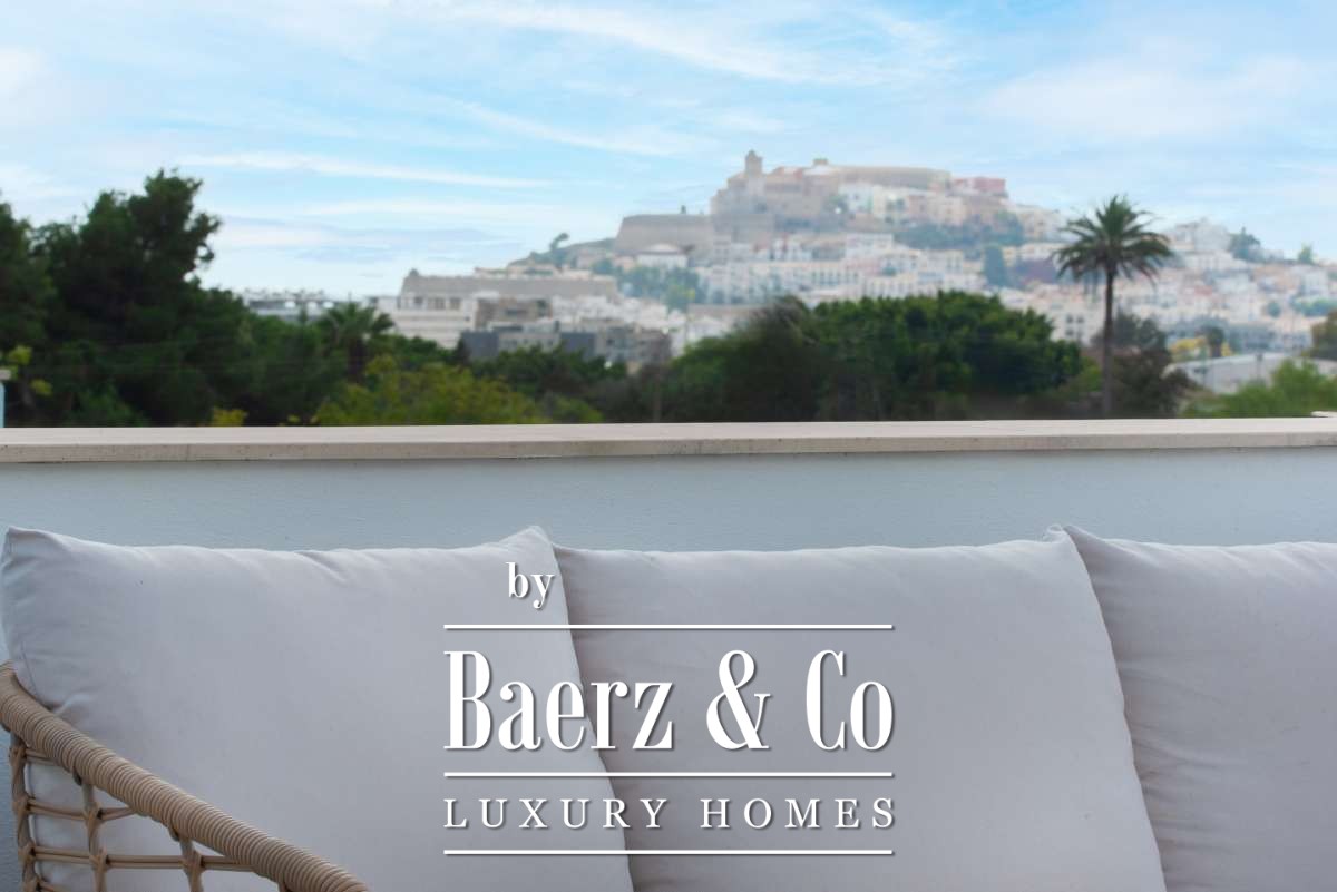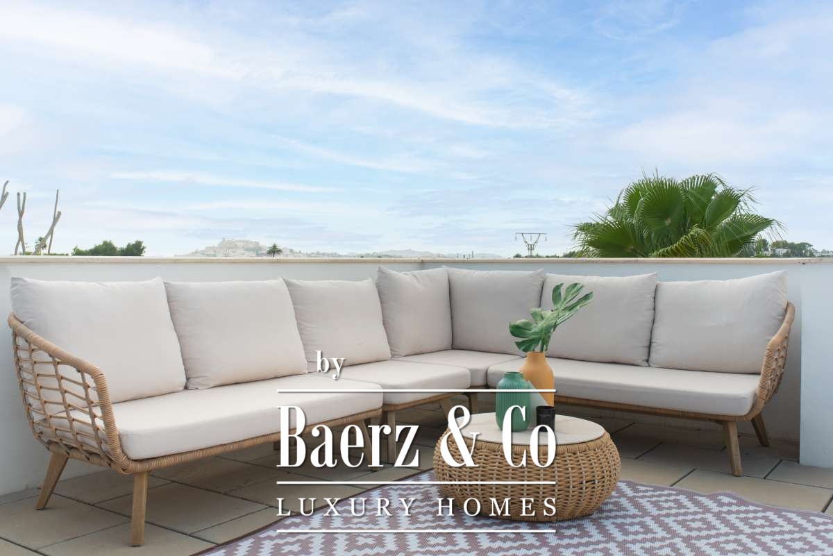 De buitenruimte rondom het privézwembad is ontworpen voor ontspanning en zomerplezier. Hier kunt u genieten van zonnige dagen op de loungers, dineren in de buitenlucht of sfeervolle avonden organiseren met vrienden en familie rondom de barbecue. Het absolute hoogtepunt van deze woning is het ruime dakterras. Vanaf hier geniet u van een panoramisch uitzicht over de omgeving én het iconische silhouet van Dalt Vila in de verte, een magisch decor voor indrukwekkende zonsondergangen. Het dakterras is bovendien voorzien van een buitendouche, perfect om af te koelen tijdens warme zomerdagen of na een sessie ochtendyoga onder de blauwe hemel.Deze townhouse in Jesús biedt een ontspannen, instapklare woonervaring waar binnen en buitenleven harmonieus samenkomen. Een ideale woning voor wie zoekt naar comfort, sfeer en het ultieme Ibiza-gevoel, het hele jaar door.This townhouse in Jesús offers a relaxed, move-in-ready living experience where indoor and outdoor life blend harmoniously. An ideal home for those seeking comfort, atmosphere and the ultimate Ibiza lifestyle all year round.