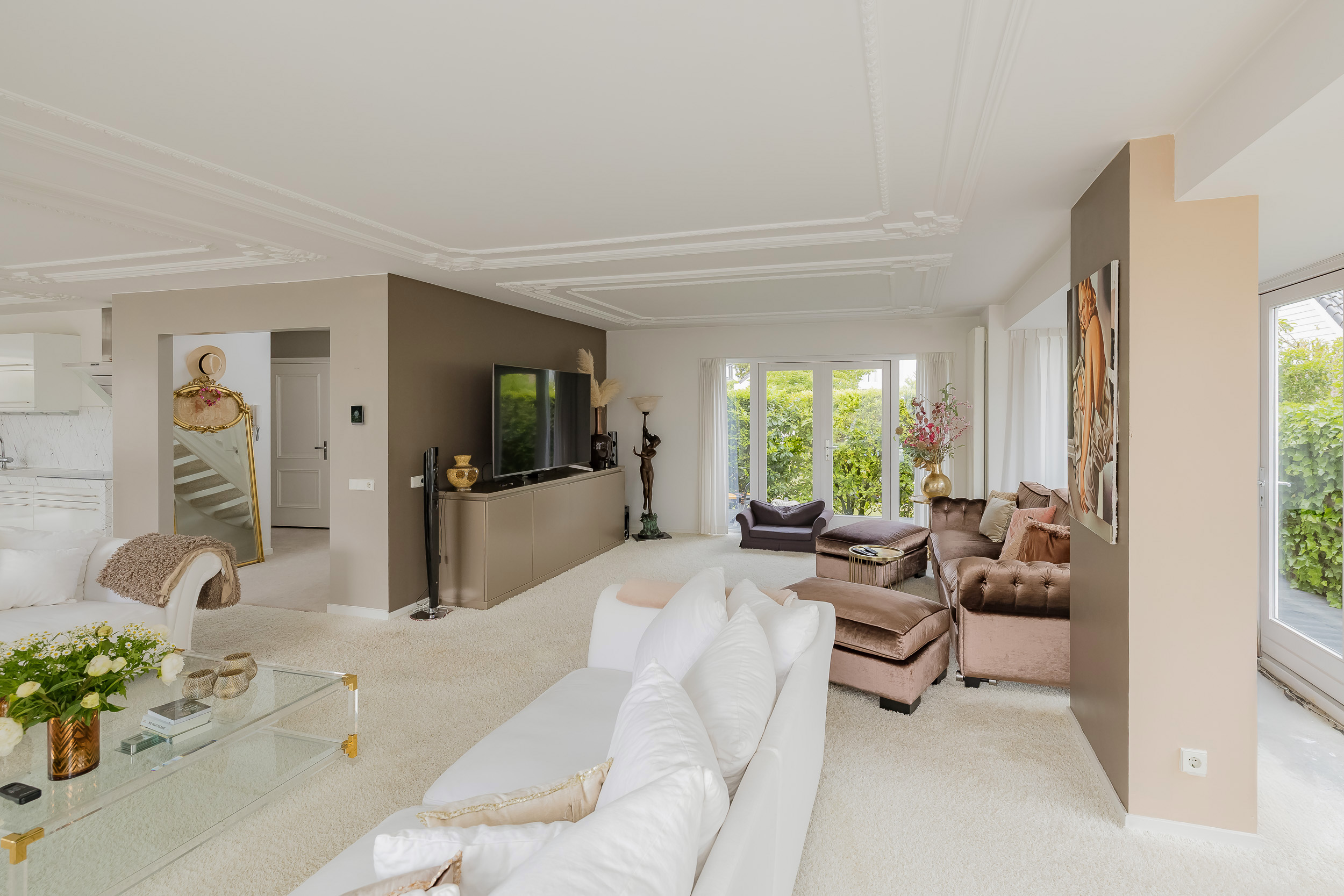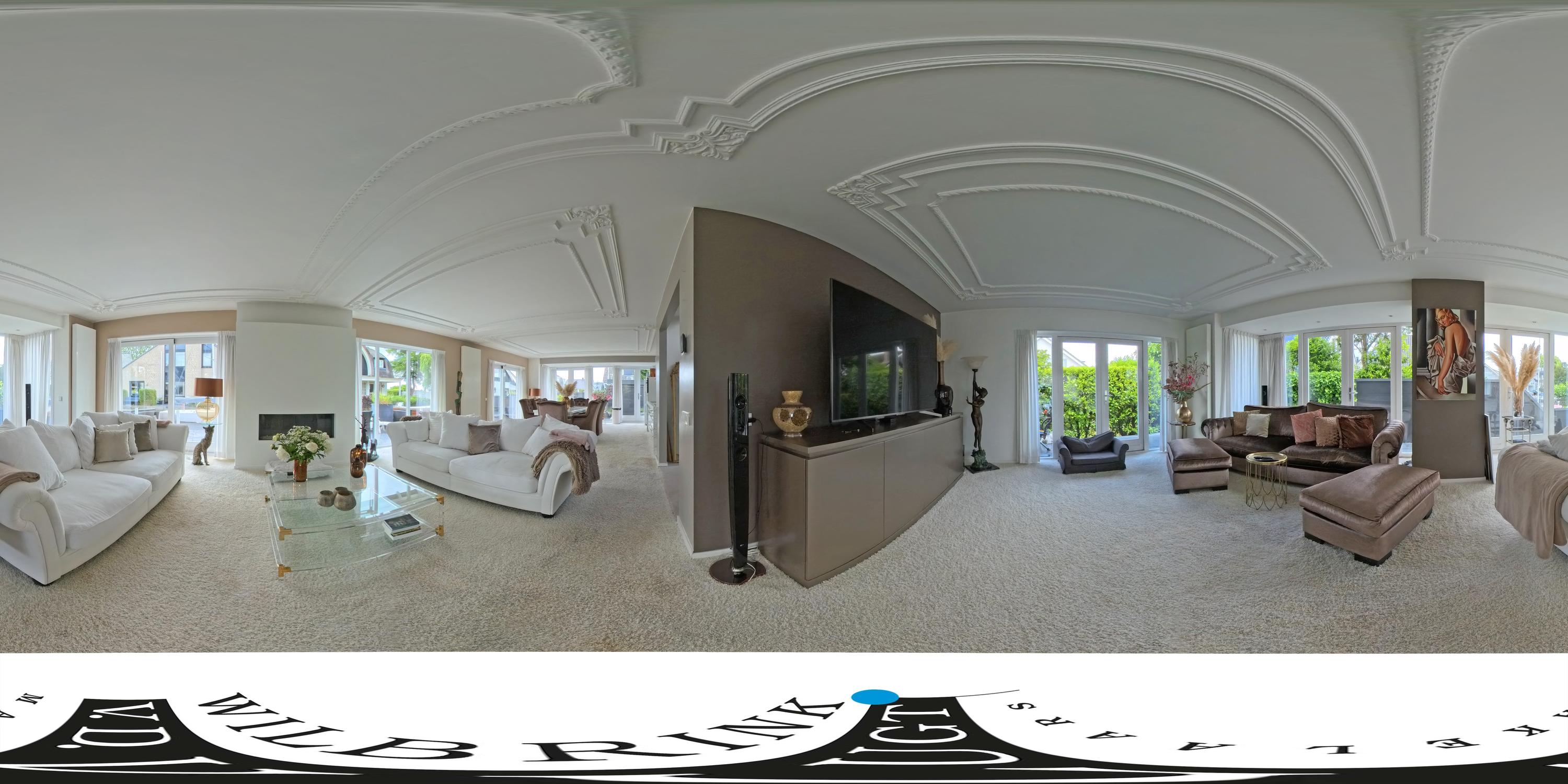 U betreedt de woning via een royale hal met vide en de trap naar boven. Een garderobe-nis met toiletruimte en meterkast zorgen voor een praktische indeling. De woonkamer is ruim, licht en sfeervol en voorzien van een grote erker, klassieke sierlijsten aan het plafond en een gezellige gashaard. Dankzij drie paar dubbele openslaande deuren én een schuifpui staat de living in directe verbinding met het zonnige terras aan het water.