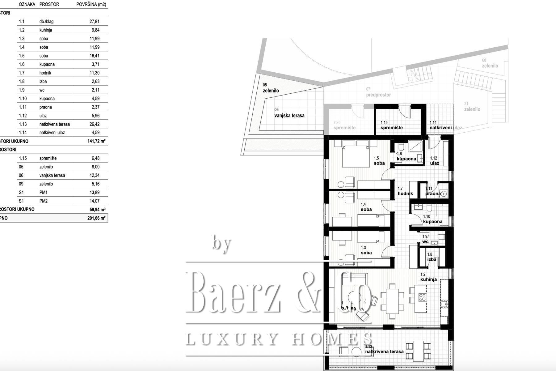 Elke van de vier slaapkamers biedt ruimte en balans, waarbij de master suite 21,91 m² beslaat en de overige drie elk 14,20 m² groot zijn. Doordachte details zoals drie stijlvolle badkamers, een inloopkast, wasruimte, voorraadruimte en berging dragen bij aan het woongenot. Een overdekt terras van 26,14 m² brengt het panoramische uitzicht op de Adriatische Zee naar het dagelijks leven, aangevuld met extra buitenterrassen en een aangelegde tuin.