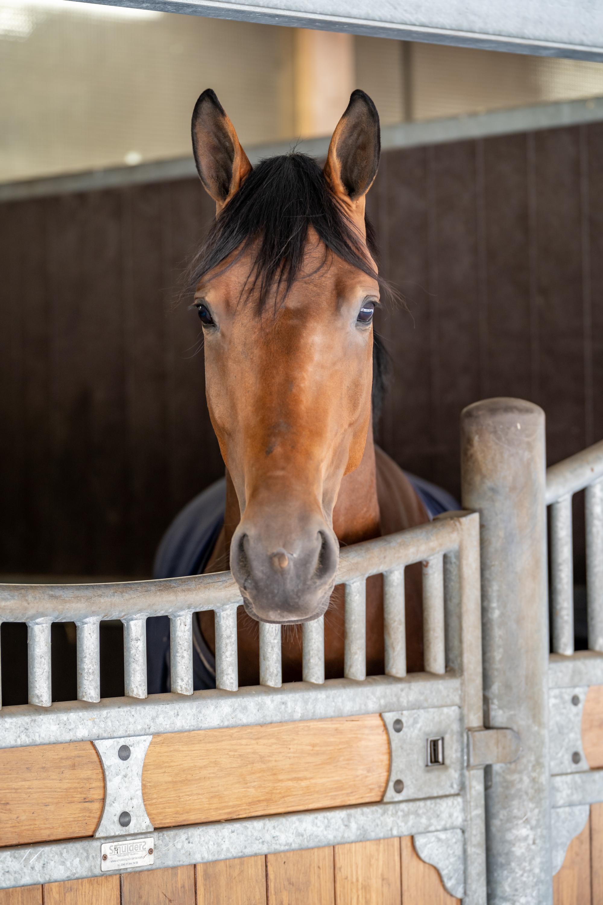 De 4 boxen (ca. 3x3,5 mtr.) aan de rechterzijde zijn voorzien van verlaagde bamboe voorwanden met draaideuren en kunststof tussenwanden. Deze stallen beschikken over 2 wasplaatsen, welke zijn voorzien van warmwater. Ook is er een berging aanwezig.