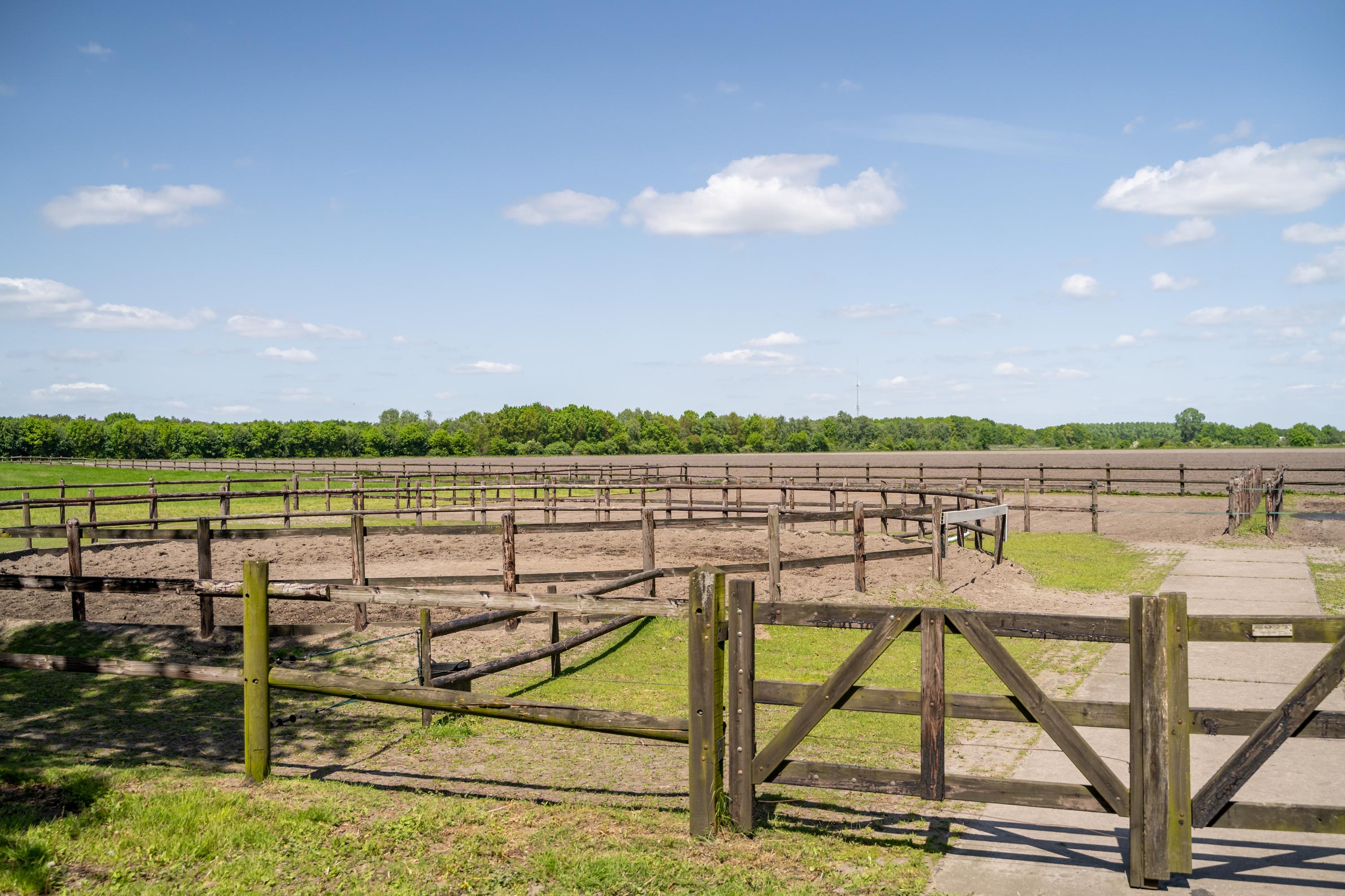 De longeercirkel is voorzien van een zandbodem en en een houten omheining.