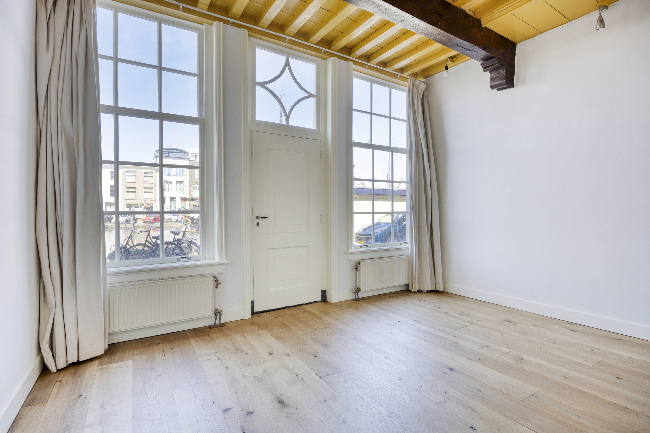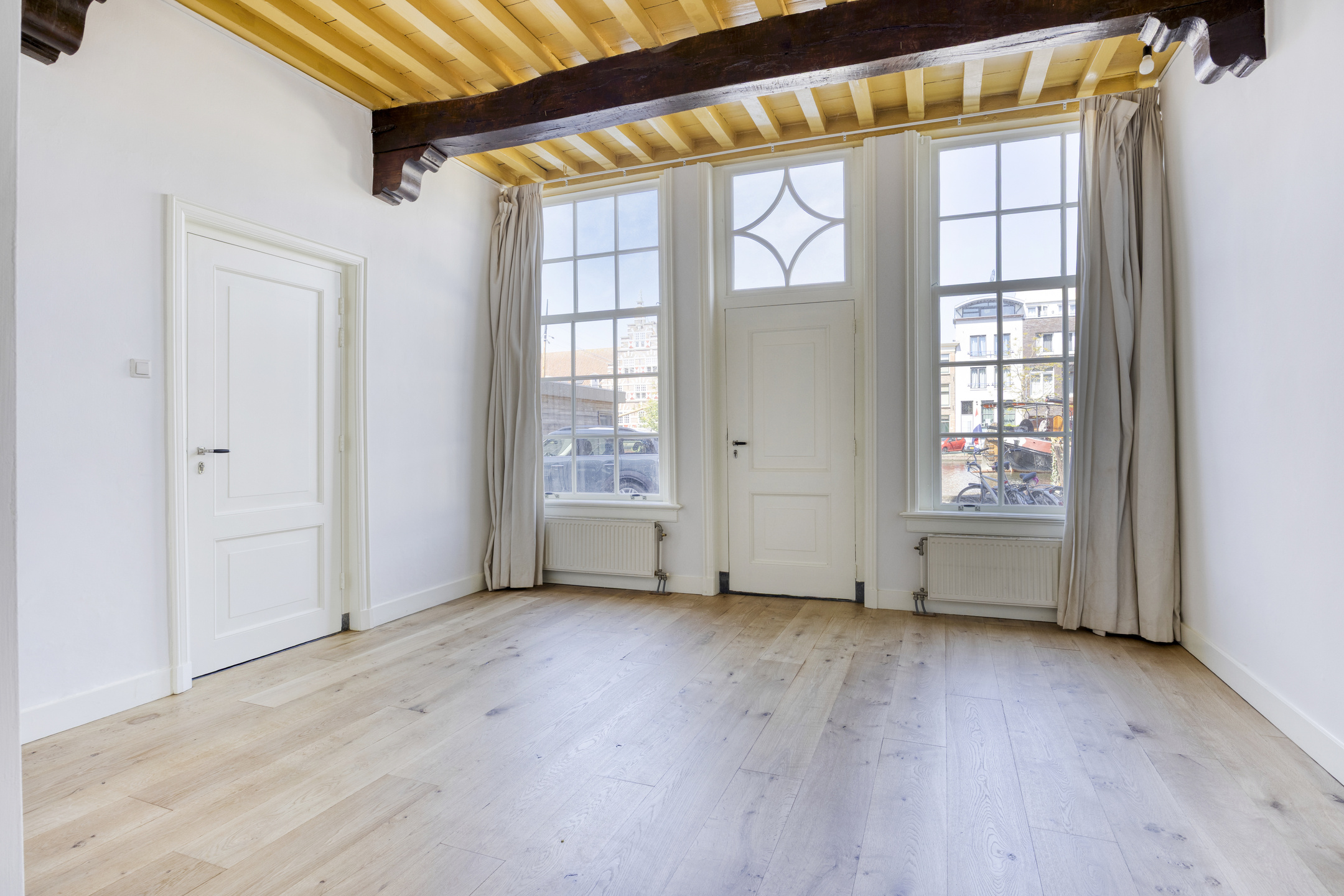 Overloop met trap naar de 2e etage. Voorkamer met hoge balkenplafonds en prachtig uitzicht over het Galgewater. Achterkamer met openslaande deuren naar het dakterras.