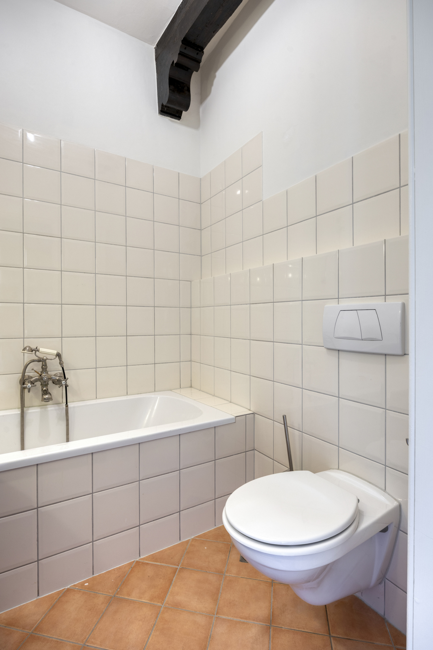 Overloop. Ruime slaapkamers met hoge balkenplafonds aan voor- en achterzijde. Moderne badkamer met douche, wc en wastafel.