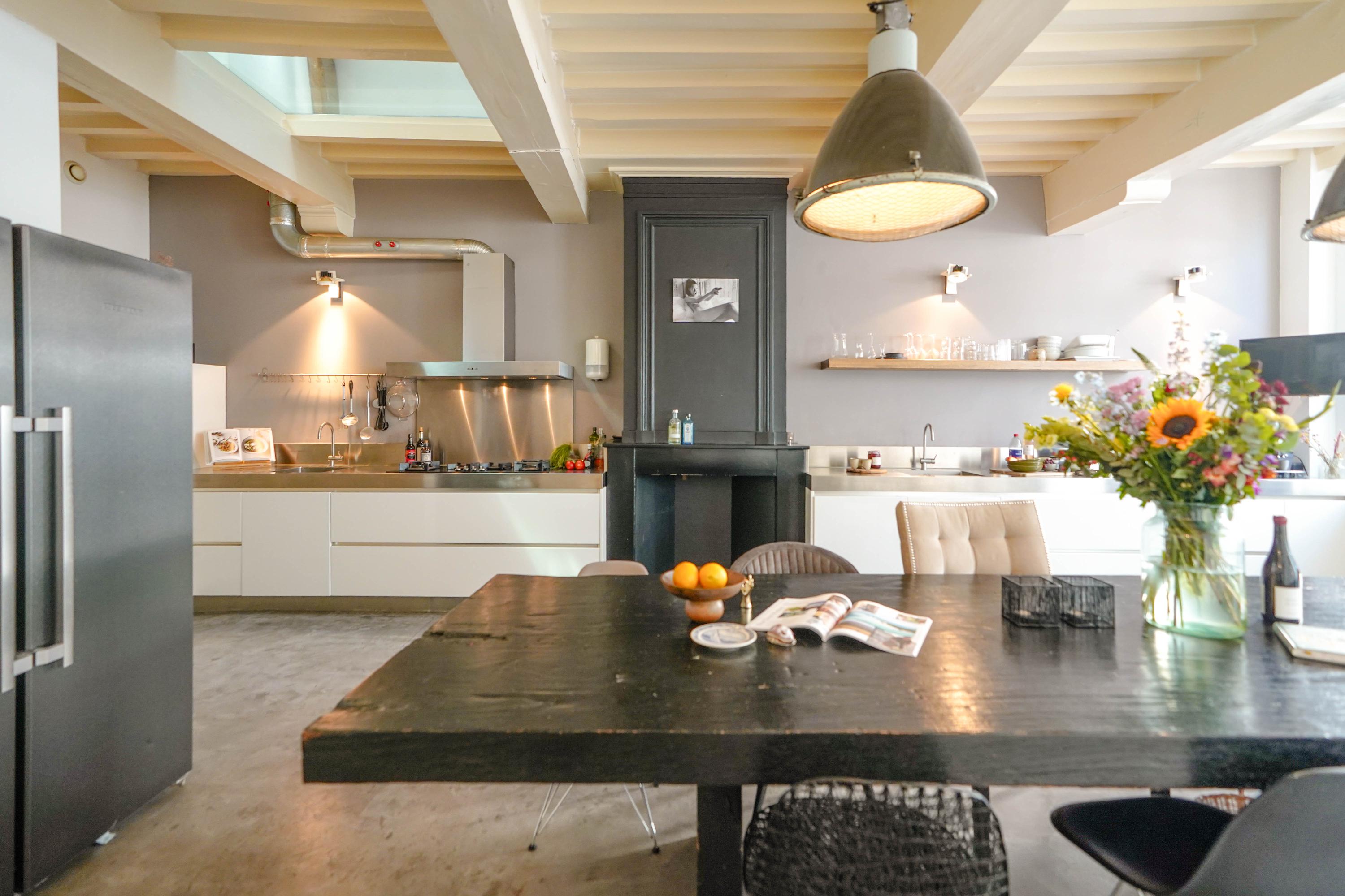 Het voorhuis is het oorspronkelijke hoofdhuis. Op de begane grond is een winkel gevestigd (kan in verhuurde staat worden gekocht) en hier vindt je nu op de 1e etage de woonkamer van maar liefst 70 m² van waar je uitkijkt over de Rijn en het Stadhuisplein. Aan de achterzijde ligt de woonkeuken met ruimte. Veel ruimte. Met 50 m², lange werkbladen en een eettafel met plek voor 12 is dit nu het hart van het huis. Vanuit hier is ook een van de doorgangen naar het achterhuis langs de binnenplaats wat voor veel lichtinval zorgt. Een etage hoger zijn de slaapverdiepingen. Hier is de woning afgepeld tot de structuur met de prachtige houten sporenkap vol in het zicht. Tussen de sporen zijn hoge Velux ramen aangebracht die zorgen voor een fraaie lichtinval op elk moment van de dag. Aan voorzijde vindt je verdeeld over twee verdiepingen drie slaapkamers, een badkamer en vooral veel bergruimte met inbouwkasten en een linnenkamer. Aan achterzijde beslaat de master bedroom met badkamer ensuite de gehele kap met een nok van maar liefst 8 meter hoog.