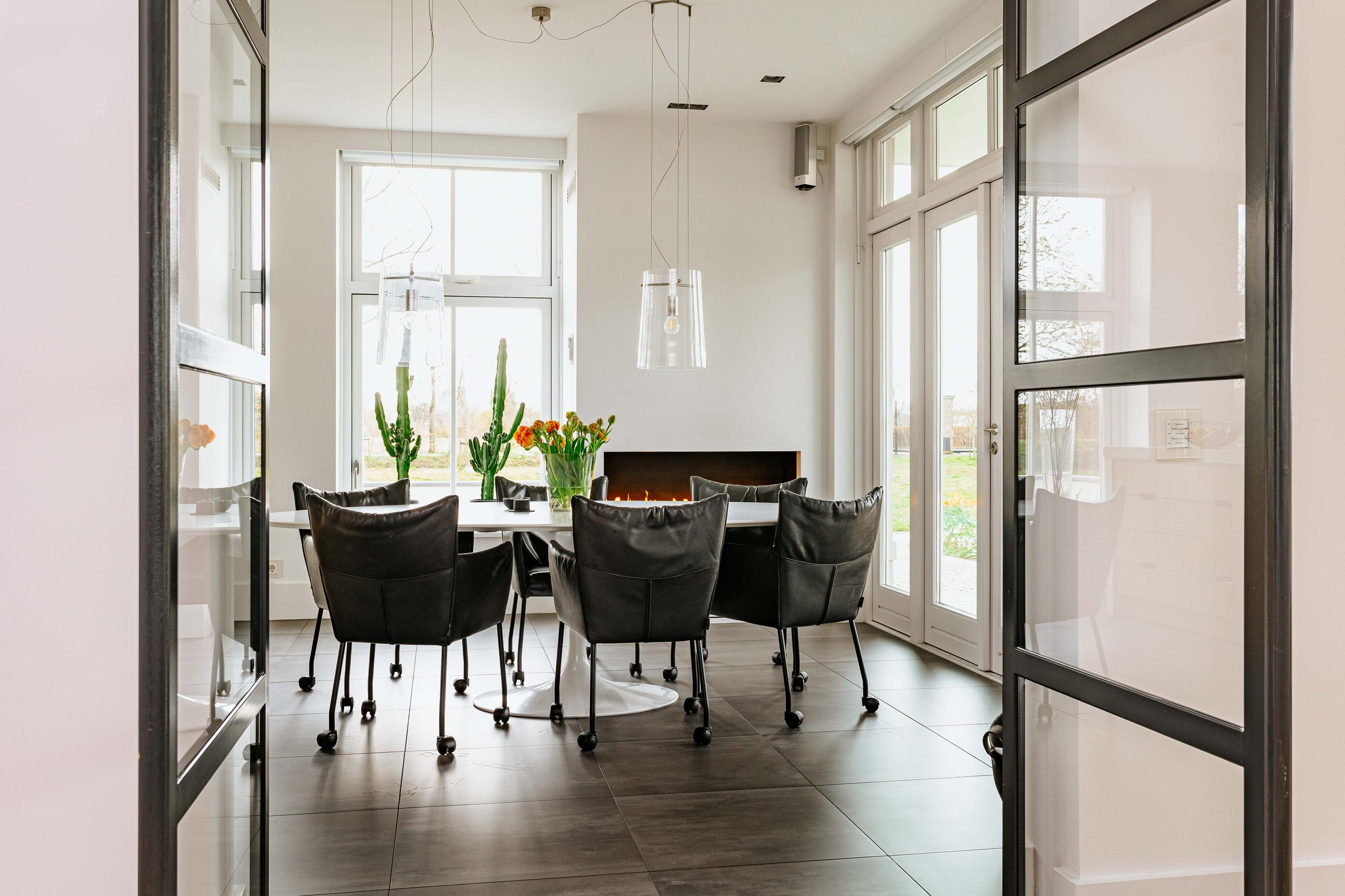 Aan de voorzijde van de woning is de grote luxe woonkeuken, voorzien van een spoeleiland en luxe inbouwapparatuur, een gashaard en openslaande deuren naar het terras. De grote sfeervolle woonkamer heeft eveneens een gashaard, openslaande deuren naar het terras en via stalen draaideuren toegang tot de woonkeuken en de royale gezellige eetkamer. Verborgen achter een deur in de hal bevindt zich de luxe drie-eenheid van slaapkamer, kleedkamer en badkamer. Deze royale ouderslaapkamer met gashaard heeft uitzicht op en toegang tot de tuin. Ook is er een separaat toilet.
