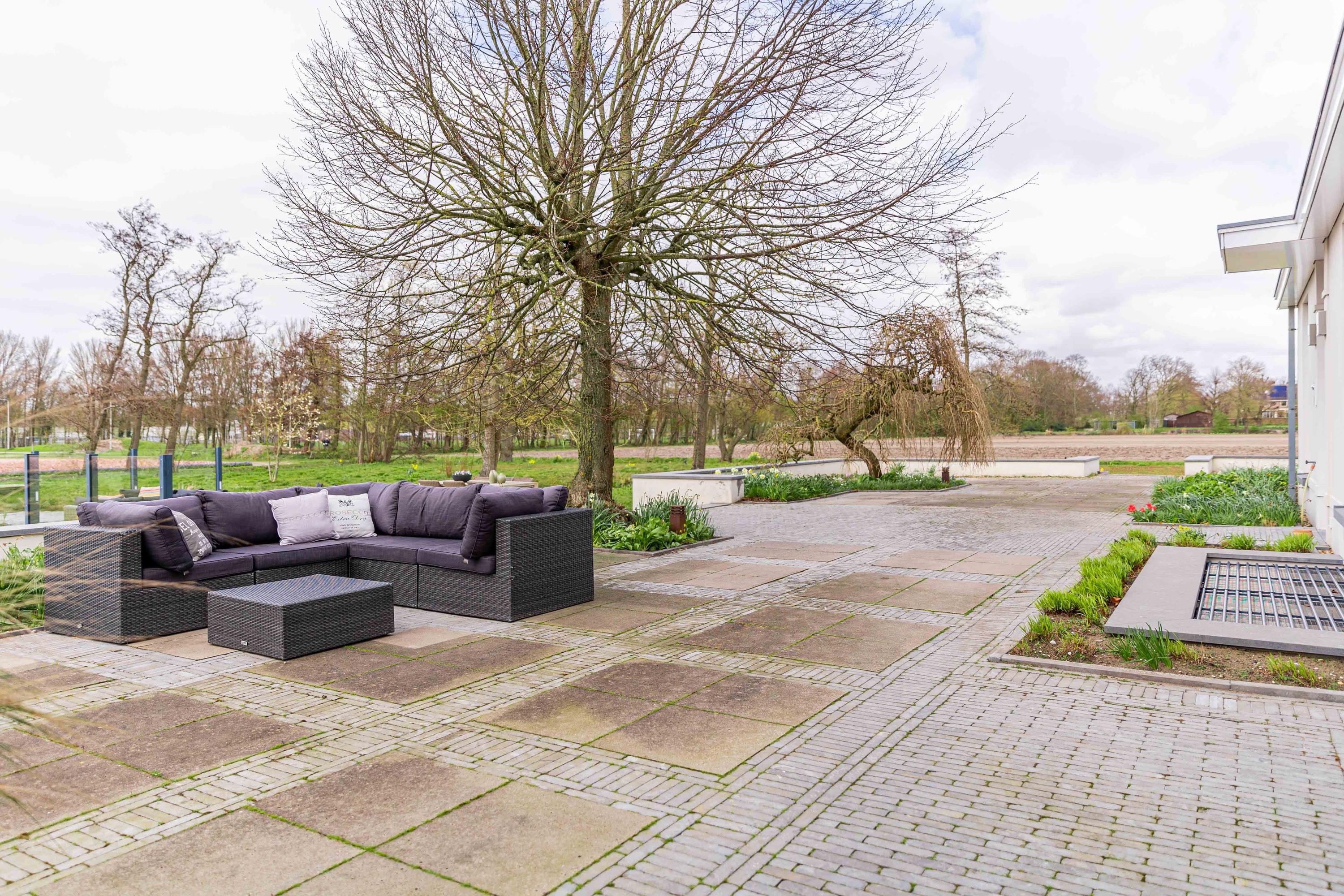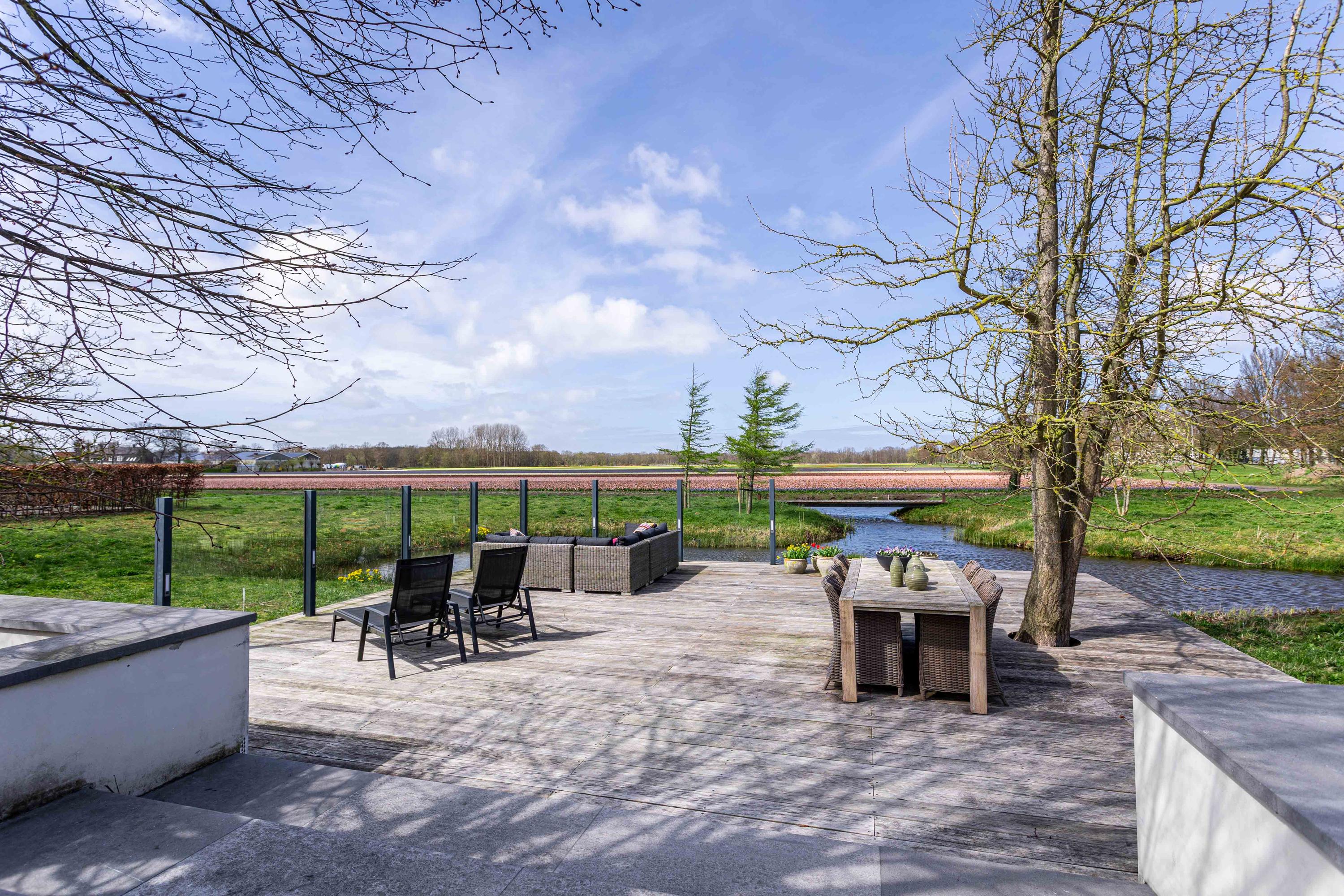 Het perceel is omringd door water en afgesloten met een elektrisch sierhek met anti-inrijpaal. De riante tuin heeft diverse terrassen, veranda's, 2 vijvers, fraaie bomen, hagen en bloemperken. Hier is het heerlijke genieten van de geuren en kleuren van de bollenvelden.