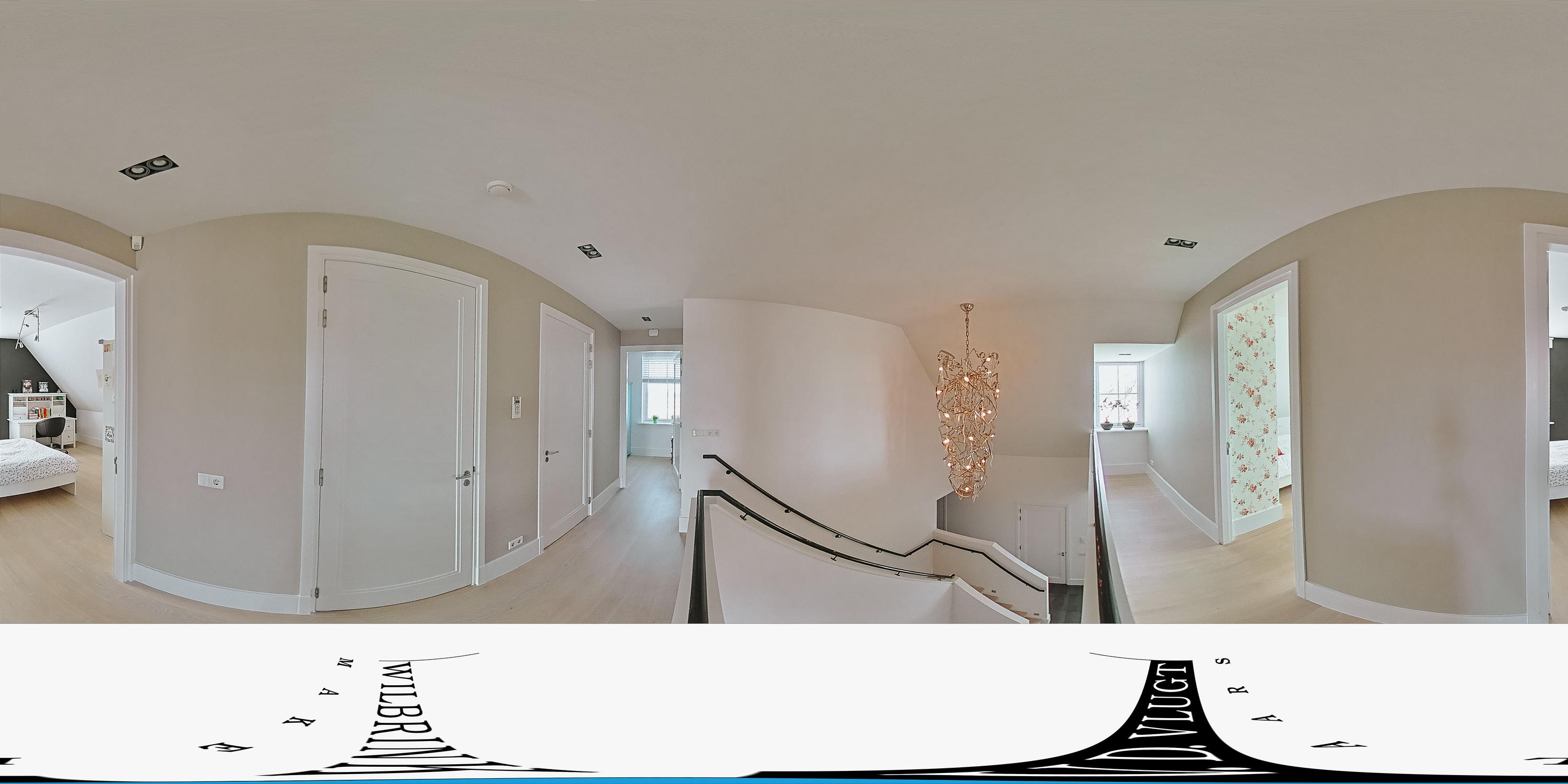 De verlichte, centraal gelegen trap brengt ons naar de slaapverdieping waar 4 royale slaapkamers met fraai uitzicht zijn, een 2e luxe badkamer en apart toilet. Via de trapopgang aan de achterzijde van de woning komen we in een zeer grote kamer met vaste kasten en 6 dakkapellen die thans in gebruik is als werkkamer. Ook hier genieten we van een prachtig uitzicht.
