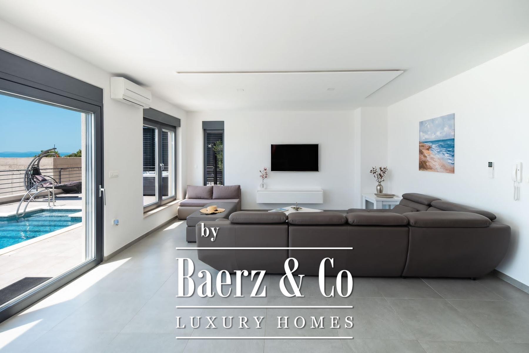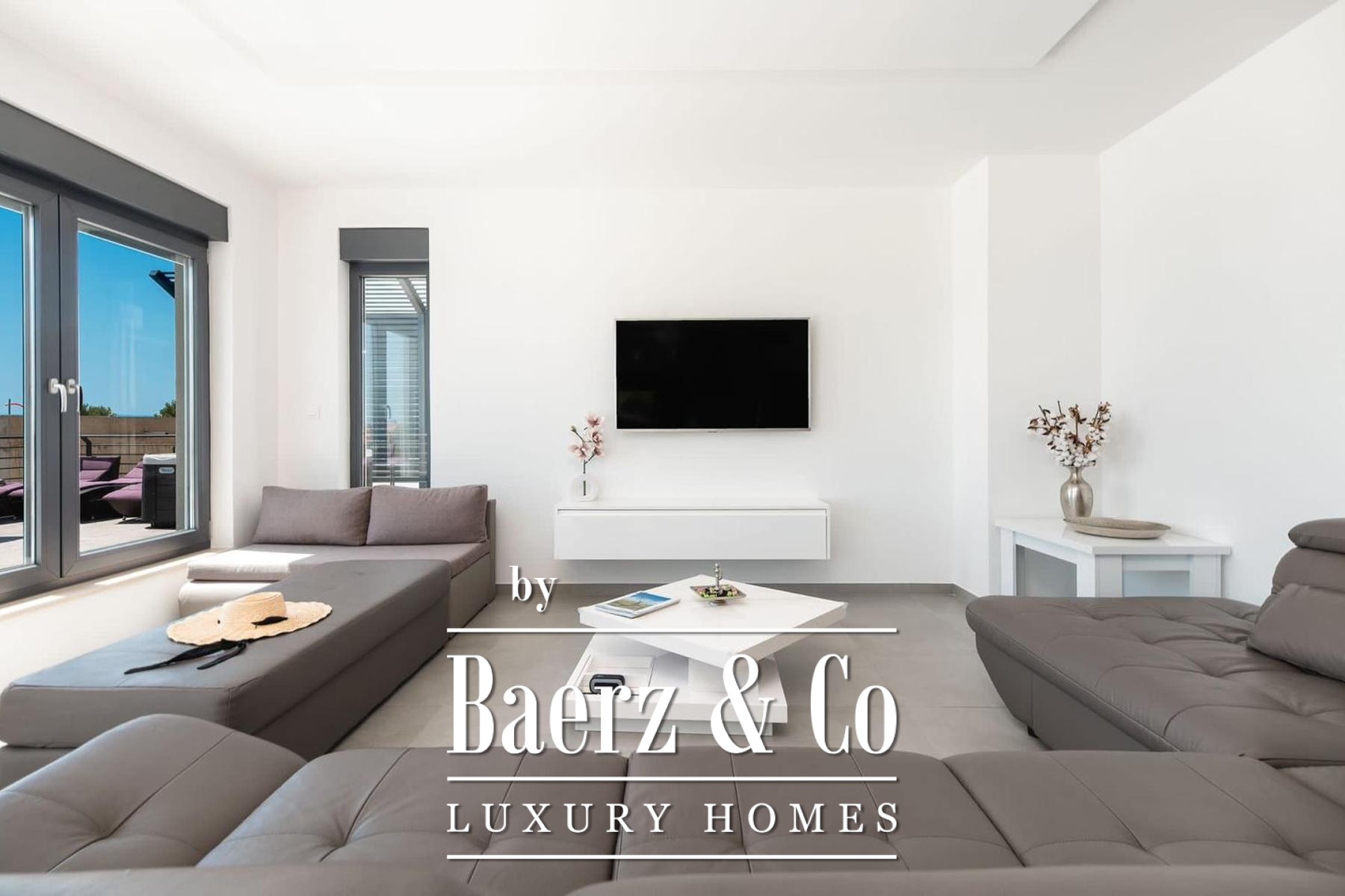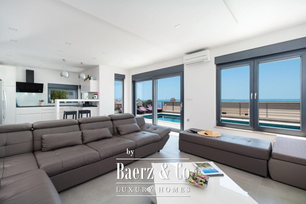 Vloer-tot-plafond glas schuift open vanuit de woonkamer naar het terras met zwembad, jacuzzi, zonneweide en een buitenbarbecue te midden van de privési tuin. Airconditioning door het hele huis garandeert comfort in elk seizoen, terwijl parkeergelegenheid discreet onderdak biedt aan gasten. Deze villa in Makarska biedt een zeldzaam samenspel van mediterraan licht en hedendaags design.