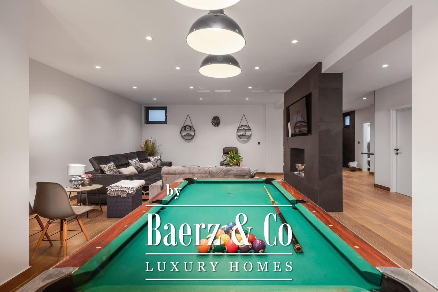 De architectuur strekt zich uit over drie niveaus. Het souterrain is volledig gericht op ontspanning en beschikt over fitnessapparatuur, een biljarttafel, een ruime sofa en televisie, een sauna met douche, een apart toilet en opbergruimte. De begane grond verwelkomt met een open keuken, eetgedeelte en woonkamer, aangevuld met een badkamer en een gastenslaapkamer. Boven beschikken drie slaapkamers over eigen en-suite badkamers en toegang tot een aparte wasruimte, wat privacy en gebruiksgemak biedt.