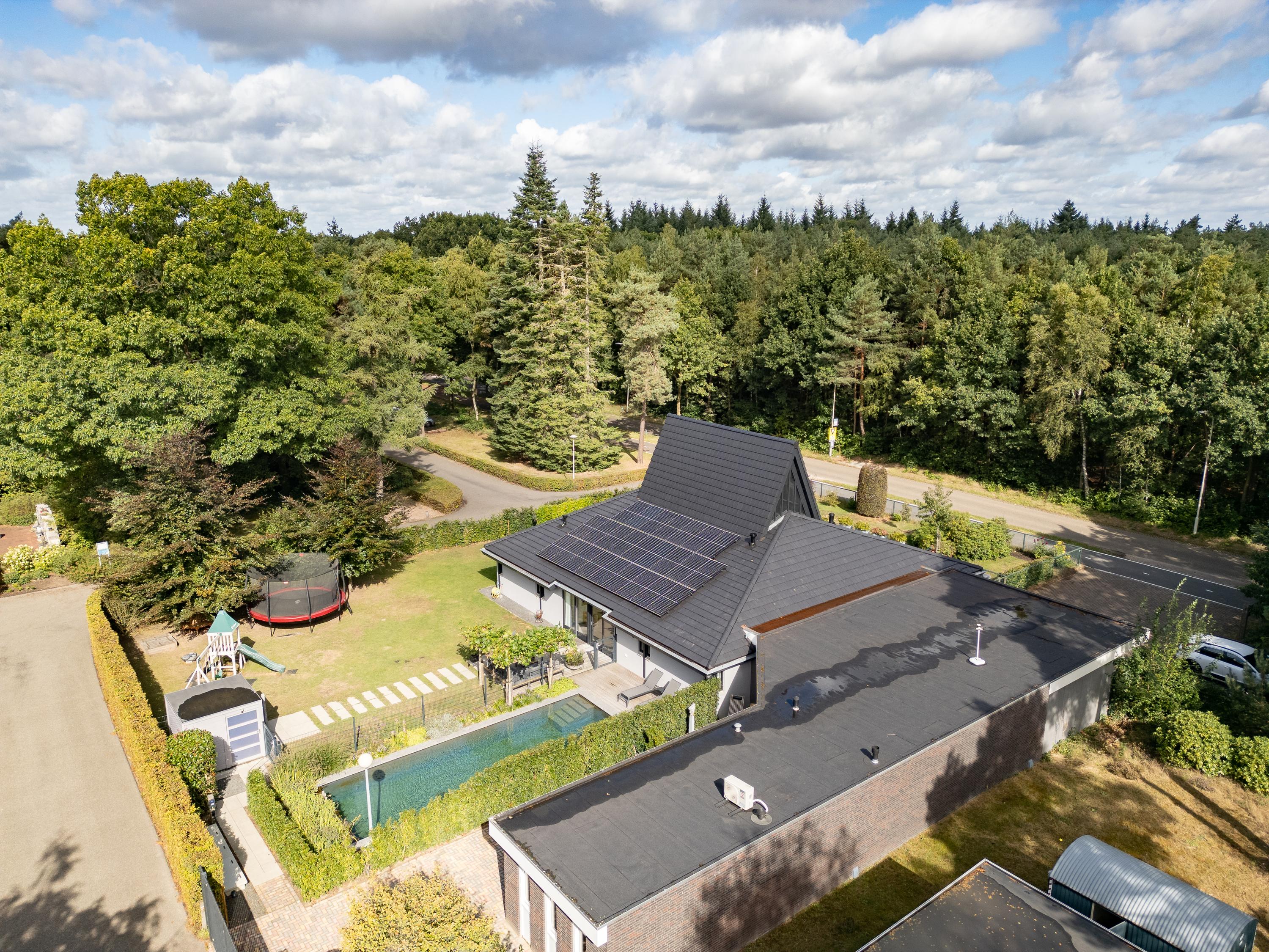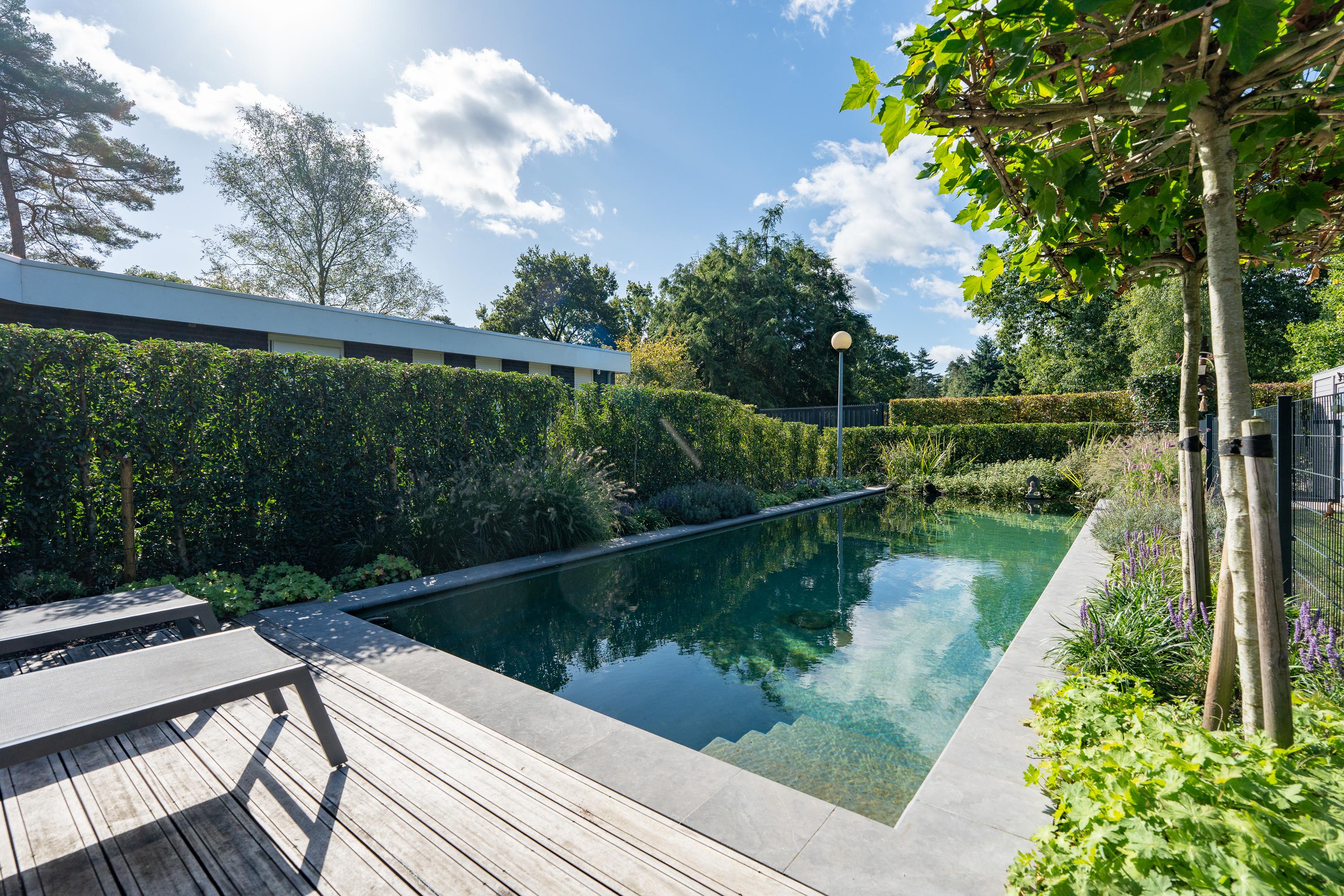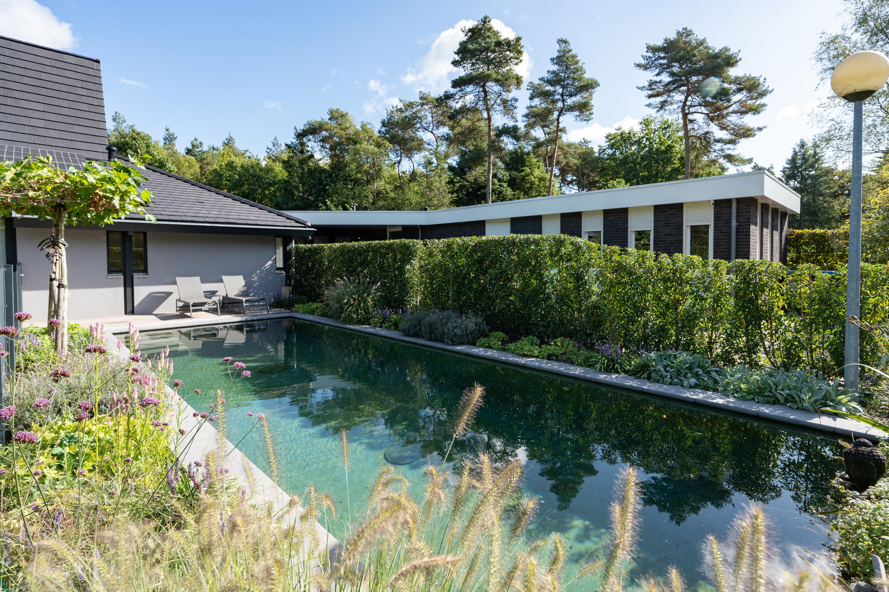 Rondom de woning ligt een verzorgde voor, zij en achtertuin, ingericht met meerdere terrassen waardoor op elk moment van de dag een fijne plek in de zon of schaduw te vinden is. Ook is er nog een extra berging. De omheinde zwemvijver is een echte blikvanger en geeft de tuin een bijzondere uitstraling. Op eigen terrein is bovendien ruime parkeergelegenheid aanwezig.
