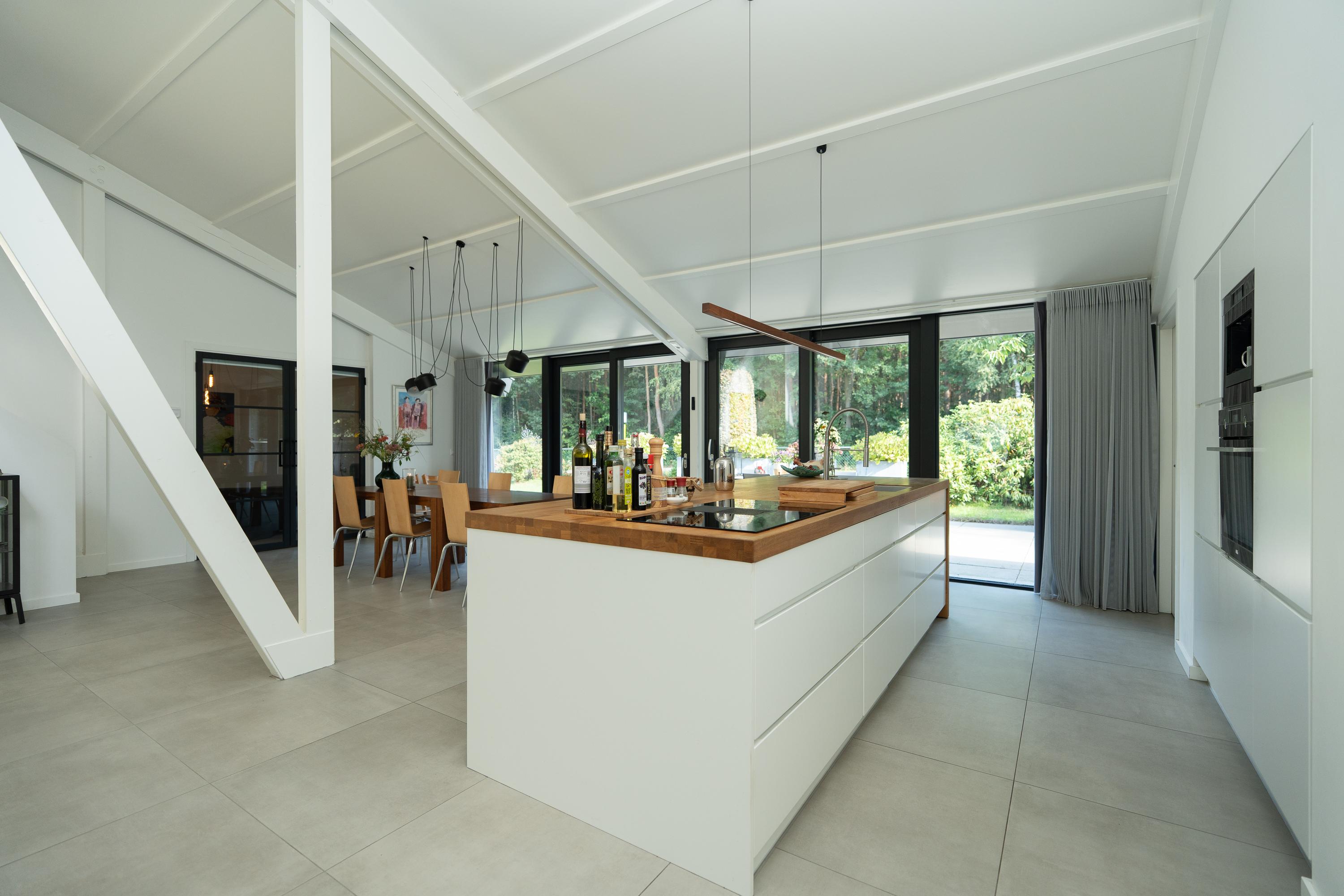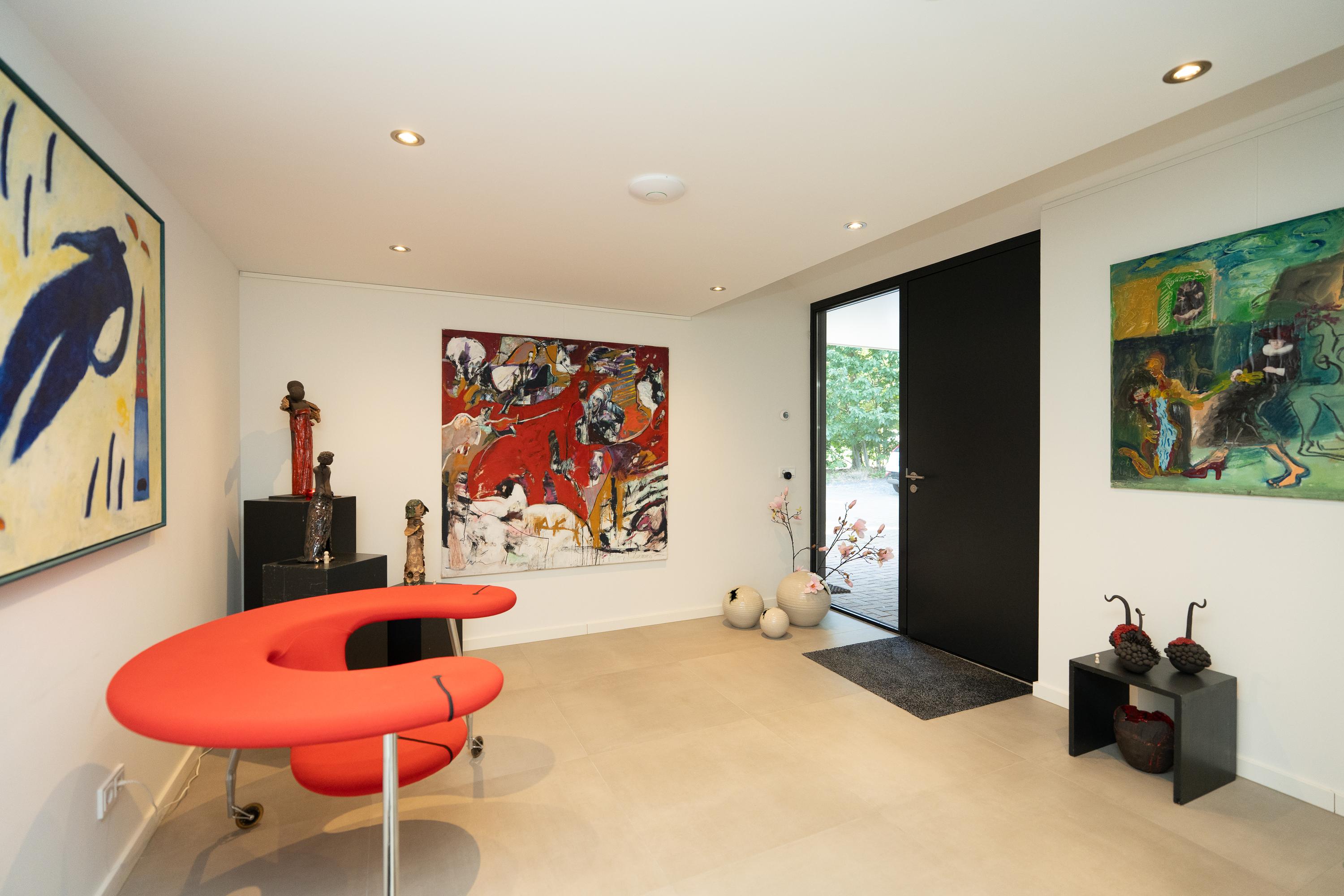 Entree, royale hal die gelijk het ruimtelijke karakter van de woning benadrukt. In de hal bevinden zich de meterkast, vliering en het eerste toilet met fonteintje. Een ruime woonkamer met hoge nok, waar de vele ramen aan alle zijden zorgen voor een prachtige lichtinval en een open sfeer. Zowel aan de voor- als achterzijde zijn er schuifpuien naar de voor- en achtertuin. Verder is er nog een ruime inpandige berging onder de trap en de trapopgang zelf is fraai weggewerkt. Moderne open keuken met een groot kookeiland. De hoge kasten zijn fraai weggewerkt in de muur en de keuken is voorzien van diverse luxe inbouwapparatuur. De bijkeuken is gesitueerd aan de voorzijde van de woning en heeft een keukenblok, opstelling van de warmtepomp en boiler en een extra buitendeur.