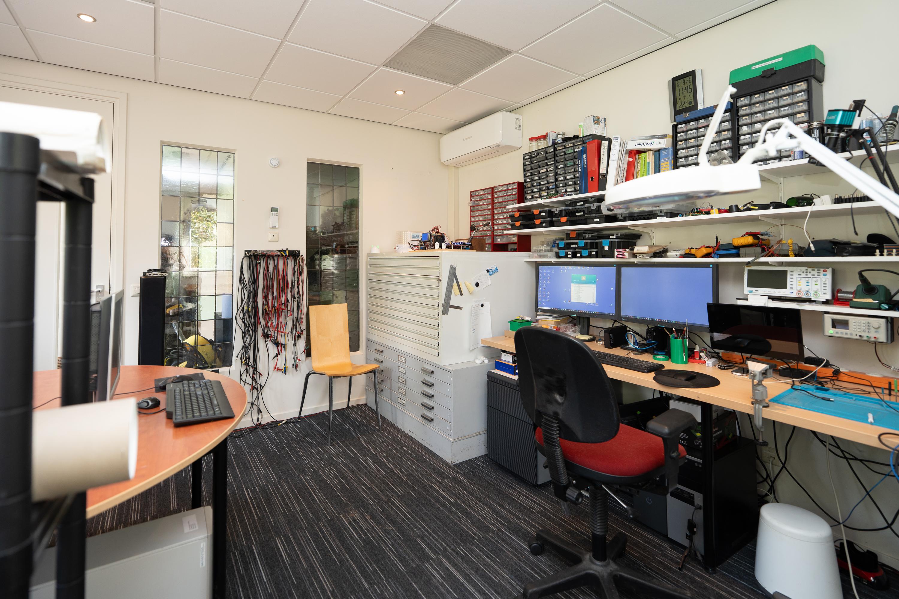 Verder is er nog een aangrenzende kantoorruimte met diverse ethernetaansluitingen, welke nu in gebruik is als hobbyruimte. Deze kantoorruimte heeft een eigen toegang en oprit aan de achterzijde van het geheel. Vanuit de hal is er toegang tot de keuken en het toilet. Er is tevens een eigen meterkast.